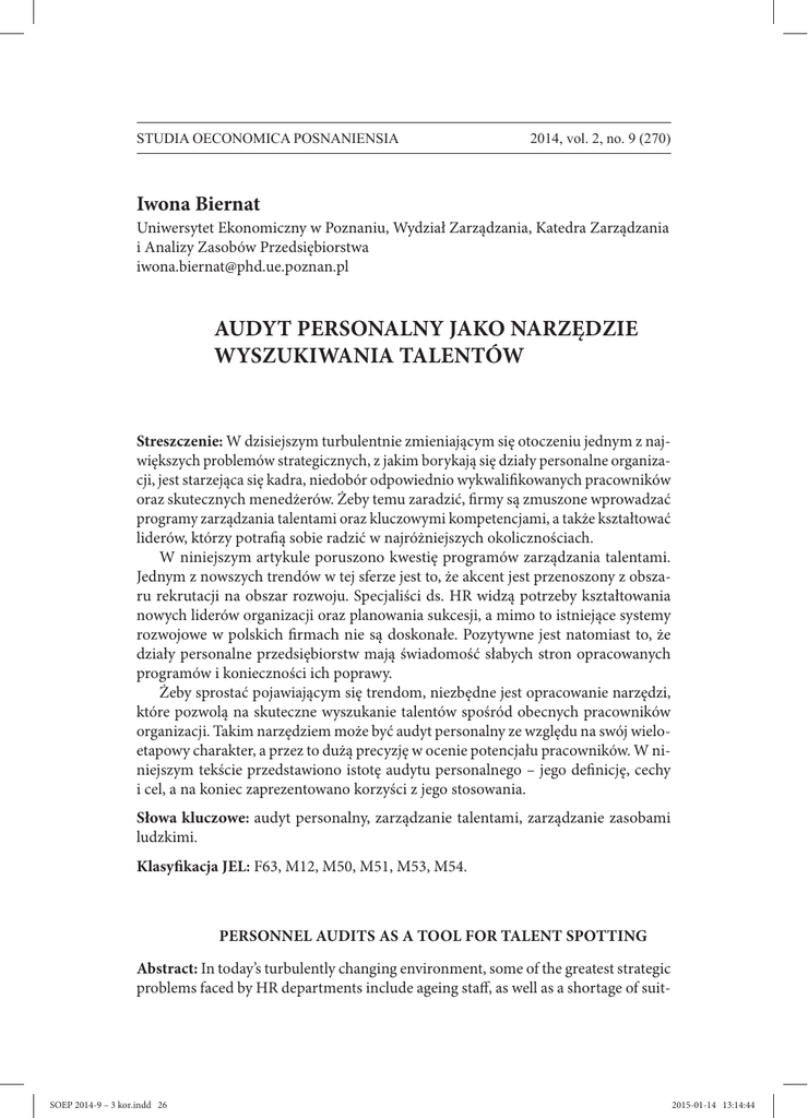 STUDIA OECONOMICA POSNANIENSIA 2014, vol. 2, no. 9 (270) Iwona Biernat Uniwersytet Ekonomiczny w Poznaniu, Wydział Zarządzania, Katedra Zarządzania i Analizy Zasobów Przedsiębiorstwa [email protected] AUDYT PERSONALNY JAKO NARZĘDZIE WYSZUKIWANIA TALENTÓW Streszczenie: W dzisiejszym turbulentnie zmieniającym się otoczeniu jednym z największych problemów strategicznych, z jakim borykają się działy personalne organizacji, jest starzejąca się kadra, niedobór odpowiednio wykwalifikowanych pracowników oraz skutecznych menedżerów. Żeby temu zaradzić, firmy są zmuszone wprowadzać programy zarządzania talentami oraz kluczowymi kompetencjami, a także kształtować liderów, którzy potrafią sobie radzić w najróżniejszych okolicznościach. W niniejszym artykule poruszono kwestię programów zarządzania talentami. Jednym z nowszych trendów w tej sferze jest to, że akcent jest przenoszony z obszaru rekrutacji na obszar rozwoju. Specjaliści ds. HR widzą potrzeby kształtowania nowych liderów organizacji oraz planowania sukcesji, a mimo to istniejące systemy rozwojowe w polskich firmach nie są doskonałe. Pozytywne jest natomiast to, że działy personalne przedsiębiorstw mają świadomość słabych stron opracowanych programów i konieczności ich poprawy. Żeby sprostać pojawiającym się trendom, niezbędne jest opracowanie narzędzi, które pozwolą na skuteczne wyszukanie talentów spośród obecnych pracowników organizacji. Takim narzędziem może być audyt personalny ze względu na swój wieloetapowy charakter, a przez to dużą precyzję w ocenie potencjału pracowników. W niniejszym tekście przedstawiono istotę audytu personalnego – jego definicję, cechy i cel, a na koniec zaprezentowano korzyści z jego stosowania. Słowa kluczowe: audyt personalny, zarządzanie talentami, zarządzanie zasobami ludzkimi. Klasyfikacja JEL: F63, M12, M50, M51, M53, M54. PERSONNEL AUDITS AS A TOOL FOR TALENT SPOTTING Abstract: In today’s turbulently changing environment, some of the greatest strategic problems faced by HR departments include ageing staff, as well as a shortage of suit- SOEP 2014-9 – 3 kor.indd 26 2015-01-14 13:14:44 Audyt personalny jako narzędzie wyszukiwania talentów 27 ably qualified employees and effective managers. To remedy this, companies must implement management programmes for developing talent and leadership. This article addresses the issues of talent management programmes. The latest trend in this area is that the focus has moved from the area of recruitment to the area of development. HR professionals see the need for developing new leaders but the development systems used in Polish companies are not sufficient. However, on the positive side, HR departments in companies are aware of the weaknesses in existing programmes and the need to improve them. To address such emerging trends it is necessary to develop tools that will permit an effective search for talent among current employees. The author suggests that personnel audits can be such a tool because of their multistage character, and therefore their high precision in the assessment of employee potential. This text presents the essence of personnel audits – their definition, characteristics and purpose, and finally the benefits of their use. Keywords: personnel audits, talent management, human resources management. Wstęp Nieustannie zmieniające się otoczenie ma wpływ na przedsiębiorstwa, które są zmuszone dostosować się do tych zmian, gdyż w przeciwnym razie musiałyby zrezygnować ze swojej działalności. Nie od dziś wiadomo, że najtrudniejszymi do odtworzenia zasobami – niezależnie od tego, czy sektorem działania organizacji jest sektor publiczny, prywatny, czy też non profit – są te, które tkwią w ludziach. Bez kompetentnych i rozwijających się kadr większość przedsiębiorstw nie przetrwałaby długo na rynku, nie mówiąc już o zdobywaniu przewagi konkurencyjnej. Z tego względu, że system gospodarczy nieustannie się zmienia i przybiera postać gospodarki opartej na wiedzy, by zapewnić przedsiębiorstwu konkurencyjność, niezbędne jest doskonalenie nie tylko tradycyjnych kluczowych czynników sukcesu, jak produktywność czy koszty pracy, ale również rozwijanie kreatywności i zarządzanie ryzykiem w sferze funkcji personalnej, a przede wszystkim pozyskanie talentów i utrzymanie ich w organizacji [Stabryła 2008, s. 5]. W artykule poruszono temat programów zarządzania talentami, które stają się istotnym elementem działań z zakresu HRM, ponieważ coraz częściej w organizacjach akcent przenoszony jest z obszaru rekrutacji na obszar rozwoju. Chociaż działy personalne dostrzegają potrzeby kształtowania nowych liderów organizacji oraz planowania sukcesji, to obecnie stosowane w polskich firmach systemy rozwojowe nie są doskonałe. Pozytywną kwestią pozostaje SOEP 2014-9 – 3 kor.indd 27 2015-01-14 13:14:44 28 Iwona Biernat fakt, że specjaliści ds. HR zdają sobie sprawę z mankamentów opracowanych narzędzi i konieczności ich poprawy. Żeby sprostać pojawiającym się trendom i efektywnie wyszukać utalentowanych pracowników spośród zatrudnionych kadr, niezbędne jest opracowanie w tym celu specjalnych narzędzi, dopasowanych do potrzeb organizacji. Takim narzędziem może być audyt personalny, który charakteryzuje się dużą precyzją w ocenie potencjału pracowników, dzięki wieloetapowym badaniom i analizie. W niniejszym tekście przedstawiono istotę audytu personalnego – jego definicję, cechy i cel, a na koniec zaprezentowano korzyści z jego stosowania w kontekście zarządzania talentami. Celem artykułu jest pokazanie, że audyt personalny jest skutecznym narzędziem wyszukiwania talentów wśród obecnych członków organizacji. W dobie problemów z pozyskaniem wykwalifikowanych kadr z otoczenia przedsiębiorstwa audyt personalny pozwala zidentyfikować najbardziej wartościowych, z punktu widzenia