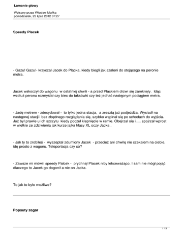 Łamanie głowy Wpisany przez Wiesław Mańka poniedziałek, 23 lipca 2012 07:27 Speedy Placek - Gazu! Gazu!- krzyczał Jacek do Placka, kiedy biegli jak szaleni do stojącego na peronie metra. Jacek wskoczył do wagonu w ostatniej chwili - a przed Plackiem drzwi się zamknęły. Idąc wzdłuż peronu rozmyślał czy biec do taksówki czy też jechać następnym pociągiem metra. - Jadę metrem - zdecydował - to tylko jedna stacja, a zresztą już podjeżdża. Wysiadł na następnej stacji i bez zbędnego rozglądania się, szybko wspinał się po schodach do wyjścia. Już był prawie u ich szczytu kiedy poczuł klepnięcie w ramie. Obejrzał się i..... spojrzał wprost w wielkie ze zdziwienia jak kurze jajka klasy XL oczy Jacka . - Jak ty to zrobiłeś - wyszeptał zdumiony Jacek - przecież ani chwilę nie czekałem na ciebie, idę prosto z wagonu. Teleportacja czy co? - Zawsze mi mówili speedy Palcek - prychnął Placek niby lekceważąco. I sam nie mógł pojąć dlaczego to Jacek go dogonił a nie on Jacka. To jak to było możliwe? Popsuty zegar 1/3 Łamanie głowy Wpisany przez Wiesław Mańka poniedziałek, 23 lipca 2012 07:27 Usiłowałem naprawić zegar. Teraz mała wskazówka działa doskonale, ale wskazówka minutowa przesuwa się w przeciwnym kierunku, ze stałą prędkością, mijając małą wskazówkę co 80 minut. Pytanie: Jeśli o 6:30 mój zegar pokazuje prawidłową godzinę, to kiedy znów to zrobi? Szczupak Rybak złowił szczupaka. Na pytanie, jak wielka jest zdobycz, odpowiedział zagadkowo jakby chciał wybadać inteligencję pytającego: "Łeb szczupaka mierzy 12 cm, tułów ma długość taką jak łeb i ogon razem, przy czym trzy czwarte ogona mierzą tyle ile łeb i czwarta część głowy". Pytanie: Jak duży był szczupak? Pompous IV Żył kiedyś w Bolonii (Włochy) król imieniem Pompous IV, który śmiertelnie nienawidził swego poprzednika Pompousa III. Postanowił on nawet usunąć cyfrę 3 na terytorium swego państwa. Tak więc liczbą następującą po 2 było od razu 4; kolejną liczbą po 29 Było 40 itd. Pytanie: Jaki numer w Bolonii odpowiadał naszemu 33? Odpowiedzi: Popsuty zegar - o 7:06 Szczupak - 2/3 Łamanie głowy Wpisany przez Wiesław Mańka poniedziałek, 23 lipca 2012 07:27 Ogon szczupaka mierzy: 12cm (łeb) + 3cm (1/4 łba) - 1/4 ogona. Stąd 3/4 ogona = 15cm. Cały ogon mierzył 20cm. Tułów mierzy 32cm. Cały szczupak ma 64cm długości. Niczego sobie sztuka! Pompous IV Najprościej zorientować się w sposób następujący: Nasze liczby: 1,2,3,4,5,6,7,8,9,10 Pompousa: 1,2,4,5,6,7,8,9,10,11 Nasze liczby: 11,12,13,14,15,16,17,18,19,20,21,22 Pompousa: 12 14 15 16 17 18 19 20 21 22 24 25 Nasze liczby: 23 24 25 26 27 28 29 30 31 32 33 34 Pompousa: 26 27 28 29 40 41 42 44 45 46 47 3/3