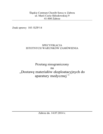 Śląskie Centrum Chorób Serca w Zabrzu ul. Marii Curie-Skłodowskiej 9 41-800 Zabrze Znak sprawy 103 /EZP/14 SPECYFIKACJA ISTOTNYCH WARUNKÓW ZAMÓWIENIA Przetarg nieograniczony na „Dostawę materiałów eksploatacyjnych do aparatury medycznej ” Zabrze dn. 14.07.2014 r. Śląskie Centrum Chorób Serca w Zabrzu ul. Marii Curie-Skłodowskiej 9 41-800 Zabrze SPECYFIKACJA ISTOTNYCH WARUNKÓW ZAMÓWIENIA Przetarg nieograniczony na „Dostawę materiałów eksploatacyjnych do aparatury medycznej ” Spis treści : Rozdział 1 Rozdział 2 Rozdział 3 Rozdział 4 Rozdział 5 Rozdział 6 Rozdział 7 Rozdział 8 Rozdział 9 Rozdział 10 Rozdział 11 Rozdział 12 Rozdział 13 Rozdział 14 Rozdział 15 Zamawiający Opis przedmiotu Zamówienia Opis sposobu przygotowania oferty Opis sposobu obliczania ceny oferty Wymagania Zamawiającego Dokumenty wymagane od Wykonawców Kryteria oceny Termin realizacji zamówienia Składanie ofert Tryb udzielania wyjaśnień Termin związania ofertą Otwarcie ofert Osoby upoważnione do kontaktów z Wykonawcami Zagadnienia dotyczące umowy Środki odwoławcze Załączniki ( 1 – 6) - załącznik nr 1 formularz oferty załącznik nr 2 oświadczenie zgodne z wymogami art. 22 ustawy pzp załącznik nr 3 oświadczenie zgodne z wymogami art. 24 ustawy pzp załącznik nr 4 projekt umowy załącznik nr 5 formularz cenowy załącznik nr 6 Pakiety 2 I. ZAMAWIAJĄCY Śląskie Centrum Chorób Serca w Zabrzu ul. Marii Curie-Skłodowskiej 9 , 41-800 Zabrze Tel. / Fax . 032/ 373-36-68 Strona internetowa : www.sccs.pl Adres e-mail do kontaktów z Zamawiającym : [email protected] II. OPIS PRZEDMIOTU ZAMÓWIENIA 1. 2. 3. Przedmiot zamówienia obejmuje materiałów eksploatacyjnych do aparatury medycznej zawartych w Pakietach od nr 1 do nr 5 . CPV 33.14.00.00-3. Wykluczamy możliwość składania ofert wariantowych . III. OPIS SPOSOBU PRZYGOTOWANIA OFERTY 1. Aby oferta mogła brać udział w ocenie powinna spełniać wymogi ustawy prawo zamówień publicznych i niniejszej specyfikacji. Oferta składana przez wykonawcę winna być sporządzona w języku polskim. Ofertę stanowią załączniki : nr 1 , nr 5 i nr 6 oraz inne oświadczenia woli podpisane przez Wykonawcę. W załączniku nr 2 – oświadczenie art.22 ust.1 ustawy Pzp Wykonawca może polegać na własnej wiedzy , doświadczeniu , potencjale technicznym, osobach zdolnych do wykonania zamówienia i zdolnościach finansowych może też polegać na wiedzy i doświadczeniu, potencjale technicznym, osobach zdolnych do wykonania zamówienia lub zdolnościach finansowych innych podmiotów, niezależnie od charakteru prawnego łączących go z nimi stosunków. Wykonawca w takiej sytuacji zobowiązany jest udowodnić zamawiającemu, iż będzie dysponował zasobami niezbędnymi do realizacji zamówienia, w szczególności przedstawiając w tym celu pisemne zobowiązanie tych podmiotów do oddania mu do dyspozycji niezbędnych zasobów na okres korzystania z nich przy wykonaniu zamówienia. Wykonawca winien spełniać wszystkie warunki wymagane w punkcie V. Oferta winna być podpisana przez osobę upełnomocnioną do reprezentowania firmy, co musi wynikać z załączonych do oferty dokumentów. Wszystkie kartki Oferty winny być połączone w sposób trwały uniemożliwiający ich wysunięcie się ,ponumerowane a każda kartka podpisana /zgodnie z pkt.6/. 2. 3. 4. 5. 6. 7. 3 8. 9. 10. 11. 12. 13. 14. 15. Wszelkie poprawki lub zmiany w ofercie winny być podpisane własnoręcznie przez osobę podpisującą ofertę /zgodnie z pkt.6/. Zamawiający poprawia oczywiste omyłki rachunkowe , z uwzględnieniem konsekwencji rachunkowych dokonanych poprawek . Przez oczywiste omyłki rachunkowe Zamawiający rozumie - wadliwy wynik działania arytmetycznego przy założeniu ,że właściwie podana jest liczba jednostek miar i cena jednostkowa netto. Jeżeli cena oferty lub części zamówienia (Pakiet ) podano rozbieżnie słownie i liczbą lub podano różne ceny w różnych częściach oferty, przyjmuje się, że prawidłowo podano ten zapis, który odpowiada dokonanemu obliczeniu ceny . Każdy wykonawca może złożyć tylko jedną ofertę . Wykonawca nie może złożyć kilku alternatywnych Ofert . Nie dopuszcza się składania ofert wariantowych. Ofertę należy umieścić w kopercie zamkniętej w sposób gwarantujący zachowanie w poufności jej treści. Koperta ma być zaadresowana na : Śląskie Centrum Chorób Serca Zamówienia Publiczne Ul. Marii Curie-Skłodowskiej 9 41-800 Zabrze oraz oznaczona napisem : „ PRZETARG NIEOGRANICZONY NA DOSTAWĘ MATERIAŁÓW EKSPLOATACYJNYCH DO APARATURY MEDYCZNEJ ” 16. Koperta musi być również opisana nazwą i adresem wykonawcy. 17. Zamawiający odrzuca ofertę, jeżeli: 1) jest niezgodna z ustawą; 2) jej treść nie odpowiada treści specyfikacji istotnych warunków zamówienia ( z zastrzeżeniem art. 87 ust.2 pkt3 ustawy Prawo zamówień publicznych ) ; 3) jej złożenie stanowi czyn nieuczciwej konkurencji w rozumieniu przepisów o zwalczaniu nieuczciwej konkurencji; 4) zawiera rażąco niską cenę w stosunku do przedmiotu zamówienia; 5) została złożona przez wykonawcę wykluczonego z udziału w postępowaniu o udzielenie zamówienia lub nie zaproszonego do składania ofert; 4 6) zawiera błędy w obliczeniu ceny; 7) Wykonawca w terminie 3 dni od dnia otrzymania zawiadomienia nie zgodził się na poprawienie omyłki o której mowa w art. 87 ust.2 pkt3 . ustawy Prawo zamówień publicznych; 8) jest nieważna na podstawie odrębnych przepisów. 9) Wykonawca nie złożył wyjaśnień wraz z dowodami że oferta nie zawiera rażąco niskiej ceny , 18. Z postępowania o udzielenie zamówienia wyklucza się: 1) wykonawców, którzy wyrządzili szkodę, nie wykonując zamówienia lub wykonując je nienależycie, lub zostali zobowiązani do zapłaty kary umownej, jeżeli szkoda ta lub obowiązek zapłaty kary umownej wynosiły nie mniej niż 5% wartości realizowanego zamówienia i zostały