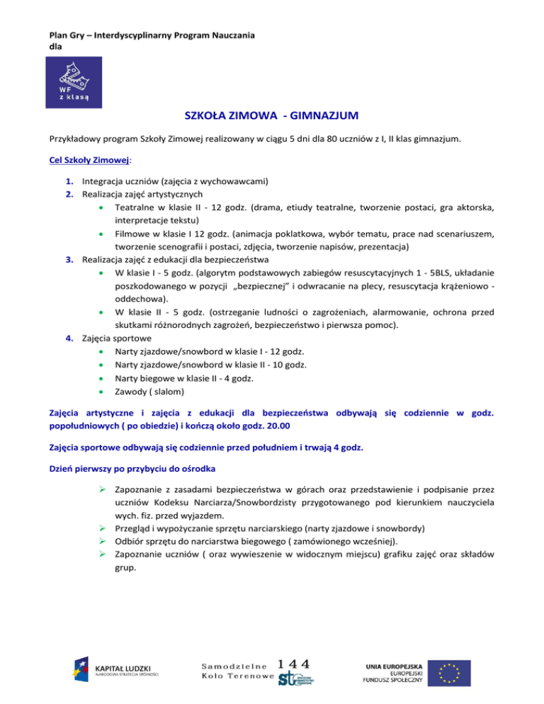 Plan Gry – Interdyscyplinarny Program Nauczania dla SZKOŁA ZIMOWA - GIMNAZJUM Przykładowy program Szkoły Zimowej realizowany w ciągu 5 dni dla 80 uczniów z I, II klas gimnazjum. Cel Szkoły Zimowej: 1. Integracja uczniów (zajęcia z wychowawcami) 2. Realizacja zajęć artystycznych Teatralne w klasie II - 12 godz. (drama, etiudy teatralne, tworzenie postaci, gra aktorska, interpretacje tekstu) Filmowe w klasie I 12 godz. (animacja poklatkowa, wybór tematu, prace nad scenariuszem, tworzenie scenografii i postaci, zdjęcia, tworzenie napisów, prezentacja) 3. Realizacja zajęć z edukacji dla bezpieczeństwa W klasie I - 5 godz. (algorytm podstawowych zabiegów resuscytacyjnych 1 - 5BLS, układanie poszkodowanego w pozycji „bezpiecznej” i odwracanie na plecy, resuscytacja krążeniowo oddechowa). W klasie II - 5 godz. (ostrzeganie ludności o zagrożeniach, alarmowanie, ochrona przed skutkami różnorodnych zagrożeń, bezpieczeństwo i pierwsza pomoc). 4. Zajęcia sportowe Narty zjazdowe/snowbord w klasie I - 12 godz. Narty zjazdowe/snowbord w klasie II - 10 godz. Narty biegowe w klasie II - 4 godz. Zawody ( slalom) Zajęcia artystyczne i zajęcia z edukacji dla bezpieczeństwa odbywają się codziennie w godz. popołudniowych ( po obiedzie) i kończą około godz. 20.00 Zajęcia sportowe odbywają się codziennie przed południem i trwają 4 godz. Dzień pierwszy po przybyciu do ośrodka Zapoznanie z zasadami bezpieczeństwa w górach oraz przedstawienie i podpisanie przez uczniów Kodeksu Narciarza/Snowbordzisty przygotowanego pod kierunkiem nauczyciela wych. fiz. przed wyjazdem. Przegląd i wypożyczanie sprzętu narciarskiego (narty zjazdowe i snowbordy) Odbiór sprzętu do narciarstwa biegowego ( zamówionego wcześniej). Zapoznanie uczniów ( oraz wywieszenie w widocznym miejscu) grafiku zajęć oraz składów grup. Plan Gry – Interdyscyplinarny Program Nauczania dla Dzień drugi Sprawdzian umiejętności narciarskich uczniów klas I ( podział na grupy ćwiczebne). A. Snowboard - gr. początkująca - nauka z instruktorem ( 2 godz.), potem ćwiczą pod okiem opiekunów. B. Narty zjazdowe - gr. początkująca nauka z instruktorem (2 godz.), potem ćwiczą pod okiem opiekunów. C. Pozostali uczniowie z klas I,II - doskonalą swoje umiejętności pod okiem instruktorów, nauczycieli, opiekunów. D. Klasy II - 1 godz. -narty biegowe ( w grupach 10 osobowych, zmiana grup co godzinę) Nauczyciele, instruktorzy, opiekunowie wypełniają kartę oceny ucznia. Dzień trzeci Początkujący uczniowie - 2 godz. z instruktorem jak wyżej. Zaawansowani uczniowie - 3, 4 godz. ćwiczeń i doskonalenie techniki jazdy na nartach i snowboardzie. Uczniowie klas II - 1 godz. - nauki nart biegowych z instruktorem + 3 godz. doskonalenie techniki jazdy na nartach i snowboardzie. Nauczyciele, instruktorzy, opiekunowie wypełniają kartę oceny ucznia. Przygotowanie sprawdzianu ( narty biegowe) i zawodów ( slalom) przez instruktorów i nauczycieli. Nauczyciele, instruktorzy, opiekunowie wypełniają kartę oceny ucznia. Dzień czwarty Ustawienie slalomu w wyznaczonym miejscu na stoku, zabezpieczenie opieki GOPRu podczas zawodów, sędziów i obsługi technicznej. Klasy I i II - 2- krotny zjazd slalomem na czas. Początkujący narciarze i snowbordziści - zjazd bez mierzenia czasu - ocena umiejętności. Klasy II - bieg na nartach na dystansie około 600m ( umiejętności techniczne + czas) Nauczyciele, instruktorzy, opiekunowie wypełniają kartę oceny ucznia. Dzień piąty Podsumowanie zawodów. Ogłoszenie wyników zawodów. Wręczenie dyplomów dla najlepszych zawodników. Prezentacje etiud teatralnych i filmów animowanych. Plan Gry – Interdyscyplinarny Program Nauczania dla Wskazówki dla organizatorów Szkoły Zimowej 1. Wybór ośrodka spełniającego warunki do realizacji programu Z odpowiedną ilością i wielkością sal do prowadzenia zajęć artystycznych i edukacji dla bezpieczeństwa Położenie ośrodka w pobliżu stoku narciarskiego oraz możliwość wytyczenia trasy biegowej Możliwość wypożyczenia sprzętu narciarskiego (narty zjazdowe, biegowe, snowbord) Zabezpieczenie odpowiedniej ilości kadry instruktorskiej (instruktorów narciarstwa zjazdowego, biegowego, snowbordu) Zabezpieczenie sprzętu do przeprowadzenia zawodów narciarskich ( tyczki slalomowe). Przykładowy harmonogram zajęć podczas Szkoły Zimowej dla klas I i II 9.00 - 11.15 11.30 -13.45 15.30 -16.30 niedziela 16.45 - 17.45 20.00 - 21.00 Spotkanie z dyr.. 18.45 - 19.45 Spotkanie z prowadzącymi zajęcia podział na grupy 5.02 poniedziałek 1A1 1A2 1A1 1A2 1A1 1A2 1A1 1A2 1A1 1A2 1A1 1A2 6.02 1B1 1B2 1B1 1B2 1B1 1B2 1B1 1B2 1B1 1B2 1B1 1B2 wtorek 1A1 1A2 1A1 1A2 1A1 1A2 1A1 1A2 1A1 1A2 1A1 7.02 1B1 1B2 1B1 1B2 1B1 1B2 1B1 1B2 1B1 1B2 środa 1A1 1A2 1A1 1A2 1A1 1A2 1A1 1A2 1A1 1A2 8.02 1B1 1B2 1B1 1B2 1B1 1B2 1B1 1B2 1B1 1B2 czwartek 1A1 1A2 1A1 1A2 1A1 1A2 1A1 1A2 1A1 1A2 9.02 1B1 1B2 Prezentacje filmowe 1B1 1B2 1B1 1B2 1B1 1B2 1B1 1B2 piątek 10.02 narty/snowbord edukacja dla bezp. film zajęcia z wych. 1A1 Plan Gry – Interdyscyplinarny Program Nauczania dla 9.00 - 10.00 10.15 - 11.15 11.30 -12.30 12.45 - 13.45 15.30 - 16.30 16.45 - 17.45 18.45 - 19.45 poniedziałek 2A1 6.02 2B1 wtorek 7.02 środa 8.02 czwartek 9.02 piątek 10.02 spotkanie z prowadzącymi zajęcia podział na grupy spotkanie z p. dyrektor niedziela 5.02 20.00 - 21.00 2A2 2A1 2A2 2A1 2A2 2A1 2A2 2A1 2A2 2A1 2A2 2A1 2A2 2A1 2A2 2B2 2B1 2B2 2B1 2B2 2B1 2B2 2B1 2B2 2B1 2B2 2B1 2B2 2B1 2B2 2A1 2A2 2A1 2A2 2A1 2A2 2A1 2A2 2A1 2A2 2A1 2A2 2A1 2A2 2A1 2A2 2B1 2B2 2B1 2B2 2B1 2B2 2B1 2B2 2B1 2B2 2B1 2B2 2B1 2B2 2B1 2B2 2A1 2A2 2A1 2A2 2A1 2A2 2A1 2A2 2A1 2A2 2A1 2A2 2A1 2A2 2A1 2A2 2B1 2B2 2B1 2B2 2B1 2B2 2B1 2B2 2B1 2B2 2B1 2B2 2B1 2B2 2B1 2B2 2A1 2A2 2A1 2A2 2A1 2A2 2A1 2A2 2A1 2A2 2A1 2A2 2A1 2A2 2A1 2A2 2B1 2B2 2B1 2B2 2B1 2B2 2B2 2B1 2B1 2B2 2B1 2B2 2B1 2B2 2B1 2B2 prezentacje teatralne i filmowe biegówki edukacja dla bezpieczeństwa teat