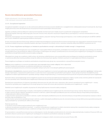 Roczne skonsolidowane sprawozdanie finansowe Polityka rachunkowości i inne informacje objaśniające 2. Opis ważniejszych stosowanych zasad rachunkowości (17/17) 2.2.31. Zar ządzanie k apit ał em Zarządzanie kapitałem w Grupie ma na celu zachowanie zdolności do kontynuowania działalności z uwzględnieniem realizacji planowanych inwestycji tak, aby Grupa mogła generować zwrot dla akcjonariuszy oraz przynosić korzyści pozostałym interesariuszom. Zgodnie z praktyką rynkową efektywne wykorzystanie kapitału monitorowane jest między innymi na podstawie następujących wskaźników: Wskaźnika kapitału własnego obliczanego jako stosunek wartości netto aktywów rzeczowych (kapitał własny pomniejszony o wartości niematerialne) do sumy bilansowej; Wskaźnika stanowiącego stosunek zobowiązań z tytułu kredytów, pożyczek i leasingu finansowego pomniejszony o stan środków pieniężnych do EBITDA. EBITDA jest to zysk z działalności operacyjnej po dodaniu amortyzacji. W celu utrzymania płynności finansowej i zdolności kredytowej pozwalającej na pozyskanie finansowania zewnętrznego przy optymalnym poziomie kosztów Grupa Kapitałowa zakłada utrzymanie wskaźnika kapitału własnego na poziomie nie niższym niż 0,5, natomiast wskaźnika dług netto/EBITDA na poziomie do 2,0. 2.2.32. P r awa maj ąt k owe wy nik aj ące ze ś wiadect w pochodzenia ener gii z odnawialny ch źr ódeł ener gii i z k ogener acj i Na mocy ustawy Prawo Energetyczne oraz szczegółowych rozporządzeń Ministra Gospodarki, przedsiębiorstwa energetyczne zajmujące się produkcją oraz obrotem energią elektryczną i jej sprzedażą do odbiorcy końcowego są zobowiązane do zakupu i przedstawienia do umorzenia praw majątkowych wynikających ze świadectw pochodzenia energii kolorowej lub uiszczenia opłaty zastępczej. Obowiązek ten uznaje się za spełniony, jeżeli za dany rok obrotowy udział ilościowy sumy energii elektrycznej wynikającej ze świadectw pochodzenia energii w wykonanej całkowitej rocznej sprzedaży energii do odbiorców końcowych jest zgodny z limitami zawartymi w rozporządzeniach Ministra Gospodarki. Prawa majątkowe wynikające ze świadectw pochodzenia energii kolorowej ujmuje się w sprawozdaniu z sytuacji finansowej jako towary. Naby t e prawa majątkowe na moment początkowego ujęcia wy cenia s ię w cenie naby cia , która odpowiada: wartości świadectwa pochodzenia na podstawie aktualnej ceny rynkowej, lub wysokości wynegocjowanej ceny umownej w przypadku zakupu tych praw w transakcjach giełdowych pozasesyjnych. O t r zy mane nieodpł at nie , przyznane przez Prezesa URE, prawa majątkowe na moment początkowego ujęcia wy cenia s ię w war t oś ci godziwej i traktuje, jako dotacje niepieniężne, rozpoznawane jednorazowo w zysku lub stracie w pozostałych przychodach operacyjnych. Grupa ujmuje otrzymane nieodpłatnie prawa majątkowe na dzień wyprodukowania i sprzedaży danego rodzaju energii kolorowej, tj. w momencie powstania prawa do otrzymania odnośnych praw majątkowych. Na koniec okresu sprawozdawczego prawa majątkowe wycenia się wg wartości początkowej pomniejszonej o odpisy z tytułu utraty wartości, jednak nie wyższej niż ich cena sprzedaży netto. Rozchodu praw majątkowych dokonuje się wg średniej ważonej kosztu składnika majątku. Rozchód praw spowodowany ich zbyciem (sprzedażą) odnoszony jest do zysku lub straty i ujmowany, jako wartość sprzedanych praw majątkowych – towary. Przychód ze sprzedaży praw majątkowych do energii ujmuje się w zysku lub stracie, jako przychód ze sprzedaży praw majątkowych – towary. Niedobór praw majątkowych uzupełnia się poprzez ich zakup bądź poprzez uiszczenie opłaty zastępczej. Na koniec okresu sprawozdawczego w związku z obowiązkiem przedłożenia praw majątkowych do umorzenia Grupa tworzy rezerwę. Rezerwa tworzona jest: w ciężar wartości (kosztu nabycia) sprzedanych towarów w zakresie, w jakim obowiązek przedłożenia praw do umorzenia dotyczy energii elektrycznej kupionej i odsprzedanej do odbiorcy końcowego, w ciężar kosztów wytworzenia produktów w zakresie, w jakim obowiązek przedłożenia praw do umorzenia dotyczy energii elektrycznej kupionej i zużytej na własne potrzeby tego przedsiębiorcy, oraz w ciężar kosztu wytworzenia sprzedanej energii w zakresie, w jakim obowiązek przedłożenia praw do umorzenia dotyczy energii elektrycznej wyprodukowanej przez tego przedsiębiorcę i sprzedanej do odbiorcy końcowego. Rezerwę wycenia się: w wysokości wartości bilansowej posiadanych praw majątkowych oraz w zakresie nie pokrytym posiadanymi prawami – w wartości rynkowej praw majątkowych na dzień utworzenia rezerwy lub w wysokości kwoty opłaty zastępczej odpowiadającej ilości sprzedanej energii, w zależności od tego, która z tych wartości jest niższa. W sprawozdaniu z sytuacji finansowej rezerwę na zobowiązanie z tytułu obowiązku przedstawienia do umorzenia odpowiedniej liczby świadectw Prezesowi URE oraz posiadane aktywa w postaci praw majątkowych wynikających ze świadectw pochodzenia wykazuje się odrębnie. Rozliczenie kwoty rezerwy oraz umorzenie praw majątkowych następuje na dzień umorzenia tych praw przez Prezesa URE.