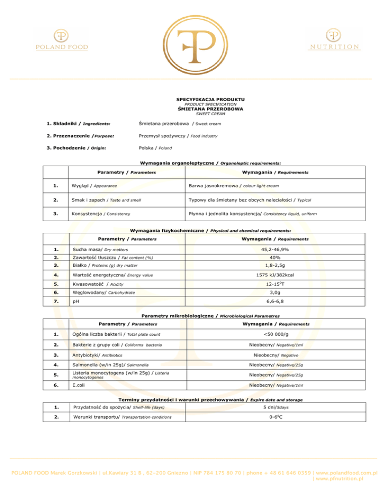 _____________________________________________________________________________________________________________________________ SPECYFIKACJA PRODUKTU PRODUCT SPECIFICATION ŚMIETANA PRZEROBOWA SWEET CREAM 1. Składniki / Ingredients: Śmietana przerobowa / Sweet cream 2. Przeznaczenie /Purpose: Przemysł spożywczy / Food industry 3. Pochodzenie / Origin: Polska / Poland Wymagania organoleptyczne / Organoleptic requirements: Parametry / Parameters Wymagania / Requirements 1. Wygląd / Appearance Barwa jasnokremowa / colour light cream 2. Smak i zapach / Taste and smell Typowy dla śmietany bez obcych naleciałości / Typical 3. Konsystencja / Consistency Płynna i jednolita konsystencja/ Consistency liquid, uniform Wymagania fizykochemiczne / Physical and chemical requirements: Parametry / Parameters 1. Sucha masa/ Dry matters 2. Zawartość tłuszczu / Fat content (%) 3. Białko / Proteins (g) dry matter 4. Wartość energetyczna/ Energy value 5. Kwasowatość / Acidity 6. Węglowodany/ Carbohydrate 7. pH Wymagania / Requirements 45,2-46,9% 40% 1,8-2,5g 1575 kJ/382kcal 12-150T 3,0g 6,6-6,8 Parametry mikrobiologiczne / Microbiological Parametres Parametry / Parameters Wymagania / Requirements 1. Ogólna liczba bakterii / Total plate count <50 000/g 2. Bakterie z grupy coli / Coliforms bacteria Nieobecny/ Negative/1ml 3. Antybiotyki/ Antibiotics 4. Salmonella (w/in 25g)/ Salmonella 5. Nieobecny/ Negative Nieobecny/ Negative/25g Listeria monocytogens (w/in 25g) / Listeria Nieobecny/ Negative/25g monocytogenes 6. E.coli Nieobecny/ Negative/1ml 1. Przydatność do spożycia/ Shelf-life (days) 2. Warunki transportu/ Transportation conditions Terminy przydatności i warunki przechowywania / Expire date and storage 5 dni/5days 0-60C _____________________________________________________________________________________________________________________________________________ POLAND FOOD Marek Gorzkowski | ul.Kawiary 31 B , 62-200 Gniezno | NIP 784 175 80 70 | phone + 48 61 646 0359 | www.polandfood.com.pl | www.pfnutrition.pl