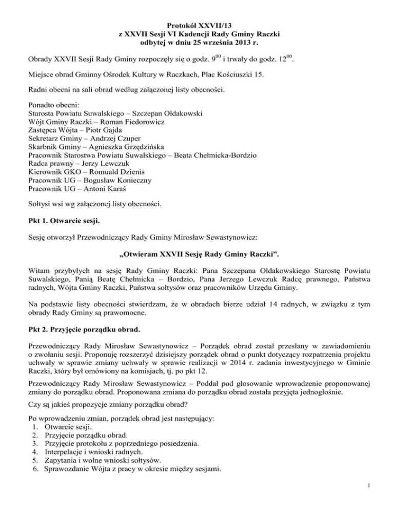 Protokół XXVII/13 z XXVII Sesji VI Kadencji Rady Gminy Raczki odbytej w dniu 25 września 2013 r. Obrady XXVII Sesji Rady Gminy rozpoczęły się o godz. 900 i trwały do godz. 1200. Miejsce obrad Gminny Ośrodek Kultury w Raczkach, Plac Kościuszki 15. Radni obecni na sali obrad według załączonej listy obecności. Ponadto obecni: Starosta Powiatu Suwalskiego – Szczepan Ołdakowski Wójt Gminy Raczki – Roman Fiedorowicz Zastępca Wójta – Piotr Gajda Sekretarz Gminy – Andrzej Czuper Skarbnik Gminy – Agnieszka Grzędzińska Pracownik Starostwa Powiatu Suwalskiego – Beata Chełmicka-Bordzio Radca prawny – Jerzy Lewczuk Kierownik GKO – Romuald Dzienis Pracownik UG – Bogusław Konieczny Pracownik UG – Antoni Karaś Sołtysi wsi wg załączonej listy obecności. Pkt 1. Otwarcie sesji. Sesję otworzył Przewodniczący Rady Gminy Mirosław Sewastynowicz: „Otwieram XXVII Sesję Rady Gminy Raczki”. Witam przybyłych na sesję Rady Gminy Raczki: Pana Szczepana Ołdakowskiego Starostę Powiatu Suwalskiego, Panią Beatę Chełmicka – Bordzio, Pana Jerzego Lewczuk Radcę prawnego, Państwa radnych, Wójta Gminy Raczki, Państwa sołtysów oraz pracowników Urzędu Gminy. Na podstawie listy obecności stwierdzam, że w obradach bierze udział 14 radnych, w związku z tym obrady Rady Gminy są prawomocne. Pkt 2. Przyjęcie porządku obrad. Przewodniczący Rady Mirosław Sewastynowicz – Porządek obrad został przesłany w zawiadomieniu o zwołaniu sesji. Proponuję rozszerzyć dzisiejszy porządek obrad o punkt dotyczący rozpatrzenia projektu uchwały w sprawie zmiany uchwały w sprawie realizacji w 2014 r. zadania inwestycyjnego w Gminie Raczki, który był omówiony na komisjach, tj. po pkt 12. Przewodniczący Rady Mirosław Sewastynowicz – Poddał pod głosowanie wprowadzenie proponowanej zmiany do porządku obrad. Proponowana zmiana do porządku obrad została przyjęta jednogłośnie. Czy są jakieś propozycje zmiany porządku obrad? Po wprowadzeniu zmian, porządek obrad jest następujący: 1. Otwarcie sesji. 2. Przyjęcie porządku obrad. 3. Przyjęcie protokołu z poprzedniego posiedzenia. 4. Interpelacje i wnioski radnych. 5. Zapytania i wolne wnioski sołtysów. 6. Sprawozdanie Wójta z pracy w okresie między sesjami. 1 7. Uchwała w sprawie wyrażenia zgody na realizację projektu „Pacowa Akademia Cultury – renowacja perły polskiego neogotyku w Dowspudzie” (w skrócie PAC w Dowspudzie). 8. Uchwała w sprawie uchwalenia zmiany studium uwarunkowań i kierunków zagospodarowania przestrzennego Gminy Raczki. 9. Uchwała w sprawie wyrażenia opinii dotyczącej uznania lasów na terenie Gminy Raczki za ochronne. 10. Uchwała w sprawie przyjęcia rocznego programu współpracy na 2014 rok Gminy Raczki z organizacjami pozarządowymi oraz innymi podmiotami prowadzącymi działalność pożytku publicznego. 11. Uchwała w sprawie zmiany Wieloletniej Prognozy Finansowej Gminy Raczki na lata 2013-2018. 12. Uchwała w sprawie zmian w budżecie gminy na 2013 rok. 13. Uchwała w sprawie zmiany uchwały w sprawie realizacji w 2014 r. zadania inwestycyjnego w Gminie Raczki. 14. Przedstawienie założeń do projektu budżetu i kierunków polityki społeczno – gospodarczej na 2014 rok. 15. Odpowiedzi na interpelacje i wnioski radnych. 16. Odpowiedzi na zapytania i wolne wnioski sołtysów. Porządek obrad został jednogłośnie przyjęty 14 głosami „za”. Pkt 3. Przyjęcie protokołu z poprzedniego posiedzenia. Przewodniczący Rady Mirosław Sewastynowicz – Informuję, że protokół z XXVI Sesji Rady Gminy wyłożony był do wglądu w Urzędzie Gminy pokój Nr 1. Proponuję przyjęcie protokołu z poprzedniego posiedzenia. Do protokołu nie wniesiono zastrzeżeń. Protokół z poprzedniego posiedzenia został przyjęty przez radnych: 13 głosami „za”, przy 1 głosie „wstrzymującym się”. Pkt 4. Interpelacje i wnioski radnych. Wiceprzewodniczący Rady Stanisław Ostrowski – Chciałbym zapytać, czy będą w roku bieżącym przeznaczone środki pieniężne na szczepionki przeciw grypie dla seniorów? Mam podziękowanie. Pozwólcie Państwo, że przeczytam: „Podziękowanie dla radnych, sołtysów i pracowników Urzędu Gminy w Raczkach za życzliwość i pomoc finansową okazaną w realizacji naszego przedsięwzięcia, którym był ufundowanie pomnika Pani Tekli Józefie Trockiej nauczycielce Szkoły Podstawowej w Raczkach w latach 50 – 60 ubiegłego wieku. Przekonaliśmy się, że istnieją jeszcze ludzie wrażliwi, o wielkich sercach, którzy zauważają potrzeby innych. Dziękujemy w imieniu organizatora przedsięwzięcia”. Podziękowanie przekazuję na ręce Przewodniczącego Rady. Radna Małgorzata Czuper – Wnioskuję o przejazd autobusu PKS przez Raczki do Białegostoku. Dużo osób zgłaszało do mnie taką potrzebę. Istnieje w Suwałkach firma przewozowa „Voyager”, która skłonna byłaby puścić jeden z kursów autobusu przez Raczki, tylko ktoś z Urzędu Gminy musiałby się z nimi skontaktować. Radny Kazimierz Iwanowski – Zwrócił się do mnie mieszkaniec naszej gminy w sprawie śmieci, tj. spóźnił się on ze wpłatą za odbiór śmieci i w związku z tym naliczone zostały mu odsetki, i kieruje następujące pytanie: czy gmina także nalicza odsetki za wpłaconą pierwszą ratę na budowę przydomowych oczyszczalni ścieków, która została wpłacona przez większość mieszkańców jesienią ubiegłego roku? Druga sprawa, chciałbym powiedzieć, że nadal jest u nas bardzo niskie ciśnienie wody. Hydrofornia niedawno została oddana do użytku, ale jej ciśnienie jest gorsze niż przed realizacją tejże inwestycji. Uważam, że nasz Zakład nie jest w stanie ustawić właściwego ciśnienia w sieci, szczególnie na linii w Podwysokim. Radny Witold Wysocki – Chciałbym zgłosić, iż na drodze powiatowej w miejscowości Moczydły są takie dwa miejsca, gdzie należałoby poprawić widoczność drogi, poprzez usun