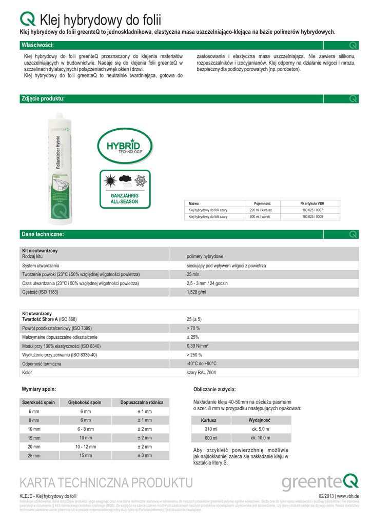 Klej hybrydowy do folii Klej hybrydowy do folii greenteQ to jednoskładnikowa, elastyczna masa uszczelniająco-klejąca na bazie polimerów hybrydowych. Właściwości: Klej hybrydowy do folii greenteQ przeznaczony do klejenia materiałów uszczelniających w budownictwie. Nadaje się do klejenia folii greenteQ w szczelinach dylatacyjnych i połączeniach wnęk okien i drzwi. Klej hybrydowy do folii greenteQ to neutralnie twardniejąca, gotowa do zastosowania i elastyczna masa uszczelniająca. Nie zawiera silikonu, rozpuszczalników i izocyjanianów. Klej odporny na działanie wilgoci i mrozu, bezpieczny dla podłoży porowatych (np. porobeton). Zdjęcie produktu: Nazwa Pojemność Nr artykułu VBH Klej hybrydowy do folii szary 290 ml / kartusz 180.025 / 0007 Klej hybrydowy do folii szary 600 ml / worek 180.025 / 0009 Dane techniczne: Kit nieutwardzony Rodzaj kitu polimery hybrydowe System utwardzania sieciujący pod wpływem wilgoci z powietrza Tworzenie powłoki (23°C i 50% względnej wilgotności powietrza) 25 min. Czas utwardzania (23°C i 50% względnej wilgotności powietrza) 2,5 - 3 mm / 24 godzin Gęstość (ISO 1183) 1,528 g/ml Kit utwardzony Twardość Shore A (ISO 868) 25 (± 5) Powrót poodkształceniowy (ISO 7389) > 70 % Maksymalne dopuszczalne odkształcenie ± 25% Moduł przy 100% elastyczności (ISO 8340) 0,39 N/mm² Wydłużenie przy zerwaniu (ISO 8339-40) > 250 % Odporność termiczna -40°C do +90°C Kolor szary RAL 7004 Wymiary spoin: Szerokość spoin Obliczanie zużycia: Głębokość spoin Dopuszczalna różnica Nakładanie kleju 40-50mm na ościeżu pasmami o szer. 8 mm w przypadku następujących opakowań: 6 mm ± 1 mm 8 mm 6 mm ± 1 mm Kartusz Wydajność 10 mm 6 - 8 mm ± 2 mm 310 ml ok. 5,0 m 15 mm 10 mm ± 2 mm 600 ml ok. 10,0 m 20 mm 10 - 12 mm ± 2 mm 25 mm 15 mm ± 3 mm 6 mm Aby przykleić powierzchnię możliwie jak najdokładniej zaleca się nakładanie kleju w kształcie litery S. KARTA TECHNICZNA PRODUKTU KLEJE - Klej hybrydowy do folii 02/2013 | www.vbh.de Instrukcje użytkowania, dane dotyczące produktu i jego osiągnięć oraz inne dane techniczne stanowią w odniesieniu do naszych produktów greenteQ jedynie ogólne wskazówki. Służą one do tylko opisu właściwości i budowy produktów i nie stanowią gwarancji w rozumieniu § 443 niemieckiego kodeksu cywilnego (BGB). Ze względu na szeroki zakres możliwych zastosowań naszych produktów obowiązkiem użytkownika jest sprawdzenie, czy dany produkt nadaje się do jego celów. Nasze doradztwo techniczne udzielane ustnie, pisemnie lub w postaci przeprowadzonej próby służy tylko do Państwa informacji i jest absolutnie niewiążące. Klej hybrydowy do folii Klej hybrydowy do folii greenteQ to jednoskładnikowa, elastyczna masa uszczelniająco-klejąca na bazie polimerów hybrydowych. Przygotowanie: Podłoże musi być stałe, czyste, pozbawione kurzu i tłuszczu, wolne od luźnych cząsteczek (stabilne), ale nie musi być całkowicie suche. W razie potrzeby powierzchnię należy odtłuścić za pomocą spirytusu lub etanolu. Do powierzchni porowatych należy użyć środka gruntującego (primera). Należy przeprowadzić próby przyczepności. Zaleca się również przeprowadzenie wystarczającej ilości własnych prób w celu sprawdzenia przydatności produktu do planowanego rodzaju zastosowania. Aplikacja: • Klejenie materiałów uszczelniających: Aby prawidłowo połączyć warstwę tynku z folią należy przykleić folię do podłoża możliwie całą powierzchnią; zaleca się nakładanie kleju w kształcie litery S. • Uszczelnienie: Zaleca się oklejanie krawędzi szczelin odpowiednią taśmą klejącą. Klej hybrydowy do folii greenteQ nanieść w taki sposób, aby nie powstawały pęcherzyki powietrza. Dokładnie wypełnić szczeliny. • Na spód płytkiej szczeliny nałożyć taśmę samoprzylepną lub piankową, aby uniknąć przylgnięcia preparatu z trzech stron. Głębokość kleju w szczelinie dylatacyjnej powinna zajmować 2/3 szerokości szczeliny. Zbyt głębokie złączenia należy uzupełnić odpowiednimi pianami wypełniającymi (PU). Do głębokich fug należy zastosować mocną pianę poliuretanową jako wypełnienie podkładowe. W szczelinach podłogowych, które poddawane są dużym obciążeniom mechanicznym, należy nanieść głęboko masę klejącą. Najlepiej zaaplikować środek tak, aby nie przylegał do powierzchni dna szczeliny, lecz do jej krawędzi bocznych. • Po otwarciu kartusza lub worka foliowego z klejem należy zużyć go w ciągu 24 godzin. • Nakładanie kleju: za pomocą pistoletu ręcznego lub pneumatycznego. Forma uszczelnienia jest bardzo ważna. Należy unikać cienkich warstw. Wymagana szerokość fug to min. 6 mm. • Tolerancja powłok malarskich: Można malować większością farb na bazie wody i rozpuszczalników (metodą ,,mokro na mokro’’); po upływie 48 godzin po nałożeniu preparatu - należy oczyścić powierzchnię przed malowaniem. Zaleca się wcześniejsze próby malowania. Farby alkidowe wymagają wydłużonego czasu schnięcia. Ograniczenia: • Nie stosować termicznych, mechanicznych ani chemicznych obciążeń, zanim wulkanizacja całkowicie się nie zakończy. • Nie należy stosować kleju do folii w zamkniętych pomieszczeniach, ponieważ klej do utwardzania potrzebuje wilgoci z powietrza. Właściwa wentylacja jest bardzo ważna podczas stosowania i wulkanizacji kleju. • Nie należy stosować kleju hybrydowego do folii greenteQ do fug stale zanurzonych w wodzie, szczelin w basenach wypełnionych chlorowaną wodą oraz w basenach w zamkniętych pomieszczeniach i basenach krytych, również do szczelin o szerokości lub głębokości poniżej 5mm. Nie stosować kleju do łączenia mas bitumicznych, poliwęglanów i poliakrylanów oraz do klejenia tworzyw takich jak: PE, PP, PA, Teflon®. Temperatura aplikacji: od +5°C do +40°C Możliwości naprawy: Zaleca się stosowanie tego samego materiału. • Tolera