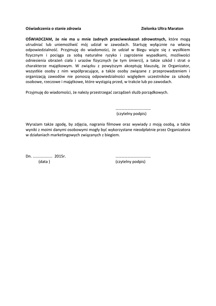 Oświadczenia o stanie zdrowia Zielonka Ultra Maraton OŚWIADCZAM, że nie ma u mnie żadnych przeciwwskazań zdrowotnych, które mogą utrudniać lub uniemożliwić mój udział w zawodach. Startuję wyłącznie na własną odpowiedzialność. Przyjmuję do wiadomości, że udział w Biegu wiąże się z wysiłkiem fizycznym i pociąga za sobą naturalne ryzyko i zagrożenie wypadkami, możliwości odniesienia obrażeń ciała i urazów fizycznych (w tym śmierci), a także szkód i strat o charakterze majątkowym. W związku z powyższym akceptuję klauzulę, że Organizator, wszystkie osoby z nim współpracujące, a także osoby związane z przeprowadzeniem i organizacją zawodów nie ponoszą odpowiedzialności względem uczestników za szkody osobowe, rzeczowe i majątkowe, które wystąpią przed, w trakcie lub po zawodach. Przyjmuję do wiadomości, że należy przestrzegać zarządzeń służb porządkowych. ………………………..…… (czytelny podpis) Wyrażam także zgodę, by zdjęcia, nagrania filmowe oraz wywiady z moją osobą, a także wyniki z moimi danymi osobowymi mogły być wykorzystane nieodpłatnie przez Organizatora w działaniach marketingowych związanych z biegiem. Dn. .................. 2015r. (data ) ………………………..…… (czytelny podpis)