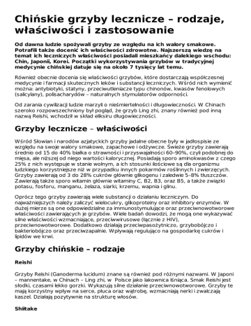 Chińskie grzyby lecznicze – rodzaje, właściwości i zastosowanie Od dawna ludzie spożywali grzyby ze względu na ich walory smakowe. Potrafili także docenić ich właściwości zdrowotne. Najszerszą wiedzę na temat ich leczniczych właściwości posiadali mieszkańcy dalekiego wschodu: Chin, Japonii, Korei. Początki wykorzystywania grzybów w tradycyjnej medycynie chińskiej datuje się na około 7 tysięcy lat temu. Również obecnie docenia się właściwości grzybów, które dostarczają współczesnej medycynie i farmacji skutecznych leków i substancji leczniczych. Wśród nich wymienić można: antybiotyki, statyny, przeciwutleniacze typu chinonów, kwasów fenolowych (salicylany), polisacharydów – naturalnych stymulatorów odporności. Od zarania cywilizacji ludzie marzyli o nieśmiertelności i długowieczności. W Chinach szeroko rozpowszechniony był pogląd, że grzyb Ling zhi, znany również pod inną nazwą Reishi, wchodził w skład eliksiru długowieczności. Grzyby lecznicze – właściwości Wśród Słowian i narodów azjatyckich grzyby jadalne obecne były w jadłospisie ze względu na swoje walory smakowe, zapachowe i odżywcze. Świeże grzyby zawierają średnio od 15 do 40% białka o strawności i przyswajalności 60–90%, czyli podobnej do mięsa, ale niższej od niego wartości kalorycznej. Posiadają sporo aminokwasów z czego 25% z nich występuje w stanie wolnym, a ich stosunki ilościowe są dla organizmu ludzkiego korzystniejsze niż w przypadku innych pokarmów roślinnych i zwierzęcych. Grzyby zawierają od 3 do 28% cukrów głównie glikogenu i zaledwie 5–8% tłuszczów. Zawierają także sporo witamin głównie witaminy C, B2, B3, oraz B5, a także związki potasu, fosforu, manganu, żelaza, siarki, krzemu, wapnia i glinu. Oprócz tego grzyby zawierają wiele substancji o działaniu leczniczym. Do najważniejszych należy zaliczyć wielocukry, glikoproteiny oraz inhibitory enzymów. W dużej mierze są one odpowiedzialne za immunostymulujące oraz przeciwnowotworowe właściwości zawierających je grzybów. Wiele badań dowodzi, że mogą one wykazywać silne właściwości wzmacniające, przeciwwirusowe (łącznie z HIV), przeciwnowotworowe. Dodatkowo działają przeciwpasożytniczo, grzybobójczo i bakteriobójczo oraz przeciwzapalnie. Wpływają regulująco na gospodarkę cukrów i lipidów we krwi. Grzyby chińskie – rodzaje Reishi Grzyby Reishi (Ganoderma lucidum) znane są również pod różnymi nazwami. W Japoni – mannentake, w Chinach – Ling zhi, w Polsce jako lakownica lśniąca. Smak Reishi jest słodki, czasami lekko gorzki. Wykazują silne działanie przeciwnowotworowe. Grzyby te mają korzystny wpływ na serce, płuca oraz wątrobę, wzmacniają nerki i zwalczają kaszel. Działają pozytywnie na strukturę włosów. Shiitake Unikatowe właściwości tego grzyba umożliwiają odzyskanie sił i witalności organizmu, wzmacniają system odpornościowy. Udowodniono jego działanie lecznicze w przypadku takich chorób jak: nowotwory, choroby serca, nadciśnienia, otyłości. Shiitake ma korzystne działanie w przypadku kamicy woreczka żółciowego, wrzodów, zaparć. Ma silne działanie antybakteryjne. Według badań laboratoryjnych, Shiitake zapobiega rozmnażaniu się w tkankach wirusa HIV. Grzyb ten stosowany jest w cukrzycy jako środek obniżający poziom cukru. Maitake Grzyby Maitake, w Polsce znane jako żagwica listkowata, są łagodne w smaku. Grzyb ten skutecznie reguluje ciśnienie krwi, a także poziom cukrów i lipidów we krwi. Coraz częściej naukowcy przekonują, że pomaga on także w walce z otyłością. Podobnie jak wiele grzybów leczniczych stosowany jest również w leczeniu raka, również w leczeniu AIDS. Cordyceps Kordyceps chiński (maczużnik chiński) to grzyb pochodzący z Tybetu i Nepalu. Dodaje energii, chroni serce, a ponadto może wspomóc leczenie niektórych postaci nowotworów. Wykazano, że polisacharydy oraz glukany wyizolowane z grzyba w warunkach laboratoryjnych zabijały komórki nowotworowe. Naukowcy sugerują także korzystne działanie substancji zawartych w kordycepsie na układ odpornościowy. Badania wykazały, że grzyb ten nasila działanie komórek NK (Natural Killers) odpowiedzialnych za niszczenie komórek nowotworowych. Grzyby chińskie – zastosowanie Lecznicze grzyby chińskie uznano za adaptogeny – leki roślinne, które zwalczają szkodliwe skutki stresu, wypływają na poprawę zdrowia i dobrego samopoczucia oraz zwiększają sprawność fizyczną. Większość z nich zwiększa zdolności obronne organizmu oraz jego zdolność do zapobiegania szkodliwym skutkom zewnętrznych i wewnętrznych czynników stresujących. Normalizują także pracę wielu układów organizmu, głównie poprzez ich działania na system neuro-endokrynologiczny. Literatura: A.Miller ,,Medyczne właściwości grzyba kordyceps” Nexus, vol.13, nr 3. ,,Reishi – nadzieja współczesnej medycyny.”. red. A. Kwieciński., wyd. Kwieciński 2004 Paul Pitchford, „Odżywianie dla zdrowia”, Galaktyka, Łódź, 2008 Author: Paulina Żurek Link do artykułu: http://bonavita.pl/chinskie-grzyby-lecznicze-rodzaje-wlasciwosci-izastosowanie
