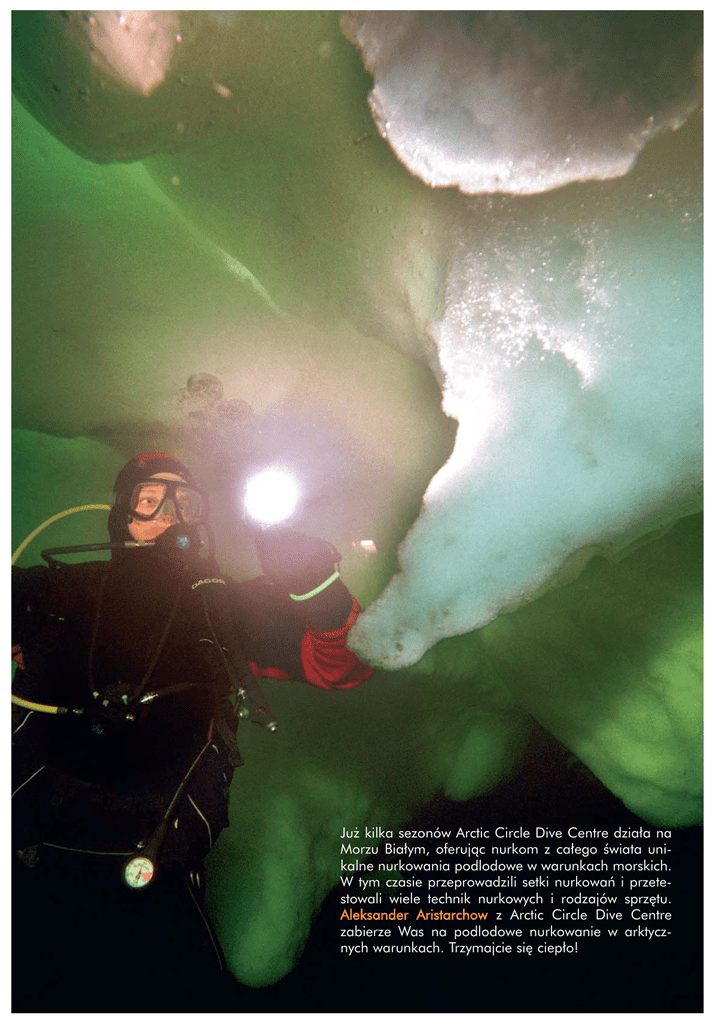 Już kilka sezonów Arctic Circle Dive Centre działa na Morzu Białym, oferując nurkom z całego świata unikalne nurkowania podlodowe w warunkach morskich. W tym czasie przeprowadzili setki nurkowań i przetestowali wiele technik nurkowych i rodzajów sprzętu. Aleksander Aristarchow z Arctic Circle Dive Centre zabierze Was na podlodowe nurkowanie w arktycznych warunkach. Trzymajcie się ciepło! W świecie kryształowych zwierciadeł N urkowanie podlodowe jest bez wątpienia jedną z najbardziej ekstremalnych form nurkowania. Niska temperatura wody i powietrza, nieprzepuszczalna bariera nad głową, ograniczona widoczność i trudności w orientacji są prawdziwym testem dobrej formy i niezawodności, nie tylko dla wyposażenia i ekwipunku, ale i dla zdrowia nurka, jego warunków psychicznych i fizycznych, a także doświadczeń i wiedzy nabytych podczas dotychczasowej kariery nurkowej. Niemniej jednak są to pasjonujące nurkowania, poruszające każdego uczestnika. Uzyskane doświadczenia i przeżyte emocje pod powłoką lodową owładną każdym, kto wskoczy nawet tylko raz do tego świata kryształowych zwierciadeł. Już kilka sezonów Arctic Circle Dive Centre działa na Morzu Białym, oferując nurkom z całego świata unikalne nurkowania podlodowe w warunkach morskich. W tym czasie przeprowadziliśmy z powodzeniem setki nurkowań i wypróbowaliśmy wiele technik nurkowych i rodzajów sprzętu. Zdobyliśmy ogromne doświadczenie i wypracowaliśmy to, co uważamy za najlepsze: organizację 58 nurkowanie 02/2006 i przeprowadzanie bezpiecznych nurkowań podlodowych. Zimno! Jest to oczywiście główny czynnik powodujący, że nurkowanie podlodowe jest tak trudne. Możemy sobie przypomnieć ze szkolnych podręczników fizyki, że woda przewodzi ciepło 25 razy lepiej niż powietrze i że pojemność cieplna obu tych ośrodków różni się 800 razy, stąd ciało ludzkie marznie dziesiątki razy szybciej w wodzie niż na powierzchni. Wystarczy wspomnieć, że w temperaturach, w których odbywają się tutejsze nurkowania zimowe, ktoś kto nie ma na sobie specjalnego sprzętu ochronnego straciłby przytomność z zimna po 10-15 minutach i najprawdopodobniej umarłby w ciągu pół godziny. Ciało nurka musi więc być chronione przed niekorzystnym - nurkowanie podlodowe działaniem środowiska zewnętrznego - głównie zimna. Pod stosowany prawie zawsze w takich warunkach suchy skafander, nurek wkłada klasyczną wełnianą bieliznę nurkową albo specjalny strój izolujący wykonany z nowoczesnych, wysoce udoskonalonych materiałów, takich jak Thinsulate™, Polartec® i Flectalon®. Utrzymują one ciepłotę ciała poprzez uwięzienie warstw powietrza pomiędzy włóknami. W dodatku nowoczesne materiały usuwają nadmiar wilgoci (potu) poza skórę, utrzymując ją suchą. Jeśli chodzi o same skafandry, to według nas suche skafandry neoprenowe są najlepsze do nurkowań podlodowych. W porównaniu do skafandrów membranowych, gdzie materiał gumowany służy tylko do odizolowania od wody, skafandry neoprenowe są zdecydowanie cieplejsze, ponadto pozwalają na utrzymanie pływalności i zatrzymują ciepło, nawet jeśli hermetyczne zabezpieczenie zostanie nagle przerwane z powodu rozerwania, przekłucia lub innego uszkodzenia. Nurek ubrany w skafander, półmaskę i rękawice jest niemal całkowicie chroniony przed wodą, oprócz małej części u dołu twarzy, gdzie w ustach tkwi ust- nik automatu oddechowego. Niektórzy nurkowie preferują pełne maski , wówczas prawie nie ma kontaktu między ciałem a wodą. W takim sprzęcie nurek może komfortowo spędzić godzinę do półtorej w zamarzającej wodzie. Wraz z rozwojem silnych, kompaktowych, niezależnych źródeł energii (akumulatory NiMH) coraz większa liczba osób używa bielizny podgrzewanej elek- trycznie, aby poprawić komfort nurkowania podlodowego. Zwykle jest to kamizelka, noszona pod skafandrem ogrzewająca korpus nurka. Pojemnik z bateriami noszony jest pod ubraniem albo na pasie lub w kieszeni KRW. W takim przypadku skafander musi mieć dodatkowy uszczelniony otwór na przewód. Jednakże bielizna elektryczna jest tylko pomocniczym elementem ochrony ciepl- 02/2006 nurkowanie 59 NURKOWANIE nej, główną rolę pełni wciąż izolacja bierna. Pomimo tego, że suche skafandry częściowo kompensują zmiany w pływalności nurka, nalegamy na posiadanie kompensatorów pływalności dla zwiększenia bezpieczeństwa i wygody. Nie mamy jakichś specjalnych wymagań, oprócz tego, że elementy KRW nie powinny utrudniać dostępu do zaworów powietrznych skafandra. Czasem niektórzy nurkowie umieszczają niewielką część ciężarków (zwykle 1-2 kg) wokół własnych stóp, by lepiej utrzymać równowagę. Jednakże jest to kwestia przyzwyczajenia i osobistych preferencji. Zimno! Jest to też przyczyna następnego problemu, prawie zawsze spotykanego podczas nurkowań zimowych. Znowu jest to sprawa życia i śmierci: funkcjonowanie automatów oddechowych w niskich temperaturach. Jak powszechnie wiadomo, każdy gaz, rozprężając się, ulega ochłodzeniu. To prawo fizyki sprawdza się nazbyt dobrze w nurkowaniu podlodowym. Zanim powietrze dojdzie do płuc, zapas sprężonego powietrza zgromadzony w butlach na plecach nurka przechodzi przez dwa stopnie redukcji, po której ciśnienie powietrza zostaje zmniejszone do ciśnienia otoczenia. Zrozumiałe jest, że następuje szybkie rozprężenie i w rezultacie gaz oziębia się. Co więcej, jeśli proces ten występuje przy temperaturze wody bliskiej punktowi zamarzania, dodatkowe oziębienie tych części automatu oddechowego, które stykają się z wodą i przepływem powietrza, powoduje ich zamarzanie. Lód, który tworzy się na korpusie, częściach składowych automatu i ustnika, blokuje pracę tego istotnego do podtrzymania życia urządzenia, czasem całkowicie wykluczając je z użycia. Nie ma potrzeby tłumaczenia, jak jest to niebezpieczne dla nurka. Z tego powod