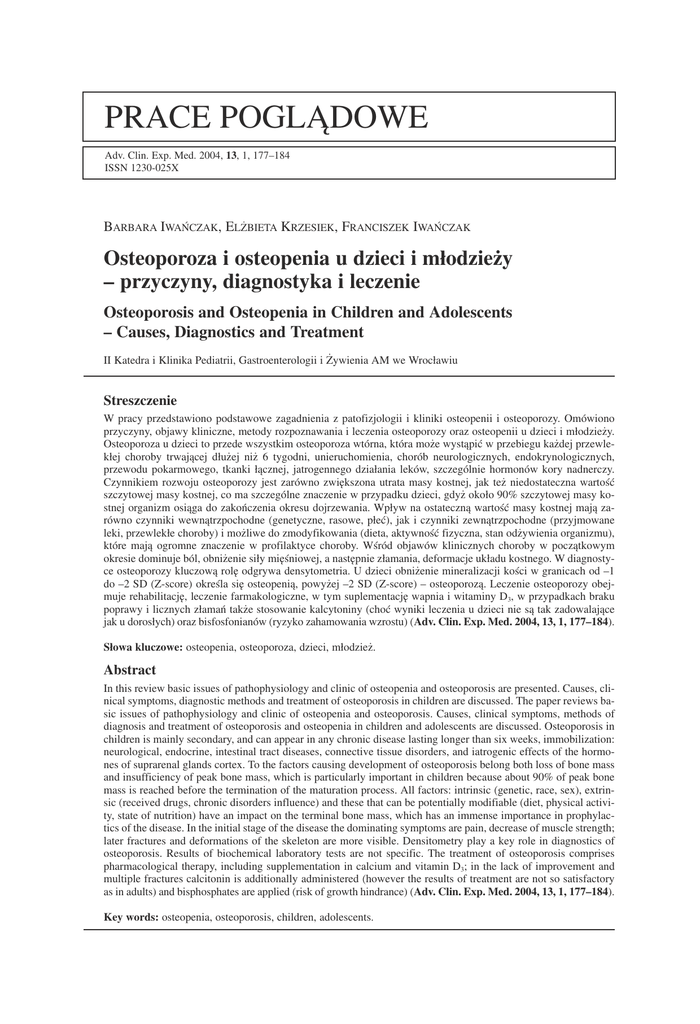 PRACE POGLĄDOWE Adv. Clin. Exp. Med. 2004, 13, 1, 177–184 ISSN 1230−025X BARBARA IWAŃCZAK, ELŻBIETA KRZESIEK, FRANCISZEK IWAŃCZAK Osteoporoza i osteopenia u dzieci i młodzieży – przyczyny, diagnostyka i leczenie Osteoporosis and Osteopenia in Children and Adolescents – Causes, Diagnostics and Treatment II Katedra i Klinika Pediatrii, Gastroenterologii i Żywienia AM we Wrocławiu Streszczenie W pracy przedstawiono podstawowe zagadnienia z patofizjologii i kliniki osteopenii i osteoporozy. Omówiono przyczyny, objawy kliniczne, metody rozpoznawania i leczenia osteoporozy oraz osteopenii u dzieci i młodzieży. Osteoporoza u dzieci to przede wszystkim osteoporoza wtórna, która może wystąpić w przebiegu każdej przewle− kłej choroby trwającej dłużej niż 6 tygodni, unieruchomienia, chorób neurologicznych, endokrynologicznych, przewodu pokarmowego, tkanki łącznej, jatrogennego działania leków, szczególnie hormonów kory nadnerczy. Czynnikiem rozwoju osteoporozy jest zarówno zwiększona utrata masy kostnej, jak też niedostateczna wartość szczytowej masy kostnej, co ma szczególne znaczenie w przypadku dzieci, gdyż około 90% szczytowej masy ko− stnej organizm osiąga do zakończenia okresu dojrzewania. Wpływ na ostateczną wartość masy kostnej mają za− równo czynniki wewnątrzpochodne (genetyczne, rasowe, płeć), jak i czynniki zewnątrzpochodne (przyjmowane leki, przewlekłe choroby) i możliwe do zmodyfikowania (dieta, aktywność fizyczna, stan odżywienia organizmu), które mają ogromne znaczenie w profilaktyce choroby. Wśród objawów klinicznych choroby w początkowym okresie dominuje ból, obniżenie siły mięśniowej, a następnie złamania, deformacje układu kostnego. W diagnosty− ce osteoporozy kluczową rolę odgrywa densytometria. U dzieci obniżenie mineralizacji kości w granicach od –1 do –2 SD (Z−score) określa się osteopenią, powyżej –2 SD (Z−score) – osteoporozą. Leczenie osteoporozy obej− muje rehabilitację, leczenie farmakologiczne, w tym suplementację wapnia i witaminy D3, w przypadkach braku poprawy i licznych złamań także stosowanie kalcytoniny (choć wyniki leczenia u dzieci nie są tak zadowalające jak u dorosłych) oraz bisfosfonianów (ryzyko zahamowania wzrostu) (Adv. Clin. Exp. Med. 2004, 13, 1, 177–184). Słowa kluczowe: osteopenia, osteoporoza, dzieci, młodzież. Abstract In this review basic issues of pathophysiology and clinic of osteopenia and osteoporosis are presented. Causes, cli− nical symptoms, diagnostic methods and treatment of osteoporosis in children are discussed. The paper reviews ba− sic issues of pathophysiology and clinic of osteopenia and osteoporosis. Causes, clinical symptoms, methods of diagnosis and treatment of osteoporosis and osteopenia in children and adolescents are discussed. Osteoporosis in children is mainly secondary, and can appear in any chronic disease lasting longer than six weeks, immobilization: neurological, endocrine, intestinal tract diseases, connective tissue disorders, and iatrogenic effects of the hormo− nes of suprarenal glands cortex. To the factors causing development of osteoporosis belong both loss of bone mass and insufficiency of peak bone mass, which is particularly important in children because about 90% of peak bone mass is reached before the termination of the maturation process. All factors: intrinsic (genetic, race, sex), extrin− sic (received drugs, chronic disorders influence) and these that can be potentially modifiable (diet, physical activi− ty, state of nutrition) have an impact on the terminal bone mass, which has an immense importance in prophylac− tics of the disease. In the initial stage of the disease the dominating symptoms are pain, decrease of muscle strength; later fractures and deformations of the skeleton are more visible. Densitometry play a key role in diagnostics of osteoporosis. Results of biochemical laboratory tests are not specific. The treatment of osteoporosis comprises pharmacological therapy, including supplementation in calcium and vitamin D3; in the lack of improvement and multiple fractures calcitonin is additionally administered (however the results of treatment are not so satisfactory as in adults) and bisphosphates are applied (risk of growth hindrance) (Adv. Clin. Exp. Med. 2004, 13, 1, 177–184). Key words: osteopenia, osteoporosis, children, adolescents. 178 B. IWAŃCZAK, E. KRZESIEK, F. IWAŃCZAK W ostatniej dekadzie zastosowanie nowych me− tod oceny mineralizacji kości przyczyniło się do wzrostu zainteresowania osteoporozą i osteopenią. W licznych doniesieniach analizowano metody dia− gnostyczne, przyczyny oraz wyniki leczenia osteo− porozy. Wykazano, że osteoporoza jest częstym uo− gólnionym procesem chorobowym, doprowadzają− cym do wzrostu łamliwości kości i kalectwa [1–7]. Układ kostny, homeostaza wapnia oraz czynniki wpływające na gospodarkę wapniową Układ kostny człowieka, podpora dla ciała, jest miejscem przymocowania mięśni, ochroną dla we− wnętrznych organów oraz magazynem wapnia, fos− foru i magnezu. Składa się z kości długich, krót− kich i płaskich. Kości szkieletu są utworzone przez dwa rodzaje tkanki kostnej: zbitą (korową), która znajduje się na powierzchni kości i jest obecna głównie w trzonach kości długich oraz gąbczastą (beleczkową), zbudowaną z beleczek kostnych, która wypełnia wnętrze kości krótkich i płaskich, występuje także w kościach długich. W szkielecie człowieka, w zależności od jego wieku, zachodzą ciągłe zmiany masy kostnej. Obejmują fazy wzro− stu, konsolidacji i inwolucji tkanki kostnej. Okres dziecięcy i dojrzewania mają zasadniczy wpływ na mineralizację kośćca. Następuje szybka budowa szkieletu kostnego, która trwa do zamknięcia się nasad kostnych, tzn. do około 20 roku życia. W tym czasie tworzy się 90–95% masy kostnej [8]. Do prawidłowej minerali