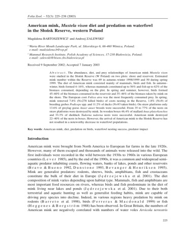 Folia Zool. – 52(3): 225–238 (2003) American mink, Mustela vison diet and predation on waterfowl in the S∏oƒsk Reserve, western Poland Magdalena BARTOSZEWICZ1 and Andrzej ZALEWSKI2 1 Warta River Mouth Landscape Park, ul. Sikorskiego 6, 66-460 Witnica, Poland; e-mail: [email protected] 2 Mammal Research Institute, Polish Academy of Sciences, 17-230 Bia∏owie˝a, Poland; e-mail: [email protected] Received 9 September 2002; Accepted 7 January 2003 A b s t r a c t . The abundance, diet, and prey relationships of American mink Mustela vison were studied in the S∏oƒsk Reserve (W Poland) on two plots: shore and reservoir. Estimated mink number within the Reserve was 69 in autumn–winter 1998/1999 and 50 during spring 1999. The diet of American mink consisted mainly of mammals, birds and fish. In autumn– winter, birds formed 4–16%, whereas mammals constituted up to 56% and fish up to 62% of the biomass consumed, depending on the plot. In spring and summer, however, birds formed 45–60% of the biomass consumed in the reservoir and 35–46% of the biomass taken by mink on the shore. The European coot Fulica atra was the most frequently consumed prey. In spring, mink removed 7.8% (N=278 killed birds) of coots nesting in the Reserve, 1.8% (N=9) of breeding grebes Podiceps spp. and 11.2% of ducks (N=93 taken birds). On straw platforms only 13.6% of greylag geese Anser anser broods were successful. From 35 to 77% of the nests on straw platforms were destroyed by mink. In wooden boxes 46.4% of mallard Anas platyrhynchos and 33.3% of shelduck Tadorna tadorna nests were successful. American mink destroyed 22–40% of the nests in boxes. However, the arrival of American mink to the S∏oƒsk Reserve has not resulted in a noteworthy decrease in waterfowl populations. Key words: American mink, diet, predation on birds, waterfowl nesting success, predator impact Introduction American mink were brought from North America to European fur farms in the late 1920s. However, many of them escaped and thousands of animals were released into the wild. The first individuals were recorded in the wild between the 1930s to 1960s in various European countries (L e v e r 1985), and by the end of the 1990s, it was a common and widespread semiaquatic predator inhabiting coasts, flowing waters, banks of lakes, ponds and other reservoirs (B r a v o & B u e n o 1992, D u n s t o n e 1993, B e v a n g e r & H e n r i k s e n 1995). Mink are generalist predators: rodents, shrews, birds, amphibians, fish and crustaceans constitute the bulk of their diet in Europe (J ´ d r z e j e w s k a et al. 2001). The diet composition of mink varies depending upon habitat type. Mammals, fish and amphibians are most important food resources on rivers, whereas birds and fish predominate in the diet of mink living near lakes and ponds (J ´ d r z e j e w s k a et al. 2001). Due to their both terrestrial and aquatic hunting as well as generalist feeding habits, mink are capable of driving prey species into decline. Indeed, in various regions heavy predation by mink on rodents (B a r r e t o et al. 1998), birds (F e r r e r a s & M a c d o n a l d 1999) or fish (H e g g e n e s & B o r g s t r ö m 1988) has been observed. In Great Britain, the numbers of American mink are negatively correlated with numbers of water voles Arvicola terrestris 225 (H a l l i w e l l & M a c d o n a l d 1996). After 20 years of mink occurrence in the Masurian Lakeland, on north-eastern Poland, a decline in muskrat Ondatra zibethicus, coot Fulica atra and some duck species was observed, although a study on the mink diet in that area suggested that the proportion of birds in the mink diet was very low (B r z e z i ƒ s k i 1998). Therefore, the impact of mink in the early phase of its expansion is not well known. In Poland, the first American mink were observed in 1962 in Central and Eastern Poland (R u p r e c h t et al. 1983). However, in the western part of the country mink did not appear until the end of the 1980s, and in S∏oƒsk Reserve, the mink has been present less than 10 years. The Reserve is one of the most important protected areas for birds in Europe (W e s o ∏ o w s k i & W i n i e c k i 1988, G r i m m e t t & J o n e s 1989). Large concentrations of different bird species occur there year-round. Major water level fluctuations are characteristic of this area and can reach 4 m annually. Owing to such drastic changes, artificial nesting structures have been installed over many years for the protection of nests against inundation by water. Wooden boxes and platforms made of straw are put high on willow trees. These nests are used by greylag geese Anser anser, mallards Anas platyrhynchos and shelducks Tadorna tadorna. The main aim of our study was (1) to describe the diet composition of American mink during the initial phase of its colonisation, and (2) to assess the impact of mink predation on bird populations in the S∏oƒsk Reserve. Study Area The S∏oƒsk Reserve covers 46.6 km2 and is located in western Poland (52°34’ N, 14°43’ E) where the Warta River flows into the Odra River. The lower Warta River valley is surrounded by dikes creating an artificial reservoir which acts as a catchment for floodwater. Normally, from autumn to spring 50–100% of the reserve is flooded, with only small islands and hummocks above the water. The area forms a mosaic of flooded meadows, old riverbeds and irrigation channels (M a j e w s k i 1983). Willow Salix spp. thickets are the dominant vegetation with older willow trees much more rare. The S∏oƒsk Reserve has been protected as a Ramsar Site since 1984 because it is particularly important as a nesting site for waterfowl, grebes, terns, gulls, shorebirds, and coots (2,000–14,000 breeding pairs, B a r t o s z e w i c z et al. 2000). During the moulting season up to 25,000 ducks concentrate here (P a n e k & M a j e w s k i 1990) and during autumn and spring migrations up to 250,000 birds 