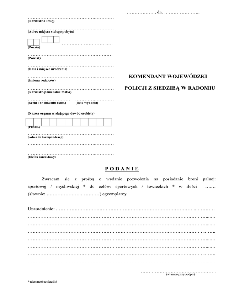 ………………., dn. ………………….. …………………………………….………… (Nazwisko i Imię) …………………………………….………… (Adres miejsca stałego pobytu) ………………………..…. (Poczta) ……………………………………………… (Powiat) …………………………………….………… (Data i miejsce urodzenia) KOMENDANT WOJEWÓDZKI …………………………………….………… (Imiona rodziców) …………………………………….………… POLICJI Z SIEDZIBĄ W RADOMIU (Nazwisko panieńskie matki) ……………………… ………….………… (Seria i nr dowodu osob.) (data wydania) …………………………………….………… (Nazwa organu wydającego dowód osobisty) (PESEL) …………………………………….………… (Adres do korespondencji) …………………………………….………… …………………………………….………… (telefon kontaktowy) PODANIE broni palnej: sportowej / myśliwskiej * do celów: sportowych / łowieckich * w ilości ….… Zwracam się z prośbą o wydanie pozwolenia na posiadanie (słownie: ………………….…………) egzemplarzy. Uzasadnienie: ……………………….……………………………………………………..………… ……………………………………………………………………………………………………...… ……………………………………………………………………………………………………...… …………………………………………………………………………………………………..……. ……………………………………………………………………………………………………...… ……………………………………………………………………………………………………...… …………………………………………………………………………………………………..……. ……………………………………………………………………………………………………...… …………………………………………. (własnoręczny podpis) * niepotrzebne skreślić