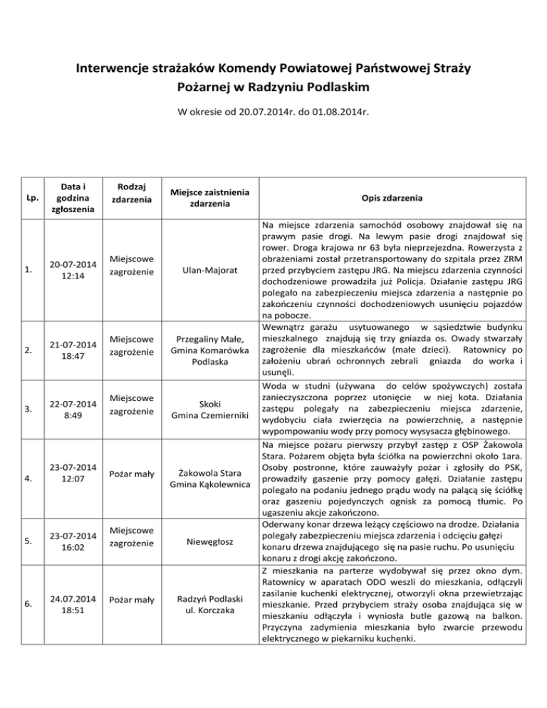 Interwencje strażaków Komendy Powiatowej Państwowej Straży Pożarnej w Radzyniu Podlaskim W okresie od 20.07.2014r. do 01.08.2014r. Lp. Data i godzina zgłoszenia Rodzaj zdarzenia 1. 20-07-2014 12:14 Miejscowe zagrożenie 2. 21-07-2014 18:47 Miejscowe zagrożenie 3. 22-07-2014 8:49 Miejscowe zagrożenie 4. 23-07-2014 12:07 5. 23-07-2014 16:02 6. 24.07.2014 18:51 Pożar mały Miejscowe zagrożenie Pożar mały Miejsce zaistnienia zdarzenia Ulan-Majorat Przegaliny Małe, Gmina Komarówka Podlaska Skoki Gmina Czemierniki Żakowola Stara Gmina Kąkolewnica Niewęgłosz Radzyń Podlaski ul. Korczaka Opis zdarzenia Na miejsce zdarzenia samochód osobowy znajdował się na prawym pasie drogi. Na lewym pasie drogi znajdował się rower. Droga krajowa nr 63 była nieprzejezdna. Rowerzysta z obrażeniami został przetransportowany do szpitala przez ZRM przed przybyciem zastępu JRG. Na miejscu zdarzenia czynności dochodzeniowe prowadziła już Policja. Działanie zastępu JRG polegało na zabezpieczeniu miejsca zdarzenia a następnie po zakończeniu czynności dochodzeniowych usunięciu pojazdów na pobocze. Wewnątrz garażu usytuowanego w sąsiedztwie budynku mieszkalnego znajdują się trzy gniazda os. Owady stwarzały zagrożenie dla mieszkańców (małe dzieci). Ratownicy po założeniu ubrań ochronnych zebrali gniazda do worka i usunęli. Woda w studni (używana do celów spożywczych) została zanieczyszczona poprzez utonięcie w niej kota. Działania zastępu polegały na zabezpieczeniu miejsca zdarzenie, wydobyciu ciała zwierzęcia na powierzchnię, a następnie wypompowaniu wody przy pomocy wysysacza głębinowego. Na miejsce pożaru pierwszy przybył zastęp z OSP Żakowola Stara. Pożarem objęta była ściółka na powierzchni około 1ara. Osoby postronne, które zauważyły pożar i zgłosiły do PSK, prowadziły gaszenie przy pomocy gałęzi. Działanie zastępu polegało na podaniu jednego prądu wody na palącą się ściółkę oraz gaszeniu pojedynczych ognisk za pomocą tłumic. Po ugaszeniu akcje zakończono. Oderwany konar drzewa leżący częściowo na drodze. Działania polegały zabezpieczeniu miejsca zdarzenia i odcięciu gałęzi konaru drzewa znajdującego się na pasie ruchu. Po usunięciu konaru z drogi akcję zakończono. Z mieszkania na parterze wydobywał się przez okno dym. Ratownicy w aparatach ODO weszli do mieszkania, odłączyli zasilanie kuchenki elektrycznej, otworzyli okna przewietrzając mieszkanie. Przed przybyciem straży osoba znajdująca się w mieszkaniu odłączyła i wyniosła butle gazową na balkon. Przyczyna zadymienia mieszkania było zwarcie przewodu elektrycznego w piekarniku kuchenki. 7. 24.07.2014 19:40 Miejscowe zagrożenie 8. 26.07.2014 05:17 Miejscowe zagrożenie 9. 26-07-2014 10:33 Pożar mały 10. 26-07-2014 11:51 Pożar mały 11. 26-07-2014 17:45 12. 13. 26-07-2014 18:17 27-07-2014 19:17 Miejscowe zagrożenie Miejscowe zagrożenie Miejscowe zagrożenie W ścianie budynku jednorodzinnego zagnieździły się osy. Owady zagrażały mieszkańcom oraz przechodniom. Dwóch Komarówka Podlaska ratowników w ubraniach ochronnych za zgodą właściciela ul. 11 Listopada oderwało jedną deskę szalunkową i zebrało gniazdo owadów do worka. Miejsce, w którym było ulokowane gniazdo spryskano środkiem owadobójczym. Konar drzewa częściowo blokujący ruch na jednym z pasów. Bezwola Działania zastępu JRG Radzyń Podlaski polegały na Droga 63 zabezpieczeniu miejsca zdarzenia, pocięciu drzewa przy pomocy piły mechanicznej i usunięciu na pobocze drogi. Na miejscu pożaru strażacy zastali palące się rżysko oraz słomę po kombajnie. Pożar mógł się rozprzestrzenić na rosnące w pobliżu zboże. Zastępy z OSP Sobole podały trzy prądy wody po Zarzec Ulański obwodzie pożaru, następnie prowadzono dogaszanie na całej powierzchni. Dodatkowo polano wodą prasę rolującą, w której tliła się słoma. Na miejsce pożaru pierwszy przybył zastęp z Wojskowej Straży Pożarnej J.W. Bezwola. Paliła się słoma po kombajnie przy zabudowaniach rolnych na powierzchni ok. 5 ar. Bezpośrednio pożarem było zagrożone rosnące zboże. Pożar gasili Ostrówki domownicy za pomocą łopat. Działanie zastępu polegało na podaniu jednego prądu wody na palącą się słomę. Przybyły zastęp z JRG prowadził dogaszanie za pomocą tłumic tlącej się słomy. Po zakończeniu działań miejsce przekazano właścicielowi. Przy oknie budynku mieszkalnego znajdowało się gniazdo os. Okno przy, którym zagnieździły się osy znajdowało się w pokoju dziecięcym. Owady stwarzały zagrożenie dla dzieci Radzyń Podlaski przebywających w pomieszczeniu. Działania zastępu polegały ul. Podlaska na zabezpieczeniu miejsca zdarzenia, zebraniu gniazda do worka i wywieziono poza teren miejscowości. Stójka Gmina Czemierniki Przegaliny Duże, Gmina Komarówka Podlaska Na poddaszu budynku mieszkalnego znajdowało się gniazdo os. Owady stwarzały zagrożenie dla mieszkańców ( małe dzieci). Ratownik po założeniu ubrania ochronnego zebrał gniazdo do worka. Następnie owady wywieziono poza teren zamieszkały przez ludzi. Na poddaszu budynku mieszkalnego zagnieździły się szerszenie. Owady stwarzały zagrożenie dla mieszkańców ( starsze osoby ). Ratownik po założeniu ubrania ochronnego przy pomocy drabiny przenośnej zebrał dwa utworzone przez owady gniazda do worka. Następnie owady wywieziono poza teren zamieszkały przez ludzi. 14. 29-07-2014 13:44 Pożar mały 15. 29-07-2014 Pożar średni 13:49 16. 29.07.2014 22:32 Miejscowe zagrożenie 17 30-07-2014 Pożar średni 03:07 18 30-07-2014 12:09 Pożar mały Żakowola Stara, Kąkolewnica Stójka, Gmina Czemierniki Radzyń Podlaski ul. Warszawska Brzozowica Duża Maruszewiec Gmina Borki Na miejsce pożaru jako pierwszy przybył zastęp z OSP Żakowola Stara. Pożarem objęta była trawa na powierzchni ok. 1 ara. Działanie zastępu polegało na podaniu jednego prądu wody na palącą