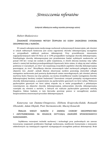 Streszczenia referatów (kolejność alfabetyczna według nazwiska pierwszego autora) Hubert Białasiewicz ZASADNOŚĆ STOSOWANIA METODY DOPPLERA DO OCENY ZAGROŻENIA CHOROBĄ DEKOMPRESYJNĄ U NURKÓW. W ramach zabezpieczenia medycznego nurkowań wykonywanych komercyjnie, jak również w celach militarnych konieczna jest ocena zagrożenia choroba dekompresyjną szczególnie w przypadkach zakłóceń podczas dekompresji. Przy prawidłowym stosowaniu najpopularniejszych tabel US Navy aż w 3,9% przypadków występuje choroba dekompresyjna. Patofizjologia choroby dekompresyjnej jest przedmiotem badań wybitnych naukowców od ponad 150 lat i wciąż nie została w pełni wyjaśniona, w chwili obecnej możemy więc tylko mówić o mniej lub bardziej prawdopodobnych hipotezach, które mimo, iż zdają się mieć solidne podstawy w warunkach „in vitro” nie wyjaśniają wszystkich aspektów choroby dekompresyjnej powstającej „in vivo”. Weryfikacja obecnie stosowanych tabel nurkowych polegała na braku objawów tzw. „bends”, jednak dłuższe obserwacje nurków pozwalają stwierdzić odległe następstwa nurkowania pod postacią dyskretnych zmian neurologicznych, jak również jałowej martwicy kości. Nasuwa się więc pytanie, czy można stratyfikować ryzyko wystąpienia choroby dekompresyjnej bardziej czułymi badaniami? Zauważono związek pomiędzy występowaniem choroby dekompresyjnej, a pojawieniem się pęcherzyków gazowych we krwi żylnej. Wykrycie pęcherzyków gazowych we krwi żylnej wiązało się w wielu przypadkach z późniejszym rozwinięciem się objawów choroby dekompresyjnej, jednocześnie choroba dekompresyjna rozwijała się również u nurków, u których nie wykryto pęcherzyków gazowych metodą Dopplera. Dalsze badania w tym kierunku powinny pomoc w szczegółowej analizie bezpieczeństwa stosowanych procedur dekompresyjnych. Katarzyna van Damme-Ostapowicz, Elżbieta Krajewska-Kułak, Romuald Olszański, Adam Olejnik, Piotr Siermontowski, Maciej Konarski ANALIZA I WIEDZY ZAPOTRZEBOWANIA NURKÓW NA EDUKACJĘ Z ZAKRESU CHOROBY DEKOMPRESYJNEJ DOTYCZĄCĄ ZAGROŻEŃ SPOWODOWANYCH NURKOWANIEM. Szybkiemu rozwojowi techniki nurkowej i technologii prac podwodnych nie zawsze towarzyszy znajomość problemów fizjologii nurkowania, możliwości korzystania z mieszanin oddechowych czy istniejących zagrożeń występujących szczególnie podczas dekompresji. Brak wiedzy w powyższym zakresie, może być często przyczyną wypadków i chorób nurkowych, w tym także choroby dekompresyjnej. CEL: Celem pracy była analiza wiedzy nurków z zakresu choroby dekompresyjnej i zapotrzebowania na edukację dotyczącą zagrożeń spowodowanych nurkowaniem. MATERIAŁ I METODY: Badanie przeprowadzono w Zakładzie Technologii Prac Podwodnych Akademii Marynarki Wojennej w Gdyni, w grupie 34 nurków. Do realizacji przyjętych celów wykorzystano metodę sondażu diagnostycznego z wykorzystaniem autorskiego kwestionariusza ankiety, specjalnie skonstruowanego do realizacji badania. WYNIKI: Respondenci w większości (77%) ocenili swój aktualny stan zdrowia jako dobry. Zbliżony odsetek nurków (47%-50%) stosowało trening przed nurkowaniem, jak i nie przechodzili adaptacji do pobytu pod ciśnieniem. Wśród odczuć, które dominowały po zakończeniu nurkowania były zarówno zadowolenie (53%) jak i poczucie zmęczenia (44%). Co piąty respondent (20%) nie potrafił zdefiniować emocji odczuwanych po nurkowaniu, zaś znużenie, osłabienie i apatię odczuwało po 6% badanych. Praktycznie wszyscy ankietowani (94%) uznali, iż znają definicję choroby dekompresyjnej, natomiast tylko jedna osoba przyznała się do wystąpienia u niej objawów tej choroby. Wszyscy ankietowani uwzględnili tylko jeden przypadek mogący spowodować chorobę dekompresyjną. Ankietowani przede wszystkim wybierali używanie tabel dekompresyjnych oraz ścisłe realizowanie planu nurkowania, jako zasady zdrowego nurkowania. O chorobie dekompresyjnej respondenci dowiadywali się głównie na kursach specjalistycznych, także dokształcali się indywidualnie, sięgając po literaturę fachową oraz szukając informacji w Internecie. Zdecydowana większość badanych deklarowała chęć poszerzenia wiedzy na temat dekompresji, a preferowaną formą zdobywania nowej wiedzy były szkolenia. Wśród proponowanych zagadnień, które warto uwzględnić w szkoleniu według ankietowanych przeważały nauka o składzie mieszanin oddechowych oraz rodzaje ryzyka podczas nurkowania. WNIOSKI: Wiedza nurków na temat choroby dekompresyjnej jest zróżnicowana. Prawdopodobieństwo zagrożenia chorobą dekompresyjną u nurków jest duże. Nurkowie pragną poszerzyć swoją wiedzę na temat choroby dekompresyjnej. POSTULATY: 1. Wskazane jest prowadzenie systematycznych szkoleń nurków w zakresie zagrożeń związanych z możliwością wystąpienia choroby dekompresyjnej. 2. Wskazana jest kontynuacja powyższych badań na większej grupie nurków. Kazimierz Dęga, Romuald Olszański PAMIĘCI TWÓRCY POLSKIEJ MEDYCYNY PODWODNEJ KMDR. PROF. DR HAB. MED. TADEUSZA DOBOSZYŃSKIEGO Autorzy w swojej prezentacji przedstawiają sylwetkę osobową i naukową zmarłego w dniu 3. 08. 2012r ucznia Lwowskiego Korpusu Kadetów, żołnierza VI Brygady wileńskiej AK [ps „Biały”] współtwórcy polskiej medycyny podwodnej i hiperbarycznej kmdr prof. Tadeusza Doboszyńskiego. Profesor jako wieloletni Kierownik Zakładu Medycyny Podwodnej, Katedry Medycyny Morskiej WAM całe dorosłe życie poświęcił badaniu nad wpływem na ustrój człowieka środowiska gazowego w warunkach hiperbarii. Opracował własny bezpieczny system nurkowań głębokich i saturowanych. Erudyta, humanista, sportowiec, wspaniały dydaktyk pozostawił po sobie wielu wybitnych uczniów. Był filarem morskiej służby zdrowia współtwórcą jej sukcesów i chwały. Bronisław K. Głód ZMIANY CAŁKOWITEGO POTENCJAŁU ANTYOKSYDACYJNEGO PODCZAS HIPERMETABOLIZMU W literat