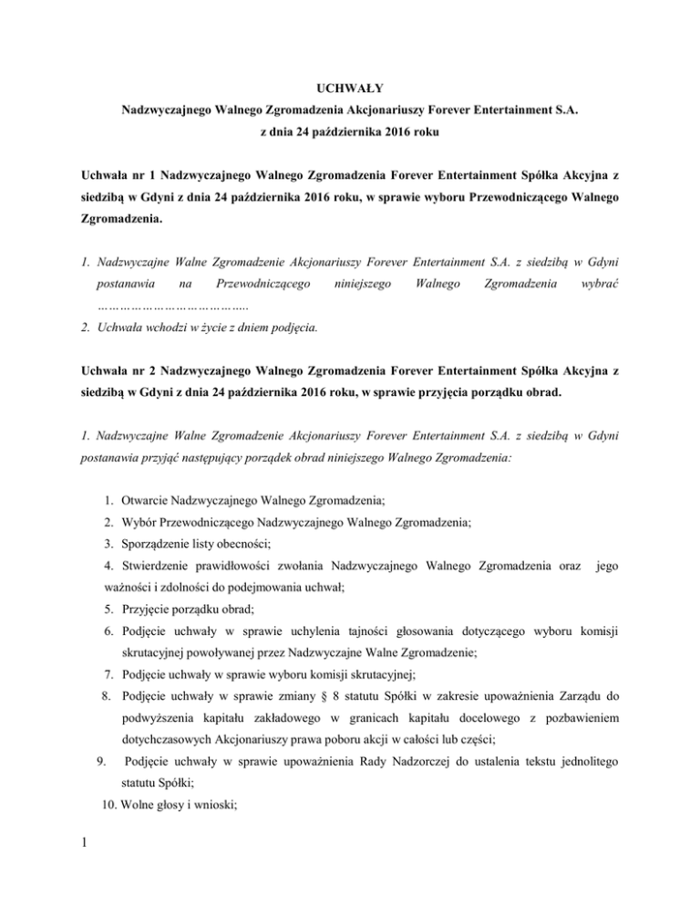UCHWAŁY Nadzwyczajnego Walnego Zgromadzenia Akcjonariuszy Forever Entertainment S.A. z dnia 24 października 2016 roku Uchwała nr 1 Nadzwyczajnego Walnego Zgromadzenia Forever Entertainment Spółka Akcyjna z siedzibą w Gdyni z dnia 24 października 2016 roku, w sprawie wyboru Przewodniczącego Walnego Zgromadzenia. 1. Nadzwyczajne Walne Zgromadzenie Akcjonariuszy Forever Entertainment S.A. z siedzibą w Gdyni postanawia na Przewodniczącego niniejszego Walnego Zgromadzenia wybrać ………………………………….. 2. Uchwała wchodzi w życie z dniem podjęcia. Uchwała nr 2 Nadzwyczajnego Walnego Zgromadzenia Forever Entertainment Spółka Akcyjna z siedzibą w Gdyni z dnia 24 października 2016 roku, w sprawie przyjęcia porządku obrad. 1. Nadzwyczajne Walne Zgromadzenie Akcjonariuszy Forever Entertainment S.A. z siedzibą w Gdyni postanawia przyjąć następujący porządek obrad niniejszego Walnego Zgromadzenia: 1. Otwarcie Nadzwyczajnego Walnego Zgromadzenia; 2. Wybór Przewodniczącego Nadzwyczajnego Walnego Zgromadzenia; 3. Sporządzenie listy obecności; 4. Stwierdzenie prawidłowości zwołania Nadzwyczajnego Walnego Zgromadzenia oraz jego ważności i zdolności do podejmowania uchwał; 5. Przyjęcie porządku obrad; 6. Podjęcie uchwały w sprawie uchylenia tajności głosowania dotyczącego wyboru komisji skrutacyjnej powoływanej przez Nadzwyczajne Walne Zgromadzenie; 7. Podjęcie uchwały w sprawie wyboru komisji skrutacyjnej; 8. Podjęcie uchwały w sprawie zmiany § 8 statutu Spółki w zakresie upoważnienia Zarządu do podwyższenia kapitału zakładowego w granicach kapitału docelowego z pozbawieniem dotychczasowych Akcjonariuszy prawa poboru akcji w całości lub części; 9. Podjęcie uchwały w sprawie upoważnienia Rady Nadzorczej do ustalenia tekstu jednolitego statutu Spółki; 10. Wolne głosy i wnioski; 1 11. Zamknięcie obrad Nadzwyczajnego Walnego Zgromadzenia Akcjonariuszy. 2. Uchwała wchodzi w życie z dniem podjęcia. Uchwała nr 3 Nadzwyczajnego Walnego Zgromadzenia Forever Entertainment Spółka Akcyjna z siedzibą w Gdyni z dnia 24 października 2016 roku, w sprawie uchylenia tajności głosowania dotyczącego wyboru komisji skrutacyjnej powoływanej przez Nadzwyczajne Walne Zgromadzenie. 1. Nadzwyczajne Walne Zgromadzenie Akcjonariuszy Forever Entertainment S.A. z siedzibą w Gdyni działając w oparciu o postanowienia art. 420 § 3 Kodeksu spółek handlowych, postanawia uchylić tajność głosowania dotyczącego powołania, dla potrzeb niniejszego Walnego Zgromadzenia, komisji skrutacyjnej i wyboru jej członków. 2. Uchwała wchodzi w życie z dniem podjęcia. Uchwała nr 4 Nadzwyczajnego Walnego Zgromadzenia Forever Entertainment Spółka Akcyjna z siedzibą w Gdyni z dnia 24 października 2016 roku, w sprawie wyboru komisji skrutacyjnej. 1. Nadzwyczajne Walne Zgromadzenie Akcjonariuszy Forever Entertainment S.A. z siedzibą w Gdyni postanawia powołać, dla potrzeb niniejszego Walnego Zgromadzenia, komisję skrutacyjną i dokonać wyboru jej członków w osobach: 1) …………………………………………. 2) …………………………………………. 2. Uchwała wchodzi w życie z dniem podjęcia. Uchwała nr 5 Nadzwyczajnego Walnego Zgromadzenia Forever Entertainment Spółka Akcyjna z siedzibą w Gdyni z dnia 24 października 2016 roku, w sprawie zmiany § 8 statutu Spółki w zakresie upoważnienia Zarządu do podwyższenia kapitału zakładowego w granicach kapitału docelowego z pozbawieniem dotychczasowych Akcjonariuszy prawa poboru akcji w całości lub części 1. Nadzwyczajne Walne Zgromadzenie Forever Entertainment S.A. z siedzibą w Gdyni postanawia zmienić § 8 statutu Spółki, o dotychczasowym brzmieniu: 2 §8 1. Kapitał zakładowy może być podwyższony w drodze emisji nowych akcji lub w drodze podwyższenia wartości nominalnej akcji istniejących. 2. Wysokość kapitału docelowego wynosi 1.867.106,00 zł (jeden milion osiemset sześćdziesiąt siedem tysięcy sto sześć złotych). W granicach kapitału docelowego Zarząd Spółki jest upoważniony w terminie do dnia 17.12.2015 roku do jednokrotnego lub kilku kolejnych podwyższeń kapitału zakładowego. W ramach podwyższenia akcje mogą być obejmowane zarówno za wkłady niepieniężne jak i za wkłady pieniężne. Cenę emisyjną akcji określa każdorazowo Rada Nadzorcza Spółki w formie uchwały. Uchwała Zarządu Spółki podjęta zgodnie z § 8 Statutu Spółki zastępuje uchwałę Walnego Zgromadzenia o podwyższeniu kapitału zakładowego i dla swej ważności wymaga formy aktu notarialnego 3. Zarząd Spółki jest upoważniony do wyłączenia lub ograniczenia za zgodą Rady Nadzorczej prawa poboru dotyczącego każdego podwyższenia kapitału zakładowego w granicach kapitału docelowego. i nadać mu nowe brzmienie: §8 1. Kapitał zakładowy może być podwyższony w drodze emisji nowych akcji lub w drodze podwyższenia wartości nominalnej akcji istniejących. 2. Wysokość kapitału docelowego wynosi 2.215.601,20zł (dwa miliony dwieście piętnaście tysięcy sześćset jeden złotych 20/100). W granicach kapitału docelowego Zarząd Spółki jest upoważniony w terminie do dnia 20.10.2019 roku do jednokrotnego lub kilku kolejnych podwyższeń kapitału zakładowego. W ramach podwyższenia akcje mogą być obejmowane zarówno za wkłady niepieniężne jak i za wkłady pieniężne. Cenę emisyjną akcji określa każdorazowo Rada Nadzorcza Spółki w formie uchwały. Uchwała Zarządu Spółki podjęta zgodnie z § 8 Statutu Spółki zastępuje uchwałę Walnego Zgromadzenia o podwyższeniu kapitału zakładowego i dla swej ważności wymaga formy aktu notarialnego 3. Zarząd Spółki jest upoważniony do pozbawienia dotychczasowych Akcjonariuszy prawa poboru akcji w całości lub części za zgodą Rady Nadzorczej przy każdym podwyższeniu kapitału zakładowego w granicach kapitału docelowego. 3 2. Nadzwyczajne Walne Zgromad