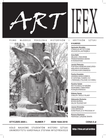 ART PISMO MŁODEGO POKOLENIA HISTORYKÓW I IFEX KRYTYKÓW SZTUKI W NUMERZE: Agnieszka Skrodzka FUNDACJE ARTYSTYCZNE WOJCIECHA JASTRZĘBCA Anna Balik MIEJSCE I ZNACZENIE PRZEDSTAWIENIA DEESIS W IKONOSTASIE Jarmila Piekarska PORTIERA HERBOWA KANCLERZA WIELKIEGO KORONNEGO STEFANA KORYCIŃSKIEGO Paulina Kowalska GDAŃSKA MODA KOBIECA W OSTATNIEJ ĆWIERCI XVI I PIERWSZEJ POŁOWIE XVII WIEKU Karolina Vyšata MOTYW ANIOŁA W RZEŹBIE NAGROBNEJ CMENTARZA POWĄZKOWSKIEGO Elżbieta Pękała CHAŁUPY OKOLIC PILAWY Aleksandra Zientecka BOGNA BURSKA SALON TELEWIZYJNY Joanna Kinowska ŁÓDŹ BIENNALE KONSTRUKCJA W PROCESIE 8? Romana Rupiewicz PIERWSZE UJRZENIE ŚWIATA STYCZEŃ 2005 r. NUMER 7 ISSN 1644-3519 KOŁO NAUKOWE STUDENTÓW HISTORII SZTUKI UNIWERSYTETU KARDYNAŁA STEFANA WYSZYŃSKIEGO CENA 6 zł http://free.art.pl/artifex 36 ARTYKUŁY FUNDACJE ARTYSTYCZNE WOJCIECHA JASTRZĘBCA. ZARYS PROBLEMATYKI AGNIESZKA SKRODZKA MIEJSCE I ZNACZENIE PRZEDSTAWIENIA DEESIS W IKONOSTASIE ANNA BALIK PORTIERA HERBOWA KANCLERZA KORONNEGO STEFANA KORYCIŃSKIEGO (1653-1658) JARMILA PIEKARSKA SPRAWOZDANIE Z WYJAZDU INWENTARYZACYJNEGO NA UKRAINĘ JÓZEFINA SIKORSKA 4 WYSTAWY 10 34 INSPIRACJE GALERIA KULUARY W CENTRUM SZTUKI STUDIO ANNA BALIK 37 BOGNA BURSKA SALON TELEWIZYJNY ALEKSANDRA ZIENTECKA 15 GDAŃSKA MODA KOBIECA W OSTATNIEJ ĆWIERCI XVI I PIERWSZEJ POŁOWIE XVII WIEKU PAULINA KOWALSKA 19 38 ŁÓDŹ BIENNALE KONSTRUKCJA W PROCESIE 8? JOANNA KINOWSKA MOTYW ANIOŁA W RZEŹBIE NAGROBNEJ CMENTARZA POWĄZKOWSKIEGO KAROLINA VYŠATA 25 40 PIERWSZE UJRZENIE ŚWIATA ROMANA RUPIEWICZ CHAŁUPY OKOLIC PILAWY ELŻBIETA PĘKAŁA 29 RECENZJE KOŁO NAUKOWE DZIAŁALNOŚĆ KOŁA NAUKOWEGO W 2004 ROKU 33 41 NA MARGINESIE KSIĄŻKI JOANNY SOSNOWSKIEJ “POZA KANONEM” BARTŁOMIEJ GUTOWSKI 42 SKAŁA NAD ZBRUCZEM DZIEJE ARCHITEKTURA BUDOWNICTWO BARTŁOMIEJ GUTOWSKI PIS M O K O Ł A N A U K O W E G O S T U D E N T Ó W H I S TO RII SZTUKI UNIWERSYTETU KARDYNAŁA STEFANA WYSZYŃSKIEGO Opieka naukowa: prof. dr hab. Zbigniew Bania Redakcja: Anna Balik, Bartłomiej Gutowski, Piotr Janowczyk, Joanna Kinowska, Milena Niebrzydowska, Małgorzata Rekosz, Maciej Sikorzak, Agnieszka Skrodzka, Anna Wigna, Rafał Witkowski Opracowanie graficzne: Maciej Sikorzak Kontakt z redakcją: 688 95 48 ■ [email protected] ■ http://free.art.pl/artifex Redakcja zastrzega sobie prawo wprowadzania zmian w tekstach. Na okładce: figura anioła z nagrobka rodziny Kozłowskich, T. Skonieczny, 1895, fot. Karolina Vyšata Wydane dzięki dofinansowaniu przez UNIWERSYTET KARDYNAŁA STEFANA WYSZYŃSKIEGO W WARSZAWIE 2 Ukazał się kolejny, siódmy numer Artifexu. Wraz z upływającym czasem przyszła pora na poszerzenie redakcji o kolejne osoby, reprezentantów obecnych studentów. Dołączyli do nas: Anna Balik (studentka V roku), Milena Niebrzydowska (studentka II roku), Małgorzata Rekosz (studentka V roku), Agnieszka Skrodzka (studentka V roku), Anna Wigna (studentka II roku) oraz Rafał Witkowski (student V roku) zajmujący się przede wszystkim redakcją wersji internetowej pisma. Formuła, którą w kolejnych latach udało nam się wypracować, zakłada ciągłe zmiany w kolegium redakcyjnym. Wierzymy, iż uda się ją utrzymać. Zapraszamy do aktywnej pracy nad tworzeniem Artifexu wszystkich studentów IHS UKSW. Jeżeli macie interesujące pomysły na dalsze nasze funkcjonowanie lub po prostu chcecie się aktywnie włączyć w naszą działalność, to bardzo serdecznie zapraszamy. Znajdziecie nas na uczelni lub w Internecie, skontaktujcie się, przyjdźcie na spotkanie redakcyjne. Dzięki temu czasopismo będzie nie tylko dla Was, ale również Wasze. Od pewnego czasu obserwujemy coraz większą aktywność naszych koleżanek i kolegów studiujących historię sztuki i historię kultury na studiach zaocznych. Przykładem tego może być tekst zamieszczony w tym numerze autorstwa Elżbiety Pękali o chałupach drewnianych z okolic Pilawy. Liczymy, iż wśród Was również znajdą się osoby gotowe poświęcić swój czas dla pisma. Jednym z zadań, które postawiliśmy sobie od samego początku, jeszcze zanim w czerwcu 2000 roku ukazał się pierwszy numer, jest nie tylko publikowanie tekstów autorskich oraz skrótów prac magisterskich i seminaryjnych, a więc dorobku intelektualnego młodych historyków sztuki IHS UKSW, ale również pobudzanie aktywności. Pragniemy, aby wokół Artifexu tworzyło się środowisko młodych historyków sztuki. Tak naprawdę tylko wówczas nasza praca ma sens. INFORMACJE ■ 19 listopada 2004 roku podczas walnego zebrania członków Koła Naukowego Studentów i Absolwentów Historii Sztuki UKSW wybrany został nowy skład władz. Prezesem została Maria Wierzchoś ([email protected]), sekretarzem Aneta Baczyńska, a skarbnikiem Józefina Sikorska. ■ W ostatnim czasie ukazała się książka Pastorały w Polsce autorstwa Katarzyny Bogackiej, wydana nakładem „Michalineum”. Pozycja opracowana została na podstawie pracy doktorskiej pt. Ikonografia i treści ideowe dekoracji średniowiecznych i nowożytnych pastorałów w Polsce napisanej pod kierunkiem ks. prof. dra hab. Stanisława Kobielusa i obronionej w roku 1997. ■ Grupa osób związanych z IHS UKSW w roku 2005 będzie kontynuować badania mające na celu opracowanie inwentaryzacyjne cmentarza katolickiego w Czerniowcach (Bukowina) oraz układu architektoniczno-urbanistycznego miasta. ■ 17 grudnia w Oddziale Warszawskim Stowarzyszenia Historyków Sztuki odbył się uroczysty jubileusz z okazji 50-lecia pracy naukowej i dydaktycznej Profesora dra hab. Andrzeja K. Olszewskiego. Oprócz słów o Jubilacie wygłoszonych przez Profesor Kingę Szczepkowską-Naliwajek i Profesora Zbigniewa Banię, zaprezentowane zostały przez Profesora Wiesława Wysockiego i ks. Profesora Józefa Mandziuka numery pism Saeculum Christianum i Artifex dedykowane Profesorowi. Spotkanie prowadził ks. Profesor Michał Janocha. Są osoby, bez których pracy i zaangażowania nasza dzia
