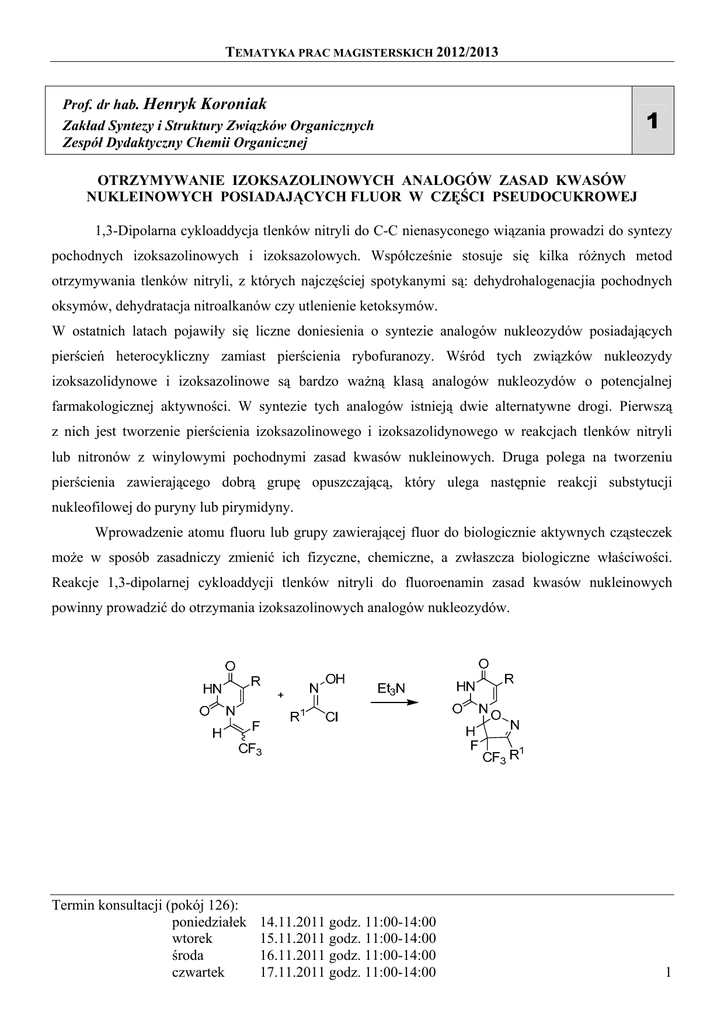 TEMATYKA PRAC MAGISTERSKICH 2012/2013 Prof. dr hab. Henryk Koroniak Zakład Syntezy i Struktury Związków Organicznych Zespół Dydaktyczny Chemii Organicznej 1 OTRZYMYWANIE IZOKSAZOLINOWYCH ANALOGÓW ZASAD KWASÓW NUKLEINOWYCH POSIADAJĄCYCH FLUOR W CZĘŚCI PSEUDOCUKROWEJ 1,3-Dipolarna cykloaddycja tlenków nitryli do C-C nienasyconego wiązania prowadzi do syntezy pochodnych izoksazolinowych i izoksazolowych. Współcześnie stosuje się kilka różnych metod otrzymywania tlenków nitryli, z których najczęściej spotykanymi są: dehydrohalogenacjia pochodnych oksymów, dehydratacja nitroalkanów czy utlenienie ketoksymów. W ostatnich latach pojawiły się liczne doniesienia o syntezie analogów nukleozydów posiadających pierścień heterocykliczny zamiast pierścienia rybofuranozy. Wśród tych związków nukleozydy izoksazolidynowe i izoksazolinowe są bardzo ważną klasą analogów nukleozydów o potencjalnej farmakologicznej aktywności. W syntezie tych analogów istnieją dwie alternatywne drogi. Pierwszą z nich jest tworzenie pierścienia izoksazolinowego i izoksazolidynowego w reakcjach tlenków nitryli lub nitronów z winylowymi pochodnymi zasad kwasów nukleinowych. Druga polega na tworzeniu pierścienia zawierającego dobrą grupę opuszczającą, który ulega następnie reakcji substytucji nukleofilowej do puryny lub pirymidyny. Wprowadzenie atomu fluoru lub grupy zawierającej fluor do biologicznie aktywnych cząsteczek może w sposób zasadniczy zmienić ich fizyczne, chemiczne, a zwłaszcza biologiczne właściwości. Reakcje 1,3-dipolarnej cykloaddycji tlenków nitryli do fluoroenamin zasad kwasów nukleinowych powinny prowadzić do otrzymania izoksazolinowych analogów nukleozydów. Termin konsultacji (pokój 126): poniedziałek wtorek środa czwartek 14.11.2011 godz. 11:00-14:00 15.11.2011 godz. 11:00-14:00 16.11.2011 godz. 11:00-14:00 17.11.2011 godz. 11:00-14:00 1 TEMATYKA PRAC MAGISTERSKICH 2012/2013 Prof. dr hab. Henryk Koroniak Zakład Syntezy i Struktury Związków Organicznych Zespół Dydaktyczny Chemii Organicznej 2 REAKCJE 1,3-DIPOLARNEJ CYKLOADDYCJI PODSTAWIONYCH NITRONÓW DO FLUOROENAMIN ZASAD KWASÓW NUKLEINOWYCH Związki fluoroorganiczne posiadają szerokie zastosowanie jako farmaceutyki, środki ochrony roślin, polimery oraz jako związki budulcowe w syntezie pochodnych o szerokim spektrum aktywności biologicznej. Selektywne wprowadzenie atomu fluoru lub grupy zawierającej fluor do biologicznie aktywnych cząsteczek może w sposób zasadniczy zmienić ich fizyczne, chemiczne i biologiczne właściwości. W ostatnich latach pojawił się szereg publikacji dotyczących syntezy analogów nukleozydów posiadających pierścień izoksazolidynowy zamiast pierścienia rybofuranozy. Synteza tych analogów opierała się między innymi na reakcji nitronów z dipolarofilami jakimi były N-winylo- i N-allilopochodne zasad kwasów nukleinowych. Niektóre z tych analogów wykazywały wysoką cytostatyczną aktywność [1] Fluorowane enaminy zasad kwasów nukleinowych są dobrymi dipolarofilami w reakcjach 1,3dipolarnej cykloaddycji z odpowiednimi dipolami. Reakcje czystych stereoizomerów E i Z tetrafluoropropenylowych enamin zasad kwasów nukleinowych z podstawionymi nitronami powinny dawać dwie pary rozróżnialnych diastereoizomerycznych izoksazolidynowych analogów nukleozydów zawierających fluor w części pseudocukrowej. [1] U. Chiacchio, A. Padwa, G. Romeo, Curr. Org. Chem. 13 (2009) 422-447. Termin konsultacji (pokój 126): poniedziałek wtorek środa czwartek 14.11.2011 godz. 11:00-14:00 15.11.2011 godz. 11:00-14:00 16.11.2011 godz. 11:00-14:00 17.11.2011 godz. 11:00-14:00 2 TEMATYKA PRAC MAGISTERSKICH 2012/2013 Prof. dr hab. Henryk Koroniak Zakład Syntezy i Struktury Związków Organicznych Zespół Dydaktyczny Chemii Organicznej 3 SYNTEZA I WŁASNOŚCI SPEKTRALNE FLUOROWANYCH POCHODNYCH FOSFONIANOWYCH O POTENCJALNEJ AKTYWNOŚCI BIOLOGICZNEJ Podstawienie atomu wodoru lub grupy hydroksylowej atomem fluoru pozwala na uzyskanie grupy związków organicznych charakteryzujących się szeroko wykorzystywanymi, a dodatkowo często zaskakującymi właściwościami. Reakcje selektywnego wprowadzenie atomu fluoru do cząsteczki cieszą się wielkim zainteresowaniem związanym z głębokim wpływem tego podstawnika na ich aktywność biologiczną. Pochodne fosfonianowe, posiadające grupę monofluorometylenową, charakteryzują się znaczną stabilnością hydrolityczną, szczególnie w porównaniu z naturalnie występującymi fosforanami. Znalazły one już wiele zastosowań m.in. jako inhibitory różnego typów kinaz oraz fosfataz. Celem pracy jest synteza monofluorometylenowych pochodnych fosfonianowych jako związków o potencjalnej aktywności przeciw osteoporozie i właściwościach antynowotworowych. Termin konsultacji (pokój 126): poniedziałek wtorek środa czwartek 14.11.2011 godz. 11:00-14:00 15.11.2011 godz. 11:00-14:00 16.11.2011 godz. 11:00-14:00 17.11.2011 godz. 11:00-14:00 3 TEMATYKA PRAC MAGISTERSKICH 2012/2013 Prof. dr hab. Henryk Koroniak Zakład Syntezy i Struktury Związków Organicznych Zespół Dydaktyczny Chemii Organicznej 4 SYNTEZA gem- DIFLUOROMETYLENOWYCH POCHODNYCH ESTRU KWASU FOSFONOWEGO O POTENCJALNEJ AKTYWNOŚCI PRZECIW OSTEOPOROZIE Wprowadzenie atomu fluoru do cząsteczki w olbrzymim stopniu zmienia zarówno właściwości fizyczne, jak i chemiczne związków organicznych. Liczne fluorowane pochodne organiczne wykorzystywane są w terapii antynowotworowej, posiadają także właściwości przeciwbakteryjne. Grupa difluorometylenowa wykorzystywana jest jako izoelektronowy i izosteryczny substytut tlenu w analogach fosforanów wykorzystywanych głównie jako leki przeciw osteoporozie. Synteza fluorowanych analogów fosfonianowych może stanowić interesujący przykład wpływu atomów fluoru na właściwości fizyczne, chemiczne oraz potencjalnie na aktywność biologiczną. R2 O NH2 P EtO EtO Termin konsultacji (pokój 