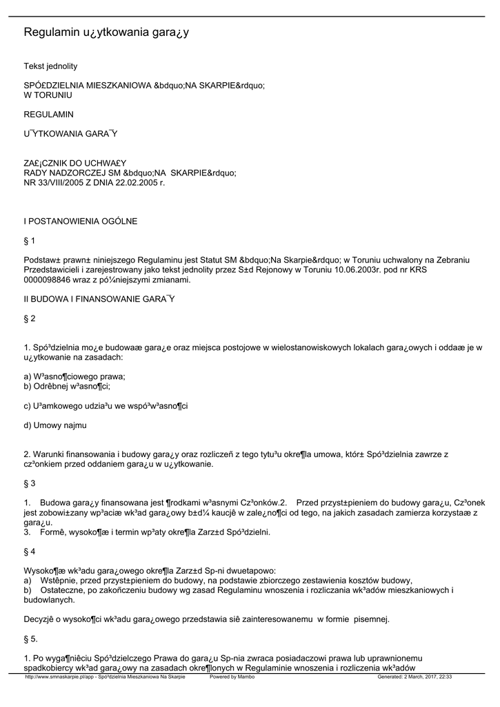 Regulamin u¿ytkowania gara¿y Tekst jednolity SPÓ£DZIELNIA MIESZKANIOWA „NA SKARPIE” W TORUNIU REGULAMIN U¯YTKOWANIA GARA¯Y ZA£¡CZNIK DO UCHWA£Y RADY NADZORCZEJ SM „NA SKARPIE” NR 33/VIII/2005 Z DNIA 22.02.2005 r. I POSTANOWIENIA OGÓLNE §1 Podstaw± prawn± niniejszego Regulaminu jest Statut SM „Na Skarpie” w Toruniu uchwalony na Zebraniu Przedstawicieli i zarejestrowany jako tekst jednolity przez S±d Rejonowy w Toruniu 10.06.2003r. pod nr KRS 0000098846 wraz z pó¼niejszymi zmianami. II BUDOWA I FINANSOWANIE GARA¯Y §2 1. Spó³dzielnia mo¿e budowaæ gara¿e oraz miejsca postojowe w wielostanowiskowych lokalach gara¿owych i oddaæ je w u¿ytkowanie na zasadach: a) W³asno¶ciowego prawa; b) Odrêbnej w³asno¶ci; c) U³amkowego udzia³u we wspó³w³asno¶ci d) Umowy najmu 2. Warunki finansowania i budowy gara¿y oraz rozliczeñ z tego tytu³u okre¶la umowa, któr± Spó³dzielnia zawrze z cz³onkiem przed oddaniem gara¿u w u¿ytkowanie. §3 1. Budowa gara¿y finansowana jest ¶rodkami w³asnymi Cz³onków.2. Przed przyst±pieniem do budowy gara¿u, Cz³onek jest zobowi±zany wp³aciæ wk³ad gara¿owy b±d¼ kaucjê w zale¿no¶ci od tego, na jakich zasadach zamierza korzystaæ z gara¿u. 3. Formê, wysoko¶æ i termin wp³aty okre¶la Zarz±d Spó³dzielni. §4 Wysoko¶æ wk³adu gara¿owego okre¶la Zarz±d Sp-ni dwuetapowo: a) Wstêpnie, przed przyst±pieniem do budowy, na podstawie zbiorczego zestawienia kosztów budowy, b) Ostateczne, po zakoñczeniu budowy wg zasad Regulaminu wnoszenia i rozliczania wk³adów mieszkaniowych i budowlanych. Decyzjê o wysoko¶ci wk³adu gara¿owego przedstawia siê zainteresowanemu w formie pisemnej. § 5. 1. Po wyga¶niêciu Spó³dzielczego Prawa do gara¿u Sp-nia zwraca posiadaczowi prawa lub uprawnionemu spadkobiercy wk³ad gara¿owy na zasadach okre¶lonych w Regulaminie wnoszenia i rozliczenia wk³adów http://www.smnaskarpie.pl/app - Spó³dzielnia Mieszkaniowa Na Skarpie Powered by Mambo Generated: 2 March, 2017, 22:33 mieszkaniowych budowlanych (wg wyceny dokonanej przez rzeczoznawcê). 2. Nowy posiadacz prawa do gara¿u na rzecz, którego ustanawia siê w³asno¶ciowe prawo do zwolnionego gara¿u jest zobowi±zany wnie¶æ wk³ad gara¿owy w wysoko¶ci kwoty wyp³aconej poprzedniemu u¿ytkownikowi. 3. Rozliczenie z by³ym u¿ytkownikiem gara¿u lub ze spadkobierc± nastêpuje na dzieñ wyga¶niêcia Spó³dzielczego prawa do gara¿u, a wyp³ata nastêpuje nie pó¼niej ani¿eli w ci±gu 3 m-cy od dnia wyga¶niêcia prawa ( w razie postêpowania o stwierdzenie nabycia spadku, nie pó¼niej ani¿eli w ci±gu 3 m-cy od zawiadomienia Sp-ni o stwierdzenie nabycia spadku). § 6. Z wyp³aconego wk³adu gara¿owego Sp-nia ma prawo dokonaæ potr±ceñ tytu³u: 1. 2. 3. Zaleg³o¶ci czynszowych za u¿ytkowanie gara¿u; Nale¿no¶ci z tytu³u zleconych us³ug dotycz±cych eksploatacji gara¿u; Innych nale¿no¶ci zwi±zanych z u¿ytkowaniem gara¿u, a ustalonych protoko³em zdawczo-odbiorczym. III USTANOWIENIE PRAWA DO GARA¯U § 7. Prawo do gara¿u powstaje z chwil± zawarcia umowy o ustanowieniu w³asno¶ciowego prawa pomiêdzy Spó³dzielni± a Cz³onkiem spó³dzielni lub aktu notarialnego umowy kupna-sprzeda¿y na rynku wtórnym dla skuteczno¶ci, którego nie jest wymagane cz³onkostwo w Spó³dzielni. § 8. Spó³dzielcze w³asno¶ciowe prawo do gara¿u jest zbywalne i podlega dziedziczeniu oraz egzekucji niezale¿nie od charakteru prawa do lokalu mieszalnego przys³uguj±cego posiadaczowi prawa. § 9. Do istniej±cego Spó³dzielczego w³asno¶ciowego prawa do gara¿u stosuje siê odpowiednio przepisy o spó³dzielczym w³asno¶ciowym prawie do lokalu mieszkalnego. § 10. Do ustanowienia na rzecz posiadacza spó³dzielczego w³asno¶ciowego prawa, odrêbnej w³asno¶ci do gara¿u stosuje siê odpowiednio przepisy o odrêbnej w³asno¶ci lokalu mieszkalnego. § 11. Spó³dzielcze w³asno¶ciowe prawo do gara¿u wygasa z chwil±: 1. 2. 3. 4. 5. Ustania cz³onkostwa w sp-ni. Zrzeczenia siê przez posiadacza prawa na rzecz Sp-ni. Cofniêcie decyzji o ustanowieniu prawa. Zbycia prawa do gara¿u. Zgonu posiadacza spó³dzielczego w³asno¶ciowego prawa. IV PRZYDZIA£ MIEJSC PARKINGOWYCH WYBUDOWANYCH WRAZ BUDYNKIEM MIESZKALNYM NA TERENIE OGRODZONYM, PRZYNALE¯NYM DO TEGO BUDYNKU. § 12. Miejsca parkingowe winny byæ wydzielone w ramach wygrodzonego obszaru budynku w celu zaspokojenia potrzeb parkowania pojazdów mieszkañców otrzymuj±cych prawo do lokalu mieszkalnego w tym budynku. § 13. 1. Przydzia³ miejsca parkingowego dokonuje siê pod warunkiem: - Wniesienia pe³nej odp³atno¶ci z tytu³u poniesionych kosztów na urz±dzenie miejsca parkingowego, okre¶lonych w umowie – nie pó¼niej ni¿ do daty przydzia³u miejsca.- Posiadania prawa do lokalu mieszkalnego w budynku, w obrêbie którego jest urz±dzone miejsce parkingowe 2. Przydzielone miejsce parkingowe nie podlega zbyciu na rzecz osób trzecich, bez zgody Sp-ni. http://www.smnaskarpie.pl/app - Spó³dzielnia Mieszkaniowa Na Skarpie Powered by Mambo Generated: 2 March, 2017, 22:33 § 14. Zbycie przez posiadacza prawa do lokalu mieszkalnego w budynku, z którym zwi±zane jest miejsce parkingowe jest równoznaczne z utrat± prawa do przydzielonego miejsca parkingowego. W takim przypadku Sp-nia zwróci temu posiadaczowi warto¶æ wniesionych ¶rodków finansowych z tytu³u urz±dzenia miejsca parkingowego, z uwzglêdnieniem stopnia jego zu¿ycia. § 15. 1. Pierwszeñstwo przydzia³u miejsca parkingowego zwolnionego na skutek zbycia prawa do lokalu mieszkalnego przys³uguje osobie, która naby³a prawo do lokalu po uprzednim w³a¶cicielu. 2. W razie rezygnacji z miejsca parkingowego przez nowego posiadacza prawa do lokalu, Zarz±d przydzieli to miejsce w pierwszej kolejno¶ci na rzecz innego posiadacza tytu³u prawnego do lokalu mieszkalnego w tym budynku. V U¯YTKOWANIE GARA¯Y § 16. Gara¿ mo¿e byæ u¿ywany wy³±cznie na cele przechowywania pojazdów me