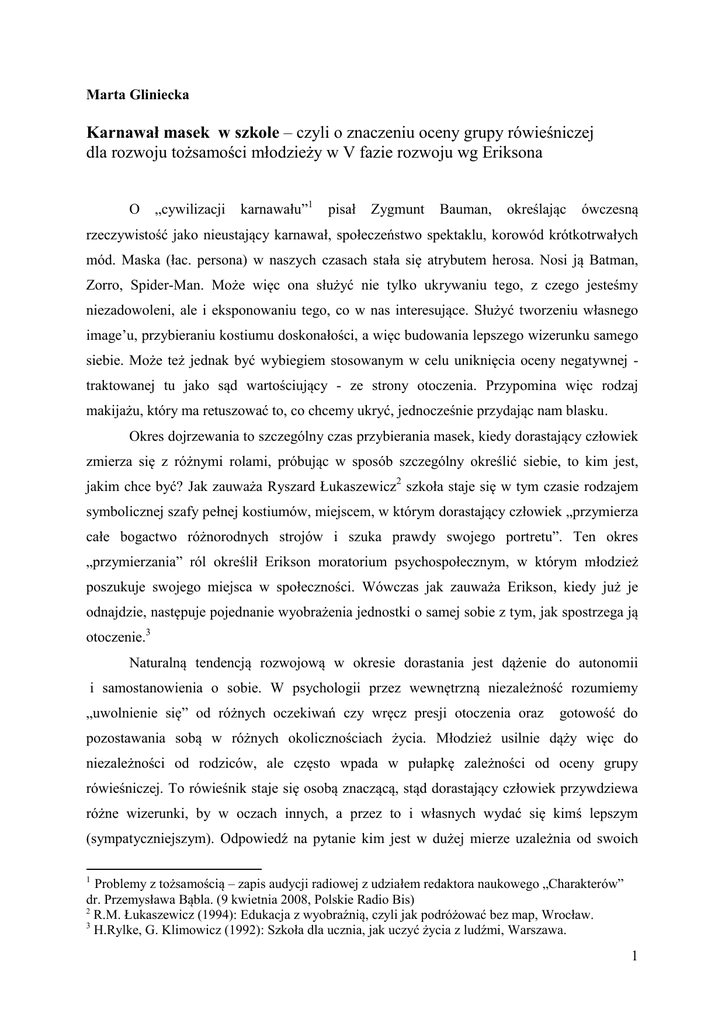 Marta Gliniecka Karnawał masek w szkole – czyli o znaczeniu oceny grupy rówieśniczej dla rozwoju tożsamości młodzieży w V fazie rozwoju wg Eriksona O „cywilizacji karnawału”1 pisał Zygmunt Bauman, określając ówczesną rzeczywistość jako nieustający karnawał, społeczeństwo spektaklu, korowód krótkotrwałych mód. Maska (łac. persona) w naszych czasach stała się atrybutem herosa. Nosi ją Batman, Zorro, Spider-Man. Może więc ona służyć nie tylko ukrywaniu tego, z czego jesteśmy niezadowoleni, ale i eksponowaniu tego, co w nas interesujące. Służyć tworzeniu własnego image’u, przybieraniu kostiumu doskonałości, a więc budowania lepszego wizerunku samego siebie. Może też jednak być wybiegiem stosowanym w celu uniknięcia oceny negatywnej traktowanej tu jako sąd wartościujący - ze strony otoczenia. Przypomina więc rodzaj makijażu, który ma retuszować to, co chcemy ukryć, jednocześnie przydając nam blasku. Okres dojrzewania to szczególny czas przybierania masek, kiedy dorastający człowiek zmierza się z różnymi rolami, próbując w sposób szczególny określić siebie, to kim jest, jakim chce być? Jak zauważa Ryszard Łukaszewicz2 szkoła staje się w tym czasie rodzajem symbolicznej szafy pełnej kostiumów, miejscem, w którym dorastający człowiek „przymierza całe bogactwo różnorodnych strojów i szuka prawdy swojego portretu”. Ten okres „przymierzania” ról określił Erikson moratorium psychospołecznym, w którym młodzież poszukuje swojego miejsca w społeczności. Wówczas jak zauważa Erikson, kiedy już je odnajdzie, następuje pojednanie wyobrażenia jednostki o samej sobie z tym, jak spostrzega ją otoczenie.3 Naturalną tendencją rozwojową w okresie dorastania jest dążenie do autonomii i samostanowienia o sobie. W psychologii przez wewnętrzną niezależność rozumiemy „uwolnienie się” od różnych oczekiwań czy wręcz presji otoczenia oraz gotowość do pozostawania sobą w różnych okolicznościach życia. Młodzież usilnie dąży więc do niezależności od rodziców, ale często wpada w pułapkę zależności od oceny grupy rówieśniczej. To rówieśnik staje się osobą znaczącą, stąd dorastający człowiek przywdziewa różne wizerunki, by w oczach innych, a przez to i własnych wydać się kimś lepszym (sympatyczniejszym). Odpowiedź na pytanie kim jest w dużej mierze uzależnia od swoich Problemy z tożsamością – zapis audycji radiowej z udziałem redaktora naukowego „Charakterów” dr. Przemysława Bąbla. (9 kwietnia 2008, Polskie Radio Bis) 2 R.M. Łukaszewicz (1994): Edukacja z wyobraźnią, czyli jak podróżować bez map, Wrocław. 3 H.Rylke, G. Klimowicz (1992): Szkoła dla ucznia, jak uczyć życia z ludźmi, Warszawa. 1 1 relacji interpersonalnych, bo jak mówi Gombrowicz, człowiek jest najbardziej uzależniony od swojego odbicia w duszy innego człowieka, choćby ta dusza była kretyniczna… Ciekawym zjawiskiem jest więc to, iż uczeń przewyższający poziomem intelektualnym resztę grupy, może całkowicie zwątpić w swoje siły, na skutek złośliwej uwagi rówieśnika, który osiąga znacznie niższe od niego rezultaty, ale jest poważany przez grupę. W tym wypadku jego poczucie własnej wartości może ulec gwałtownemu zaniżeniu. Co ma ścisły związek z obniżeniem się jego poczucia podmiotowości, a więc tego jak on sam siebie postrzega. W okresie adolescencji źródłem poznania samego siebie i umocnienia się we własnym „ja” jest porównywanie się z innymi. Okazuje się, że osoby o dużym poczuciu samokontroli są wrażliwe na wskazówki sytuacyjne, przebywając w naszym przypadku - w gronie rówieśników - wiedzą czego dana osoba oczekuje i potrafią się do niej dostroić. Zachowują się więc jak kameleony, które mogą być „kimkolwiek”, bo z łatwością przystosowują się do zmiany otoczenia. Czują się pewniej, naśladując ubiorem, zachowaniem i sposobem myślenia swojego wybranego kolegę czy koleżankę. Jak podkreśla amerykański psycholog Louise Bates4 - jest to bardzo istotny element kształtowania się osobowości nastolatka i nie należy go hamować. I w tym momencie nie zgadzam się z Louisem Bates’em, gdyż to co powinno być przejściowym okresem, często trwa cały czas gimnazjum, a nawet dłużej. I tak osoba, która wcześniej wcale nie stosowała makijażu, nagle zaczyna malować się bardzo jaskrawo w wieku trzynastu lat, by móc przyjaźnić się z koleżankami z klasy… Istniej poważne ryzyko, iż „maska”, którą przybiera, w którymś momencie może stać się twarzą. Bowiem chęć zyskania aprobaty w grupie, często prowadzi do jej niewolniczego naśladownictwa objawiającego się bezkrytycznym przejmowaniem mody, zwyczajów panujących w klasie, co równoznaczne jest z utratą własnego indywidualizmu. „Człowiek pozbawiony wewnętrznej niezależności realizuje w istocie cudze oczekiwana i dążenia. A im bardziej im ulega, tym bardziej rezygnuje z siebie, powodowany zazwyczaj różnego rodzaju lękami”.5 Stąd też ważnym zadaniem nauczyciela w mojej opinii, mogłoby być wspieranie dążeń nastolatka w poszukiwaniu własnego stylu i kształtowanie jego poczucia odrębności, podkreślaniu tego co jest w nim niepowtarzalne oraz wskazywanie mu, iż nadmierne skupienie na sobie (własnym wyglądzie, wypowiedzi, zachowaniu) zmniejsza pewność siebie i czyni kontakty z innymi mniej spontanicznymi, co nie sprzyja budowaniu pozytywnego obrazu samego siebie oraz zmniejsza poczucie wewnętrznej niezależności i pewności siebie. 4 5 L. Bates i inni (1998): Rozwój psychiczny dziecka od 10 do 14 lat, Gdańsk, s. 253. G. Klimowicz (1994) : Dylematy ucznia z doświadczeń dorastającej młodzieży, Warszawa, s.47 2 Jak wynika z badań Grażyny Klimowicz6, uczniowie charakteryzujący się wysokim stopniem wewnętrznej niezależności, pozytywnie oceniają swoje osiągnięcia szkolne, co pot