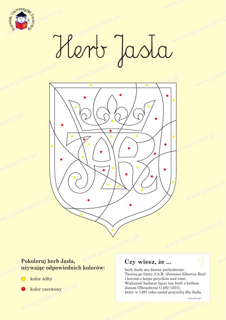 t.p e t rsy e w uni j . w ww et.p t y ers w i un j . w ww t.p e t y ers .ju w ww l l et.p t y rs e w uni j . w ww t.p e t rsy e w uni t rsy e iw n u j w. w w l l yt s r we i n u w.j w w l l et.p .pl t e t rsy e w uni j . w ww rs e w uni j . w ww l et.p .pl t e t rsy e iw n u w.j w w Czy wiesz, że ... kolor żółty t.p e t rsy e w uni j . w ww kolor czerwony iw n u j w. w w t.p e t rsy e w uni j . w ww Pokoloruj herb Jasła, .pl t e t y ers używając odpowiednich kolorów: w uni l et.p t y ers w i un j . w ww l t.p e t rsy e w uni j . ww t.p e t rsy e w uni j . w ww t.p e t rsy e w uni j . w ww et.p t y rs e w uni j . w ww l l l ? ? herb Jasła ma dawne pochodzenie. Tworzą go litery J.A.R. (Joannes Albertus Rex) i korona o kroju gotyckim nad nimi. Większość badaczy łączy ten herb z królem Janem Olbrachtem (1492-1501), który w 1497 roku nadał przywilej dla Jasła. et.p t y rs e w i .jun l ? /www.jaslo.pl/ t.p e t rsy e niw l l ww