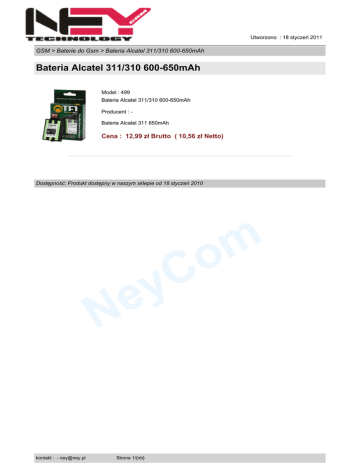Utworzono : 18 styczeń 2011 GSM > Baterie do Gsm > Bateria Alcatel 311/310 600-650mAh Bateria Alcatel 311/310 600-650mAh Model : 499 Bateria Alcatel 311/310 600-650mAh Producent : Bateria Alcatel 311 650mAh Cena : 12,99 zł Brutto ( 10,56 zł Netto) Dostępność: Produkt dostępny w naszym sklepie od 18 styczeń 2010 C y m o e N kontakt : - [email protected] Strona 1/{nb}