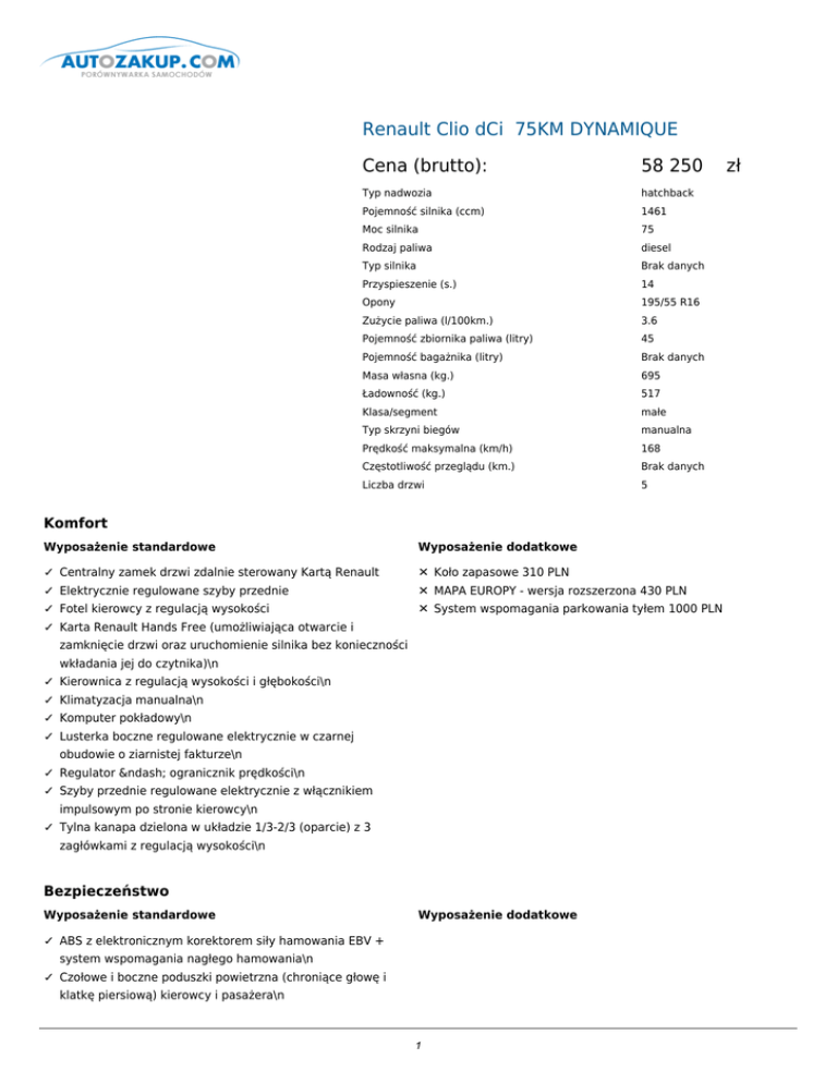 Renault Clio dCi 75KM DYNAMIQUE Cena (brutto): 58 250 Typ nadwozia hatchback Pojemność silnika (ccm) 1461 Moc silnika 75 Rodzaj paliwa diesel Typ silnika Brak danych Przyspieszenie (s.) 14 Opony 195/55 R16 Zużycie paliwa (l/100km.) 3.6 Pojemność zbiornika paliwa (litry) 45 Pojemność bagażnika (litry) Brak danych Masa własna (kg.) 695 Ładowność (kg.) 517 Klasa/segment małe Typ skrzyni biegów manualna Prędkość maksymalna (km/h) 168 Częstotliwość przeglądu (km.) Brak danych Liczba drzwi 5 Komfort Wyposażenie standardowe Wyposażenie dodatkowe ✓ Centralny zamek drzwi zdalnie sterowany Kartą Renault ✕ Koło zapasowe 310 PLN ✓ Elektrycznie regulowane szyby przednie ✕ MAPA EUROPY - wersja rozszerzona 430 PLN ✓ Fotel kierowcy z regulacją wysokości ✕ System wspomagania parkowania tyłem 1000 PLN ✓ Karta Renault Hands Free (umożliwiająca otwarcie i zamknięcie drzwi oraz uruchomienie silnika bez konieczności wkładania jej do czytnika)\n ✓ Kierownica z regulacją wysokości i głębokości\n ✓ Klimatyzacja manualna\n ✓ Komputer pokładowy\n ✓ Lusterka boczne regulowane elektrycznie w czarnej obudowie o ziarnistej fakturze\n ✓ Regulator – ogranicznik prędkości\n ✓ Szyby przednie regulowane elektrycznie z włącznikiem impulsowym po stronie kierowcy\n ✓ Tylna kanapa dzielona w układzie 1/3-2/3 (oparcie) z 3 zagłówkami z regulacją wysokości\n Bezpieczeństwo Wyposażenie standardowe Wyposażenie dodatkowe ✓ ABS z elektronicznym korektorem siły hamowania EBV + system wspomagania nagłego hamowania\n ✓ Czołowe i boczne poduszki powietrzna (chroniące głowę i klatkę piersiową) kierowcy i pasażera\n 1 zł ✓ Światła przeciwmgłowe\n ✓ System dynamicznej kontroli toru jazdy ESP z systemem kontroli trakcji ASR\n ✓ System mocowania fotelików dla dzieci Isofix na bocznych miejscach z tyłu i miejscu pasażera z przodu (tyłem do kierunku jazdy)\n ✓ System wspomagania ruszania pod górę (Hill Start Assist)\n ✓ Zagłówki przednie z regulacją wysokości\n Dodatki Wyposażenie standardowe Wyposażenie dodatkowe ✓ Boczne listwy ochronne i listwa zderzaka tylnego w kolorze ✕ Deska rozdzielcza w kolorze brązowym 0 PLN czarnym o ziarnistej fakturze ✓ Boczne listwy ochronne z chromowaną wstawką i listwa ✕ Deska rozdzielcza w kolorze czerwonym 0 PLN zderzaka tylnego w kolorze czarnym o ziarnistej fakturze ✓ Czujnik światła i deszczu ✕ Deska rozdzielcza w kolorze niebieskim 0 PLN ✓ Deska rozdzielcza w kolorze czarnym (w opcji bezpłatnej ✕ Lakier biel alpejska 0 PLN czerwona, niebieska lub brązowa) ✓ Instalacja do montażu radioodtwarzacza ✕ Lakier brązowy ardent 1800 PLN ✓ Karta Renault ✕ Lakier czarny etoile 1800 PLN ✓ Multimedialny system MEDIA NAV z ekranem dotykowym 7": ✕ Lakier czerwony flamme 2000 PLN radioodtwarzacz 4X20W (bez CD) + nawigacja + Bluetooth® + USB + gniazdo Jack ✓ Ozdobna listwa bagażnika chromowana ✕ Lakier niebieski france 650 PLN ✓ Ozdobne elementy wnętrza w kolorze lśniącej czerni ✕ Lakier szary kasjopea 1800 PLN ✓ Przednia listwa z logo Renault w kolorze lśniącej czerni ✕ Lakier szary platynowy 1800 PLN ✓ Przednia listwa z logo Renault w kolorze lśniącej czerni z ✕ Lakier żółty eclair 650 PLN chromowanymi wstawkami ✓ Skórzana kierownica z dekoracyjnym elementem w kolorze ✕ Lusterka zewnętrzne w kolorze lśniącej czerni 0 PLN lśniącej czerni ✓ Stalowe obręcze kół 16" z kołpakami Fairway (*) ✕ Oklejenie dachowe elegant 1200 PLN ✓ Światła do jazdy dziennej z diodami LED ✕ Oklejenie dachowe sport 1200 PLN ✓ System Renault BASS REFLEX ✕ Oklejenie dachowe trendy 1200 PLN ✓ Tapicerka czarno-szara ( w opcji bezpłatnej czarno-czerwona, ✕ Ozdobne elementy wnętrza w kolorze czerwonym 600 PLN czarno-niebieska lub czarno-brązowa) ✓ Tapicerka czarno-szara (w opcji bezpłatnej czarno-czerwona) ✕ Ozdobne elementy wnętrza w kolorze kości słoniowej 600 PLN ✓ Tapicerka materiałowa czarno-czerwona ✕ Ozdobne elementy wnętrza w kolorze niebieskim 600 PLN ✓ Wewnętrzne klamki drzwi chromowane ✕ Ozdobne elementy wnętrza z motywem elegant 600 PLN ✓ Wstawka w dole kierownicy w kolorze lśniącej czerni ✕ Ozdobne elementy wnętrza z motywem sport 600 PLN ✓ Zespół wskaźników analogowo-cyfrowych ✕ Ozdobne elementy wnętrza z motywem trendy 600 PLN ✓ Zestaw do naprawy opon ✕ Pakiet Look w kolorze lśniącej czerni z chromowanymi ✓ Zewnętrzne klamki drzwi i obudowy lusterek bocznych w ✕ Pakiet Look w kolorze lśniącej czerni z elementami czarnymi elementami 800 PLN kolorze nadwozia 800 PLN ✕ Pakiet Look w kolorze lśniącej czerni z elementami czerwonymi 800 PLN 2 ✕ Pakiet Look w kolorze lśniącej czerni z elementami niebieskimi 800 PLN ✕ Pakiet Look w kolorze lśniącej czerni z elementami w kolorze kości słoniowej 800 PLN ✕ Radioodtwarzacz z systemem 3D Sound by Arkamys, Bluetooth, złączem USB i Jack oraz systemem Bass Reflex 0 ✕ RENAULT PLN R-LINK:multimedialny tablet z ekranem dotykowym 7'', nawigacją Carminat TomTom, radioodtwarzaczem z przestrzennym dźwiękiem 3d Sound by Arkamys, Bluetooth, złączem USB i Jack oraz dostępem informacji na temat samochodu i usług on line 1600 PLN ✕ Tapicerka materiałowa czarno-brązowa 0 PLN ✕ Tapicerka materiałowa czarno-czerwona 0 PLN ✕ Tapicerka materiałowa czarno-niebieska 0 PLN ✕ Wzór felgi 16" passion 0 PLN ✕ Wzór felgi 16" passion, kolor czarny 300 PLN ✕ Wzór felgi 16" passion, kolor kość słoniowa 300 PLN Doprecyzowanie oferty ✕ PAKIET LOOK SPORT - 2000 PLN oklejenie zewnętrzne Sport pakiet look w kolorze lśniącej czerni z wstawkami chromowanymi wewnętrzne elementy ozdobne z motywem Sport wzór felgi 16" Passion kolor czarny ✕ PAKIET LOOK ELEGANT - 2000 PLN oklejenie zewnętrzne Elegant ozdobne elementy wnętrza Elegant pakiet look w kolorze lśniącej czerni z wstawkami chromowanymi wzór felgi 16" Passio