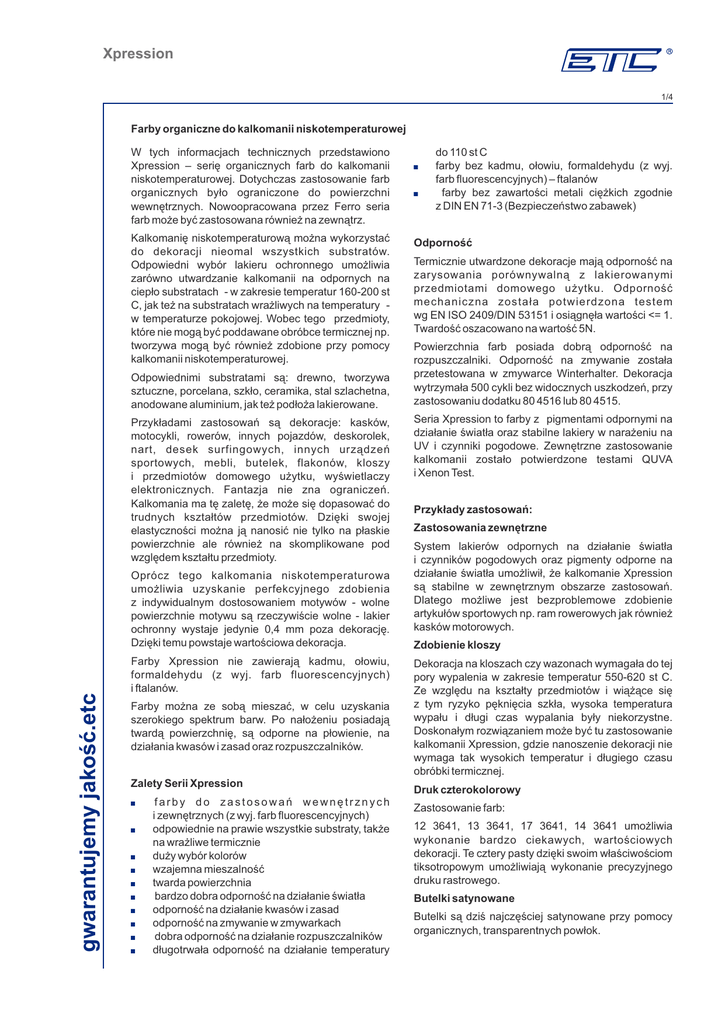 Xpression 1/4 Farby organiczne do kalkomanii niskotemperaturowej W tych informacjach technicznych przedstawiono Xpression – serię organicznych farb do kalkomanii niskotemperaturowej. Dotychczas zastosowanie farb organicznych było ograniczone do powierzchni wewnętrznych. Nowoopracowana przez Ferro seria farb może być zastosowana również na zewnątrz. Kalkomanię niskotemperaturową można wykorzystać do dekoracji nieomal wszystkich substratów. Odpowiedni wybór lakieru ochronnego umożliwia zarówno utwardzanie kalkomanii na odpornych na ciepło substratach - w zakresie temperatur 160-200 st C, jak też na substratach wrażliwych na temperatury w temperaturze pokojowej. Wobec tego przedmioty, które nie mogą być poddawane obróbce termicznej np. tworzywa mogą być również zdobione przy pomocy kalkomanii niskotemperaturowej. Odpowiednimi substratami są: drewno, tworzywa sztuczne, porcelana, szkło, ceramika, stal szlachetna, anodowane aluminium, jak też podłoża lakierowane. Przykładami zastosowań są dekoracje: kasków, motocykli, rowerów, innych pojazdów, deskorolek, nart, desek surfingowych, innych urządzeń sportowych, mebli, butelek, flakonów, kloszy i przedmiotów domowego użytku, wyświetlaczy elektronicznych. Fantazja nie zna ograniczeń. Kalkomania ma tę zaletę, że może się dopasować do trudnych kształtów przedmiotów. Dzięki swojej elastyczności można ją nanosić nie tylko na płaskie powierzchnie ale również na skomplikowane pod względem kształtu przedmioty. gwarantujemy jakość.etc Oprócz tego kalkomania niskotemperaturowa umożliwia uzyskanie perfekcyjnego zdobienia z indywidualnym dostosowaniem motywów - wolne powierzchnie motywu są rzeczywiście wolne - lakier ochronny wystaje jedynie 0,4 mm poza dekorację. Dzięki temu powstaje wartościowa dekoracja. Farby Xpression nie zawierają kadmu, ołowiu, formaldehydu (z wyj. farb fluorescencyjnych) i ftalanów. Farby można ze sobą mieszać, w celu uzyskania szerokiego spektrum barw. Po nałożeniu posiadają twardą powierzchnię, są odporne na płowienie, na działania kwasów i zasad oraz rozpuszczalników. Zalety Serii Xpression farby do zastosowań wewnętrznych i zewnętrznych (z wyj. farb fluorescencyjnych) odpowiednie na prawie wszystkie substraty, także na wrażliwe termicznie duży wybór kolorów wzajemna mieszalność twarda powierzchnia bardzo dobra odporność na działanie światła odporność na działanie kwasów i zasad odporność na zmywanie w zmywarkach dobra odporność na działanie rozpuszczalników długotrwała odporność na działanie temperatury do 110 st C farby bez kadmu, ołowiu, formaldehydu (z wyj. farb fluorescencyjnych) – ftalanów farby bez zawartości metali ciężkich zgodnie z DIN EN 71-3 (Bezpieczeństwo zabawek) Odporność Termicznie utwardzone dekoracje mają odporność na zarysowania porównywalną z lakierowanymi przedmiotami domowego użytku. Odporność mechaniczna została potwierdzona testem wg EN ISO 2409/DIN 53151 i osiągnęła wartości <= 1. Twardość oszacowano na wartość 5N. Powierzchnia farb posiada dobrą odporność na rozpuszczalniki. Odporność na zmywanie została przetestowana w zmywarce Winterhalter. Dekoracja wytrzymała 500 cykli bez widocznych uszkodzeń, przy zastosowaniu dodatku 80 4516 lub 80 4515. Seria Xpression to farby z pigmentami odpornymi na działanie światła oraz stabilne lakiery w narażeniu na UV i czynniki pogodowe. Zewnętrzne zastosowanie kalkomanii zostało potwierdzone testami QUVA i Xenon Test. Przykłady zastosowań: Zastosowania zewnętrzne System lakierów odpornych na działanie światła i czynników pogodowych oraz pigmenty odporne na działanie światła umożliwił, że kalkomanie Xpression są stabilne w zewnętrznym obszarze zastosowań. Dlatego możliwe jest bezproblemowe zdobienie artykułów sportowych np. ram rowerowych jak również kasków motorowych. Zdobienie kloszy Dekoracja na kloszach czy wazonach wymagała do tej pory wypalenia w zakresie temperatur 550-620 st C. Ze względu na kształty przedmiotów i wiążące się z tym ryzyko pęknięcia szkła, wysoka temperatura wypału i długi czas wypalania były niekorzystne. Doskonałym rozwiązaniem może być tu zastosowanie kalkomanii Xpression, gdzie nanoszenie dekoracji nie wymaga tak wysokich temperatur i długiego czasu obróbki termicznej. Druk czterokolorowy Zastosowanie farb: 12 3641, 13 3641, 17 3641, 14 3641 umożliwia wykonanie bardzo ciekawych, wartościowych dekoracji. Te cztery pasty dzięki swoim właściwościom tiksotropowym umożliwiają wykonanie precyzyjnego druku rastrowego. Butelki satynowane Butelki są dziś najczęściej satynowane przy pomocy organicznych, transparentnych powłok. Xpression 2/4 Jeśli butelki wcześniej ozdobi się kalkomanią Xpression, wtedy można warstwę satynującą nanieść przed termicznym utwardzeniem kalki i utwardzić wszystko razem. taki sam papier, jak do druku kalkomanii ceramicznej. Te p a p i e r y z a w i e r a j ą w a r s t w ę i z o l a c y j n ą z wodorozpuszczalnej mieszaniny dekstryn. W praktyce poleca się papiery Trucal Plus - Tullis Russell. Wskazówki do druku Pasty do druku Papier Paleta farb obejmuje 14 podstawowych kolorów oraz 4 farby do druku czterokolorowego i farby metaliczne srebrną i złotą. Do produkcji kalkomanii Xpression można zastosować Nr Produktu 11 3601 12 3601 12 3603 13 3601 13 3602 14 3601 14 3602 17 3601 17 3602 17 3603 17 3604 17 3606 19 3601 19 3602 13 3604 15 3601 12 3641 13 3641 14 3641 17 3641 Kolor Pasta zielona Pasta niebieska Pasta niebieska Pasta żółta Pasta pomarańczowa Pasta czarna Pasta intensywnie czarna Pasta czerwona Pasta czerwona Pasta czerwona Pasta czerwona Pasta fioletowa Pasta biała Pasta intensywnie biała Proszek - złoty Proszek - srebrny Pasta cyan Pasta żółta Pasta czarna Pasta magenta Pantone Green c Process Blue c Reflex Blue c Yellow c Orange 021 c Black c Black c Warm Red c Red 32c 