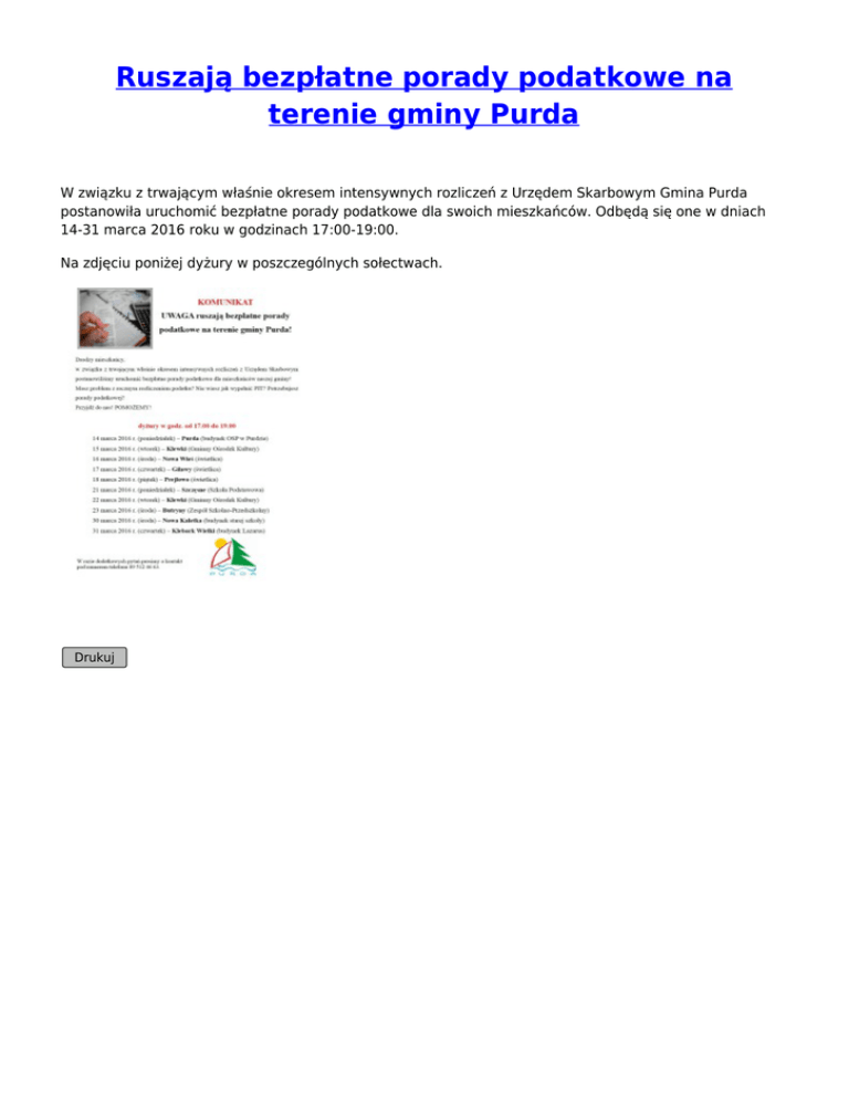 Ruszają bezpłatne porady podatkowe na terenie gminy Purda W związku z trwającym właśnie okresem intensywnych rozliczeń z Urzędem Skarbowym Gmina Purda postanowiła uruchomić bezpłatne porady podatkowe dla swoich mieszkańców. Odbędą się one w dniach 14-31 marca 2016 roku w godzinach 17:00-19:00. Na zdjęciu poniżej dyżury w poszczególnych sołectwach. Drukuj