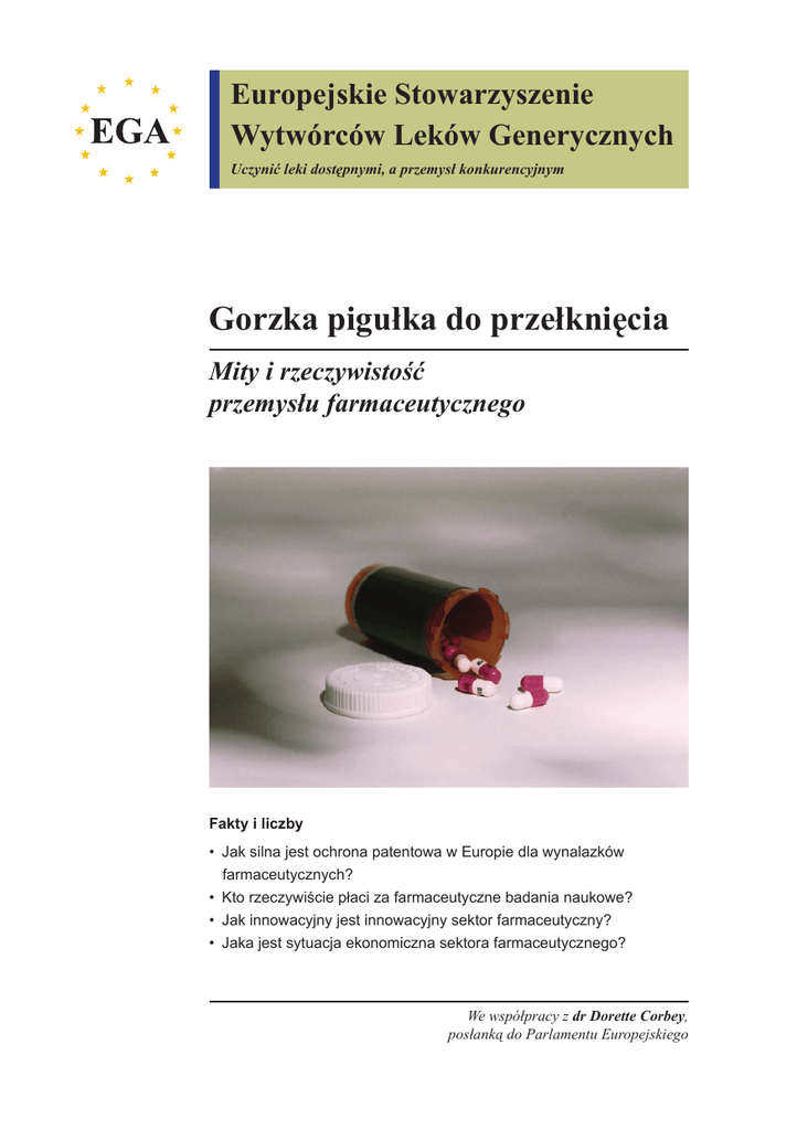 Europejskie Stowarzyszenie Wytwórców Leków Generycznych Uczynić leki dostępnymi, a przemysł konkurencyjnym Gorzka pigułka do przełknięcia Mity i rzeczywistość przemysłu farmaceutycznego Fakty i liczby • Jak silna jest ochrona patentowa w Europie dla wynalazków farmaceutycznych? • Kto rzeczywiście płaci za farmaceutyczne badania naukowe? • Jak innowacyjny jest innowacyjny sektor farmaceutyczny? • Jaka jest sytuacja ekonomiczna sektora farmaceutycznego? We współpracy z dr Dorette Corbey, posłanką do Parlamentu Europejskiego 2 Gorzka pigułka do przełknięcia Europejskie Stowarzyszenie Wytwórców Leków Generycznych 3 Spis treści Wstęp ................................................ 5 Mity i rzeczywistość . . . . . . . . . . . . . . . . . . . . . . . . . . . . . . . . . . . . . . 6 Mit 1: Czas poświęcony na badania naukowe i rozwój . . . . . . . . . . Mit 2: Innowacja a przewaga terapeutyczna . . . . . . . . . . . . . . . . . . Mit 3: Badania naukowe w dziedzinie farmakologii i źródła ich finansowania . . . . . . . . . . . . . . . . . . . . . . . . . . . . . . . . . . Mit 4: Polityka ograniczania kosztów a wyniki sprzedaży firm farmaceutycznych . . . . . . . . . . . . . . . . . . . . . . . . . . . . . . . . . Mit 5: Stopa zysku netto a inwestycje w badania naukowe i rozwój . . . . . . . . . . . . . . . . . . . . . . . . . . . . . . . . . . . . . . . . . Mit 6: Zwrot z kapitału . . . . . . . . . . . . . . . . . . . . . . . . . . . . . . . . . . . Mit 7: Ochrona patentowa produktów farmaceutycznych . . . . . . . . Mit 8: Ochrona rynku leków w Europie . . . . . . . . . . . . . . . . . . . . . . Mit 9: Wygaśnięcie patentu a wyłączność rynkowa . . . . . . . . . . . . Mit 10: Leki generyczne a inwestycje w badania naukowe i rozwój . . . . . . . . . . . . . . . . . . . . . . . . . . . . . . . . . . . . . . . . . 6 8 10 12 14 16 18 20 22 24 Dokąd zmierzamy? . . . . . . . . . . . . . . . . . . . . . . . . . . . . . . . . . . . . . . . 27 O autorach . . . . . . . . . . . . . . . . . . . . . . . . . . . . . . . . . . . . . . . . . . . . . . 30 Dr Dorette Corbey, posłanka do Parlamentu Europejskiego EGA – Europejskie Stowarzyszenie Wytwórców Leków Generycznych 4 Gorzka pigułka do przełknięcia Europejskie Stowarzyszenie Wytwórców Leków Generycznych 5 Wstęp Europejskie Stowarzyszenie Wytwórców Leków Generycznych przedstawia niniejszą broszurę podważającą pewne mity na temat przemysłu farmaceutycznego oraz jego przyszłej pozycji gospodarczej, handlowej i politycznej w Europie. EGA nie atakuje przemysłu leków oryginalnych oraz jego prawa do uzyskiwania należnego zysku. Naszym zamierzeniem jest raczej przedstawienie we właściwej perspektywie niektórych informacji, które są częścią kampanii mającej na celu między innymi zmiany ustawodawstwa regulującego rynek farmaceutyczny tak, aby ograniczyć konkurencję ze strony leków generycznych. EGA chce wykorzystać tę sposobność, by wyrazić poparcie dla ochrony patentowej autentycznych innowacji farmaceutycznych i zobowiązuje się w pełni przestrzegać tej ochrony. Popieramy stworzenie reguł promowania innowacji. Jednakże dalsze wzmacnianie ochrony własności intelektualnej nie poprawi innowacyjności w tej dziedzinie. Zamiast tego Europa powinna skoncentrować wysiłek na: ● Zwiększeniu konkurencji rynkowej ze strony leków generycznych przez eliminację przeszkód dla rejestracji generyków oraz promowanie przepisywania i wydawania leków generycznych. ● Poprawie finansowego i prawnego otoczenia dla innowacji przez wprowadzenie systemów pojedynczej rejestracji i pojedynczego patentu, ułatwiony dostęp do rynków kapitałowych, silniejsze związki między przemysłem a środowiskiem akademickim oraz wsparcie rządowe dla badań naukowych i rozwoju. EGA wierzy, że niniejsze informacje pobudzą owocną debatę, która ostatecznie doprowadzi do stworzenia prawdziwie innowacyjnego i konkurencyjnego środowiska dla farmaceutyków w Europie. Gorzka pigułka do przełknięcia 6 Mit 1 Coraz więcej czasu zajmuje wprowadzenie nowego produktu farmaceutycznego na rynek Wbrew powszechnej opinii czas badań naukowych i rozwoju produktu farmaceutycznego, od badań podstawowych do wprowadzenia produktu na rynek, uległ skróceniu o 38 miesięcy, dając firmom leków oryginalnych ponad 3 dodatkowe lata wyłączności rynkowej – oraz większe zyski z każdego produktu. Skrócenie czasu na badania naukowe i rozwój dla farmaceutyków Czas w miesiącach od badań podstawowych do wprowadzenia produktu na rynek 120 109 96 100 80 71 60 40 20 0 1986–1990 1991–1995 1996–2000 Źródło: „Scrip Magazine”, luty 2002 Europejskie Stowarzyszenie Wytwórców Leków Generycznych 7 Rzeczywistość Czas poświęcony na badania naukowe i rozwój ulega szybkiemu skróceniu Całkowity czas poświęcony na badania naukowe i rozwój uległ skróceniu od roku 1986 do 2002 o 35%. Pomimo narzekań przemysłu, że jest inaczej, dowody są jednoznaczne: czas poświęcony na badania naukowe i rozwój uległ gwałtownemu skróceniu w ciągu ostatnich 15 lat. Rewolucja w zakresie badań naukowych i rozwoju jest tuż przed nami lek. med. Ian Lloyd z Pharmaprojects w czasopiśmie farmaceutycznym „Scrip”, luty 2002. 8 Gorzka pigułka do przełknięcia Mit 2 Nowe drogie leki automatycznie poprawiają leczenie pacjentów Brak istotnej przewagi terapeutycznej 78% 22% Istotna przewaga terapeutyczna Organizacja Public Citizen oszacowała, że co najwyżej około 22% nowych leków wprowadzonych na rynek w ciągu ostatnich dwudziestu lat stanowiły leki innowacyjne, które zapewniają istotną przewagę terapeutyczną Źródło: Public Citizen, lipiec 2001 roku Nie innowacyjne 60 Jedynie 60 z 126 produktów dopuszczonych do obrotu w UE w ciągu pierwszych pięciu lat działania EMEA można uważać za innowacyjne Źródło: Silvio Garattini, Vittorio Bertelé (eksperci EMEA – Europejskiej Agencj