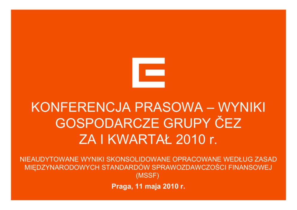 KONFERENCJA PRASOWA – WYNIKI GOSPODARCZE GRUPY ČEZ ZA I KWARTAŁ 2010 r. NIEAUDYTOWANE WYNIKI SKONSOLIDOWANE OPRACOWANE WEDŁUG ZASAD MIĘDZYNARODOWYCH STANDARDÓW SPRAWOZDAWCZOŚCI FINANSOWEJ (MSSF) Praga, 11 maja 2010 r. PROGRAM Główne wyniki i wydarzenia w Grupie ČEZ w I kwartale 2010 r. Martin Roman, dyrektor generalny Wyniki gospodarcze Martin Novák, dyrektor pionu finansowego Pozycja handlowa Grupy ČEZ Michal Skalka, dyrektor działu tradingu 1 GŁÓWNE WYNIKI ZA I KWARTAŁ 2010 R. I OCZEKIWANIA DOTYCZĄCE WYNIKÓW W 2010 R. Data walnego zgromadzenia: 29.6.2010 r. Dzień ustalenia prawa do udziału w walnym zgromadzeniu: 22.6.2010 r. Propozycja zarządu ČEZ, a. s. dotycząca wysokości dywidendy: 53 CZK brutto na akcję, do podziału przeznaczono ok. 55 % skonsolidowanego zysku z 2009 r. Dniem dywidendy jest dzień, w którym odbywa się walne zgromadzenie, czyli 29.6.2010 r. Martina Romana wybrano na członka zarządu spółki MOL, nie będzie jednak należał do kierownictwa wykonawczego. Zysk operacyjny przed amortyzacją (EBITDA) zmniejszył się w stosunku do analogicznego okresu ubiegłego roku o 9,6 % (o 2,9 mld CZK) do 27,3 miliarda CZK. Zysk operacyjny (EBIT) w stosunku do analogicznego okresu ubiegłego roku zmniejszył się o 13 % (3,1 mld CZK) do 21,7 miliarda CZK. Zysk netto jest mniejszy niż w I kwartale ubiegłego roku o 9,9 % (o 1,9 mld CZK) i wynosi 17,5 miliarda CZK. Rentowność kapitału własnego zmniejszyła się w stosunku do analogicznego okresu ubiegłego roku z 27,4 % do 24,5 %. Cena akcji na BCPP oraz GPW na dzień 6.5.2010 r. wynosiła 894 CZK. Oczekiwana wartość EBITDA na 2010 r. pozostaje na poziomie 88,7 miliarda CZK, natomiast oczekiwana wartość zysku netto pozostaje na poziomie 46,7 miliarda CZK. 2 CENA AKCJI ČEZ, A. S. ROŚNIE SZYBCIEJ OD ŚREDNIEJ SPÓŁEK ŚWIADCZĄCYCH USŁUGI KOMUNALNE, W DNIU 6.5.2010 R. AKCJE ZAMKNĘŁY SIĘ NA 894 CZK. 120% 115% przyrost o 3,5 % 1. 1. 2010 6. 5. 2010 894,00 CZK 864,00 CZK 110% 105% 100% 95% 90% 85% z yc t s eń 10 20 ty lu 10 20 c ze r a m 10 20 Bloomberg European Utilities Index kw ń ie c ie PX 10 20 0 01 2 aj m ČEZ, a. s. 3 PROJEKTY GRUPY ČEZ W DZIEDZINIE ENERGETYKI JĄDROWEJ STAWIAJĄ JĄ W CZOŁÓWCE OGÓLNOŚWIATOWEGO TRENDU. Grupa ČEZ popiera cele Unii Europejskiej w zakresie obniżania emisji gazów cieplarnianych. Jednym ze sposobów na ich osiąganie jest właśnie bezemisyjna energetyka jądrowa. Wprowadzenie energetyki jądrowej poważnie rozważają także kraje, w których dotychczas nie była wykorzystywana (Polska, Turcja, ale także np. Arabia Saudyjska, Egipt itp.), inne kraje do niej wracają (Włochy). Korzystne uwarunkowania Republiki Czeskiej i Grupy ČEZ: dostępność fachowców w dziedzinie eksploatacji i budowy elektrowni jądrowych w realizację inwestycji można zaangażować miejscowe firmy, potencjalnym dostawcom przekazaliśmy listę firm, które brały udział w budowie elektrowni jądrowej Temelín zaczęliśmy rozważać budowę dalszych źródeł jądrowych wcześniej od innych państw, dlatego przygotowania są na bardziej zaawansowanym etapie Grupa ČEZ rozważa budowę kilku elektrowni jądrowych w regionie: rozbudowa elektrowni Temelín – trwa przetarg na wykonawcę, przebiega proces EIA budowa w Jaslovskich Bohunicach (Grupa ČEZ jest tutaj partnerem strategicznym) – trwają prace nad studium wykonalności projektu ewentualna budowa w Dukovanach – trwają prace nad studium wykonalności Grupa ČEZ jest jednym z partnerów w projekcie finalizacji budowy elektrowni jądrowej Cernavodă. Projekty jądrowe Grupy ČEZ przyniosą w perspektywie długookresowej korzyści gospodarce czeskiej a także środowisku naturalnemu. 4 GRUPA ČEZ WSPIERA GOSPODARKĘ DOTKNIĘTĄ KRYZYSEM POPRZEZ INWESTYCJE W MODERNIZACJĘ ŹRÓDEŁ RZĘDU DZIESIĄTKÓW MILIARDÓW Kompleksowa modernizacja elektrowni Tušimice II Prace budowlane na II etapie kompleksowej modernizacji elektrowni przebiegają według planu. Na miejscu znajdują się już generatory dla obydwu modernizowanych bloków. Nowy blok o parametrach nadkrytycznych w Ledvicach Prace budowlane przebiegają zgodnie z harmonogramem. Proces betonowania chłodni kominowej jest na etapie jednej trzeciej jej docelowej wysokości. Przygotowania budowy elektrowni parogazowej w Počeradach Kontynuowane są przygotowania budowy zarówno pod względem administracyjnym (odpowiednie zezwolenia), jak również wyłaniania wykonawców. Naprawia się instalacje doprowadzające Przygotowania budowy elektrowni parogazowej ČEZ w Mělníku Trwają przygotowania do projektu. Projekty modernizacji portfela produkcyjnego Grupy ČEZ pomagają gospodarce obecnie i w perspektywie krótko- i średniookresowej, korzyści dla środowiska mają charakter długofalowy. wodę surową, zakończono przygotowanie i opróżnienie placu budowy. 5 DALSZE ZNACZĄCE INWESTYCJE STRUKTURALNE KIEROWANE SĄ DO PROJEKTU FUTUR/E/MOTION Kupujemy pierwsze stacje doładowywania i prowadzimy rozmowy z producentami samochodów na temat wprowadzania e-mobilności w Republice Czeskiej. Pierwsza stacja doładowywania zostanie zbudowana do jesieni 2010 r. bezpośrednio w pobliżu centrali Grupy ČEZ w Pradze. Testujemy nanotechnologie dla paneli fotowoltaicznych. Przygotowujemy się do wejścia w cały szereg projektów badawczych. W projekcie Smart Region w Vrchlabí chcemy przetestować wspólnie wszystkie elementy programu Futur/e/Motion od inteligentnych sieci, poprzez innowacyjne źródła aż po elektromobilność. Projekty FUTUR/E/MOTION zmieniają oblicze czeskiej energetyki; długofalowo przyczyniają się do ochrony środowiska w Republice Czeskiej. 6 POPRZEZ REALIZACJĘ SWYCH PROJEKTÓW GRUPA ČEZ ZAPEWNI PRACĘ DLA DZIESIĄTEK TYSIĘCY OSÓB Do 2020 r. sama Grupa ČEZ potrzebowała będzie co najmniej 12 000 nowych absolwentów kierunków technicznych dla: budowy i obsługi nowych źródeł produkcyjnych, włącznie z rozbudową elektrowni jądrowej Te