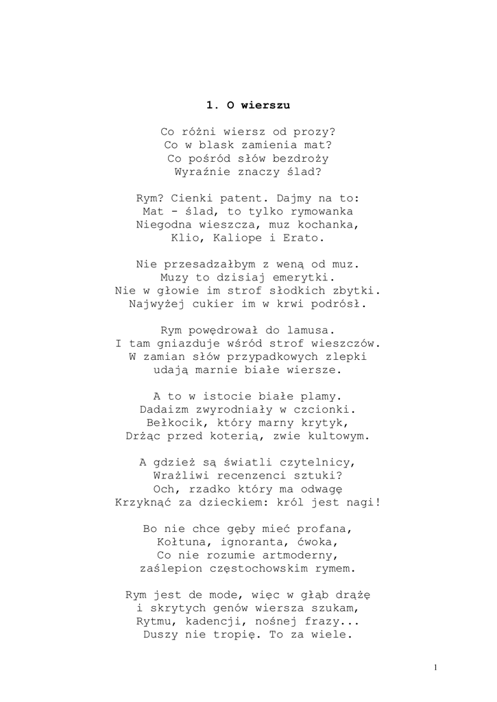 1. O wierszu Co różni wiersz od prozy? Co w blask zamienia mat? Co pośród słów bezdroży Wyraźnie znaczy ślad? Rym? Cienki patent. Dajmy na to: Mat - ślad, to tylko rymowanka Niegodna wieszcza, muz kochanka, Klio, Kaliope i Erato. Nie przesadzałbym z weną od muz. Muzy to dzisiaj emerytki. Nie w głowie im strof słodkich zbytki. Najwyżej cukier im w krwi podrósł. Rym powędrował do lamusa. I tam gniazduje wśród strof wieszczów. W zamian słów przypadkowych zlepki udają marnie białe wiersze. A to w istocie białe plamy. Dadaizm zwyrodniały w czcionki. Bełkocik, który marny krytyk, Drżąc przed koterią, zwie kultowym. A gdzież są światli czytelnicy, Wrażliwi recenzenci sztuki? Och, rzadko który ma odwagę Krzyknąć za dzieckiem: król jest nagi! Bo nie chce gęby mieć profana, Kołtuna, ignoranta, ćwoka, Co nie rozumie artmoderny, zaślepion częstochowskim rymem. Rym jest de mode, więc w głąb drążę i skrytych genów wiersza szukam, Rytmu, kadencji, nośnej frazy... Duszy nie tropię. To za wiele. 1 Rytm znalazł azyl w kamertonie. Pierzchnął gwałcony kakofonią, Co nieporadność zwie arytmią; Żebyż to choć arytmią serca... Nastrój spoczwarzał w nastrójbację. Elektroniczny sens sensorów Zagłusza sens płynący z myśli. Poezja nie ma genotypu!? Coraz więc łatwiej pisać wiersze... Niestety. 2. Relatywizm Południe. Leżę na łące. Patrzę w niebo. Blask słońca masakruje mi oczy. Zrywam dmuchawca. Spoglądam przezeń na rozbestwioną gwiazdę. Dmuchawiec przesłania mi słońce. 3. Fizjologia Podążam drogą pośród pól. Gdzie uleciała woń gleby? Nie czuję zapachu przydrożnych lip. Zrejterowała cała rześkość poranka. Zda się, że w kosmosie zapanował wszechogarniający fetor. A to jedynie żyźniodajny smród gnoju wieszczy dorodne plony. Chce mi się rzygać. 2 4. Political corecnest Spięty niczym saper na polu minowym, Ruszam w gąszcz słów. W głowie dudni mi autocenzura poprawności politycznej. Ogarniają mnie czarne myśli. No proszę, od razu faux pax. Jeszcze jeden taki wyskok... I okrzykną mnie czarnym charakterem. Wykrakałem! Popadam w czarną rozpacz. Fatalnie. Stałem się czarną owcą! Recydywistą rasistą! Muszę dać odpór swym skłonnościom. Biała krowa w kropki bordo... Chyba przesadzam? Mała czarna... Prowokacyjna dwuznaczność. Mały czarny... Murzynek Bambo w Afryce mieszka... Ktoś wali w drzwi. Aktywiści tolerancji? Jaki tam Murzynek! Wołam po niewczasie. W Afryce mieszkają przecież szlachetni Afroafrykańczycy! Na szczęście to tylko listonosz. Dostaję depeszę gratulacyjną od Klux Klu Klanu. 5. Cywilizacja Przez wieś biegł piaszczysty gościniec. Biegł? Człapał raczej przez bliskość od beznadziei po bylejakość. Ech, żeby tak powstał twardy gładki trakt, wzdychali ludzie. Wyrwałby się człowiek w szeroki świat. I wieś przecięła autostrada. Galopowała od doskonałości po szczęśliwość. Tylko bliskość znikła. Bo nie mogąc przedrzeć się przez rwącą rzekę aut, Ludzie nakładają wiele kilometrów, by odwiedzić sąsiadów po drugiej stronie. 3 6. Transcendencja Mądry profesor, koryfeusz wiary oświeconej, Zamknął opasłą księgę. I odstawił ją między takoż dorodne siostrzyce. Rozpierała go satysfakcja. Był coraz bliżej sedna tajemnicy transcendencji. A Wszechmocny popatrzył nań refleksyjnie z niebiańskiego okna. I westchnął: "Świat już chyba zapomniał o przygodzie świętego Augustyna. Znów więc muszę zacząć przelewać łyżeczką wodę Z morza do dołka na plaży". Starowinka analfabetka Położyła bukiecik polnych kwiatków Pod przydrożną kapliczką. W ogóle nie miała pojęcia o transcendencji. Dla niej Panbóg to Panbóg. I tyle. I wówczas Przedwieczny rozpromienił oblicze: "Przynajmniej ona wie co znaczy istota wszechrzeczy". 7. Magia chwili Szli ku sobie po zatłoczonym deptaku. Nagle tłum gdzieś zniknął. I zostali tylko we dwoje. Parli ku swemu przeznaczeniu. On miał ochotę chwycić ją w ramiona I unieść w krainę Nirwany. Ona poczuła dreszcze w lędźwiach. Łono zaczęło jej pulsować. Gdyby ten nieznajomy chwycił ją w ramiona, Przylgnęłaby doń tak mocno jak jeszcze nigdy do nikogo. Byli coraz bliżej siebie. Uskrzydlała ich pewność, że za moment ulegną przeznaczeniu. Minęli się o milimetry, w milczeniu; Obojętnymi twarzami tuszując niebotyczne emocje. I wsiąkli w tłum bezimiennych przechodniów. 4 8. Kroki Pięciolinia osiedlowej alejki. Partytura kroków na kostce Bauma. Łup! Łup! Łup! Spieszony rajtar? Golem? Nie. To tylko Dorodna jejmość, typ księgowej. Kroczy majestatycznie, przerzucając nadmiar kobiecości z biodra na biodro. Szuuur... Szuuur... Szuuur... Stary wiarus bieży z meldunkiem? Idzie żołnierz z niemieckiej niewoli? Nie. To młodzieniec podąża w nieznane. Dawniej taki chód nazywano gminnym. Teraz jest nagminny. Stuk! Stuk! Stuk! Optymistyczne stakato szpileczek. Japonkom od dzieciństwa zakładano ciasne buty I pętano nogi kimonami, By zyskać taki efekt. Dziś japonki to w kontrze do okrutnej historii wygodne klapki. A stuka, zaciskając uda i pośladki, dziewczyna, Której spieszno do toalety. Zaczyna padać deszcz. Czekam na Freda Astera. Może zacznie stepować. 8. Rodowód Kobiety są z Wenus. Mężczyźni z Marsa. A ja jestem z Radomska. 5 9.Zimowa opalenizna Jedni opalają się na nartach w Alpach. Drudzy w solarium. Trzeci smarują twarz samoopalaczem. A on cierpi. Bo wszyscy wiedzą, że jest śniady z natury. I jak tu zaszpanować zimową opalenizną!? 10. Polaków rozmowy Pamiętam z dzieciństwa biesiadne Polaków rozmowy. Leżałem w swoim pokoju. Wartkie dialogi z za ściany nie pozwalały mi usnąć. Z przejęciem nastawiałem uszu. Frazy docierały do mnie wyraźnie. Rozumiałem każde słowo. Choć nie zawsze pojmowałem treść. Teraz dobiega mnie z sąsiedniego pokoju imprezowy gwar. Wyszedłem na chwilę zadzwonić w ważnej sprawie. 