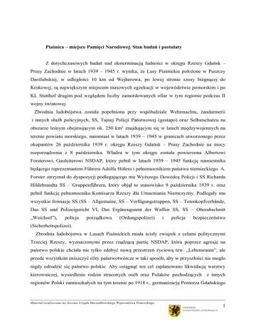 Piaśnica – miejsce Pamięci Narodowej. Stan badań i postulaty Z dotychczasowych badań nad eksterminacją ludności w okręgu Rzeszy Gdańsk – Prusy Zachodnie w latach 1939 – 1945 r. wynika, że Lasy Piaśnickie położone w Puszczy Darżlubskiej, w odległości 10 km od Wejherowa, po lewej stronie szosy biegnącej do Krokowej, są największym miejscem masowych egzekucji w województwie pomorskim i po KL Stutthof drugim pod względem liczby zamordowanych ofiar w tym regionie podczas II wojny światowej. Zbrodnia ludobójstwa została popełniona przy współudziale Wehrmachtu, żandarmerii i innych służb policyjnych, SS, Tajnej Policji Państwowej (gestapo) oraz Selbstschutzu na obszarze leśnym obejmującym ok. 250 km² znajdującym się w latach międzywojennych na terenie powiatu morskiego, natomiast w latach 1939 – 1945 w granicach utworzonego przez okupantów 26 października 1939 r. okręgu Rzeszy Gdańsk – Prusy Zachodnie na mocy rozporządzenia z 8 października. Władza w tym okręgu została powierzona Albertowi Forsterowi, Gauleiterowi NSDAP, który pełnił w latach 1939 – 1945 funkcję namiestnika będącego reprezentantem Führera Adolfa Hitlera i pełnomocnikiem państwa niemieckiego. A. Forster otrzymał do dyspozycji podlegającego mu Wyższego Dowódcę Policji i SS Richarda Hildebrandta SS – Gruppenführera, który objął to stanowisko 9 października 1939 r. oraz pełnił funkcję pełnomocnika Komisarza Rzeszy dla Umacniania Niemczyzny. Podlegały mu wszystkie formacje SS (SS – Allgemaine, SS – Verfügungstruppen, SS – Totenkopfverbände, Das SS und Polizeigericht VI, Das Ergänzugsamt der Waffen SS, SS – Oberabschnitt „Weichsel”), policja porządkowa (Ordungspolizei) i policja bezpieczeństwa (Sicherheitspolizei). Zbrodnia ludobójstwa w Lasach Piaśnickich miała ścisły związek z celami politycznymi Trzeciej Rzeszy, wyznaczonymi przez rządzącą partię NSDAP, która poprzez agresję na państwo polskie chciała nie tylko zdobyć nową przestrzeń życiową tzw. „Lebensraum”, ale przede wszystkim zniszczyć elity państwotwórcze w taki sposób, aby w przyszłości nie mogło nigdy odrodzić się państwo polskie. Aby osiągnąć ten cel zaplanowano likwidację warstwy kierowniczej, wysiedlenie rodzin straconych osób oraz Polaków pochodzących z innych regionów Polski zamieszkałych na tym terenie po 1918 r., germanizację Pomorza Gdańskiego Materiał zrealizowano na zlecenie Urzędu Marszałkowskiego Województwa Pomorskiego 1 i zniemczenie pozostałej ludności pomorskiej oraz zasiedlenie Pomorza Niemcami z krajów nadbałtyckich. Realizacja tych celów spowodowała w latach trzydziestych XX wieku wzmożoną inwigilację polskich środowisk na Pomorzu Gdańskim i Wolnym Mieście Gdańsku przez niemiecki wywiad i policję gdańską. W celu uzyskania informacji wykorzystywano miejscowych mieszkańców narodowości niemieckiej, którzy dobrze znali polskie środowiska. Na niemieckie policyjne listy proskrypcyjne zostali wpisani znani ze swojej patriotycznej działalności mieszkańcy Pomorza Gdańskiego i Wolnego Miasta Gdańska. W specjalnej księdze policyjnej sporządzonej przez niemiecką centralę policji bezpieczeństwa tzw. „Sonderfahndungsbuch Polen” wydanej przed agresją na państwo polskie w Berlinie w 1939 r., figurowało między innymi 130 mieszkańców Gdyni i 290 osób z Wolnego Miasta Gdańska, a także mieszkańcy miast i wiosek Pomorza Gdańskiego oraz Polacy z innych regionów Polski. Pierwsze aresztowania odbyły się 1 września 1939 r. na terenie Wolnego Miasta w ramach „Operacji Tannenberg”, którą kierował szef gdańskiej policji politycznej dr Rudolf Tröger. Nad całością akcji „Unternehmen Tannenberg” czuwał Reinhard Heydrich – szef nowo utworzonego Głównego Urzędu Bezpieczeństwa Rzeszy. Akcja miała być zakończona do 1 listopada 1939 r. przed ustanowieniem na ziemiach zajętych przez Wehrmacht niemieckiej administracji cywilnej. W Gdańsku 1 września 1939 r. aresztowano ok. 1 500 osób, w większości mężczyzn, które znajdowały się na wcześniej przygotowanych przez gdańskie służby policyjne listach proskrypcyjnych. Oblicza się, że jesienią 1939 r. doszło do aresztowania ok. 4 500 członków Polonii gdańskiej, działaczy społeczno – politycznych, członków polskich organizacji i stowarzyszeń, księży, nauczycieli, kupców, przedsiębiorców, bankowców, pracowników Poczty Polskiej w Gdańsku, Polskich Kolei Państwowych, polskich pracowników Rady Portu i Dróg Wodnych. Jednocześnie od 1 września 1939 r. rozpoczęła działalność Komendantura Obozów Jenieckich Gdańsk mająca początkowo swoją siedzibę w gdańskiej szkole dla dziewcząt „Viktoriaschule”, następnie od 7 września 1939 r. do 31 marca 1940 r. w Gdańsku – Nowym Porcie, gdzie też zorganizowano w budynkach pokoszarowych zajmowanych w latach międzywojennych przez Polaków, jeden z przejściowych obozów dla jeńców cywilnych, tzw. „Zivilgefangenenlager Neufahrwasser”. Komendanturze podlegały ponadto obozy utworzone 2 września w wiosce Stutthof (Sztutowo) i 13 września w wiosce Grenzdorf (Graniczna Wieś). Polaków przetrzymywano w gdańskim więzieniu Schiesstange przy ul. Materiał zrealizowano na zlecenie Urzędu Marszałkowskiego Województwa Pomorskiego 2 Kurkowej, w fortach na Biskupiej Górce, w więzieniu Prezydium Policji przy ul. Okopowej i gdańskiej policji politycznej przy ul. Nowe Ogrody. Po przesłuchaniach i selekcji Polaków Gdańszczan kierowano do przejściowych obozów jenieckich w Sztutowie, Granicznej Wsi i w Nowym Porcie w Gdańsku lub wywożono – jak ustalono z więzienia Schiesstange i obozu w Nowym Porcie, być może i z obozu Stutthof do Piaśnicy na egzekucję 1 . Drugą akcję na szeroką skalę przeprowadziły na Wybrzeżu Gdańskim pod kryptonimem „Saüberungsaktion” (akcja oczyszczania) gdańska tajna policja oraz oddział SS Wac