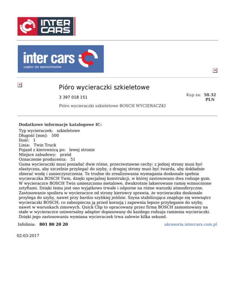 Pióro wycieraczki szkieletowe Kup za: 50.32 PLN 3 397 018 151 Pióro wycieraczki szkieletowe BOSCH WYCIERACZKI Dodatkowe informacje katalogowe IC: Typ wycieraczek: szkieletowe Długość [mm]: 500 Ilość: 1 Linia: Twin Truck Pojazd z kierownicą po: lewej stronie Miejsce zabudowy: przód Oznaczenie producenta: 51 Guma wycieraczki musi posiadać dwie różne, przeciwstawne cechy: z jednej strony musi być elastyczna, aby szczelnie przylegać do szyby, z drugiej strony musi być twarda, aby dokładnie zbierać wodę i zanieczyszczenia. Te trudne do zrealizowania wymagania doskonale spełnia wycieraczka BOSCH Twin, dzięki specjalnej konstrukcji, w której zastosowano dwa rodzaje gum. W wycieraczce BOSCH Twin umieszczono metalowe, dwukrotnie lakierowane ramię wzmocnione sztyftami. Dzięki temu jest ono wyjątkowo trwałe i odporne na różne warunki atmosferyczne. Zastosowanie spoilera w wycieraczce od strony kierowcy sprawia, że wycieraczka doskonale przylega do szyby, nawet przy bardzo szybkiej jeździe. Szyna stabilizująca znajduje się wewnątrz wycieraczki BOSCH, co zabezpiecza ją przed korozją i zapewnia lepsze przyleganie do szyby, nawet w warunkach zimowych. Quick Clip to opracowany przez firmę BOSCH zamontowany na stałe w wycieraczce uniwersalny adapter dopasowany do każdego rodzaju ramienia wycieraczki. Dzięki jego zastosowaniu wymiana wycieraczek trwa zalewie kilka sekund. Infolinia: 801 80 20 20 02-03-2017 akcesoria.intercars.com.pl