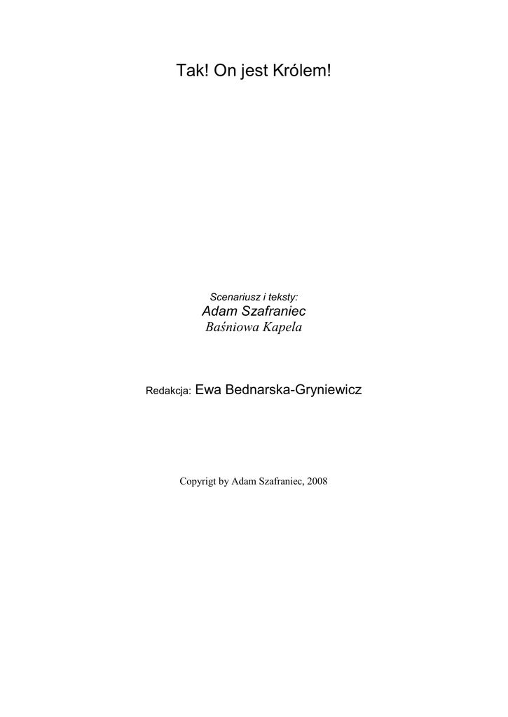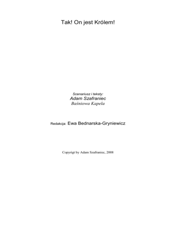 Tak! On jest Królem! Scenariusz i teksty: Adam Szafraniec Baśniowa Kapela Redakcja: Ewa Bednarska-Gryniewicz Copyrigt by Adam Szafraniec, 2008 Akt I Występują: Narrator, Maria, Józef, Diabeł, Pasterze, Psy Pasterskie, Publiczność. Na scenie panuje półmrok. Brak światła symbolizuje rzeczywistość przed narodzeniem Jezusa. Pierwsze sceny przedstawienia rozgrywają się poza sceną, wśród publiczności, która gra rolę mieszkańców Betlejem. Gwarna ulica Betlejem, w tym tumulcie rozlega się głos urzędnika, a także głosy Józefa i Marii (ta scena nagrana i odtworzona z CD): CD nr 1(gwar i rozmowa z urzędnikiem, spis ludności) – Józef z Galilei, z miasta Nazaret, z domu Dawida... – Zapisałem, kto następny? Narrator: Zapadł wieczór. Maria czuła, że niebawem nadejdzie dla niej czas rozwiązania. Razem z Józefem poszukiwali miejsca, gdzie mogłoby się narodzić Święte Dziecię. CD nr 2 (pukanie i odpowiedź gospodarza, efekty) Maria i Józef nadchodzą z tyłu sali, zbliżają się do publiczności i pukają do serc ludzi (dosłownie!), lecz oni są obojętni. Na scenę wbiega Diabeł i zbiegając w stronę publiczności, krzyczy: Jak diabeł podpowie, wyjdzie ci na zdrowie Ajajaj, nie otwieraj nie otwieraj nie otwieraj nie otwieraj! CD nr 3 Piosenka: Szukają Puk, puk, puk pukają puk, puk, puk szukają nie ma miejsca dla Jezusa. Wszystkie drzwi zamknięte Dzieciąteczko Święte gdzieś pod sercem mamy jeszcze śpi. Wszystkie drzwi zamknięte Dzieciąteczko Święte Gdzieś pod sercem mamy budzi się nie wie, że... Puk, puk, puk pukają puk, puk, puk szukają ale drzwi nie otwiera nikt. Gwiżdże wiatr, na dworze zawierucha — efekty nagrane na CD tworzą tło dialogu: CD nr 4 (efekty) Józef: Mario, nasz los nikogo nie obchodzi. Maria: Wiem... Józefie, czuję, że nadchodzi czas narodzin. Józef: Spójrz, tam za miastem, nad górami, widzę gwiazdę. Kręci się, kręci, wiruje. Maria: Może drogę nam wskazuje? Józef: Pójdźmy w tamtą stronę. Maria: Boże, oby tam było miejsce nam przeznaczone. Akcja przenosi się na scenę. Maria i Józef wchodzą na scenę i zajmują miejsce za zasłoną, która maskuje stajenkę. Diabeł: Kłopot z głowy. Nie ma mowy, nie uchowa się za miastem. Może zadzwonię do piekła, nim zasnę? Diabeł rozmawia przez telefon, który ma wyglądać zabawnie, może być zrobiony np. z banana, z ogórka, może z kawałka drzewa lub sztucznej kości. Szefie, szykuj premię. Ludzkie plemię nie przyjęło Dzieciątka... Tak, wystarczy dziesiątka, może chociaż piątka... Pięć małych srebrników.., szefie! Diabeł, rozmawiając, schodzi ze sceny. Po chwili słychać jego ziewanie, a następnie chrapanie. Wiersz dla dziecka przebranego za mędrca (okulary, w ręku księga): Boi się Boga Diabeł jest wszędzie po cichu się skrada namawia do złego kusi, podpowiada. Boi się Boga i święconej wody nie ma władzy nad człowiekiem jeśli ten nie wyrazi zgody. Nie nazywaj go lepiej diabełkiem ale diabłem żeby przypadkiem nie myślał że jest naszym skarbem! W tle muzyka kołysanki. Scena, chwilowo pusta, po chwili się wypełnia. Narrator: Maria i Józef błądzili wokół Betlejem, aż wreszcie znaleźli ubogą stajenkę. Nie była pałacem ani miejscem godnym Syna Bożego, ale była przytulna i ciepła. Zamiast wygodnego łoża stał tam żłobek, a za pościel służyło sianko. Na scenę wchodzą pasterze, słychać beczenie owiec, szczekanie psa i dialogi. Jeśli przedstawienie jest przygotowywane z rozmachem, bierze w nim udział duża grupa dzieci i warunki sceniczne na to pozwalają, mogą wystąpić maluchy przebrane za owce, a nawet za owczarki. Pasterz Pierwszy: Pieski, pilnujcie owieczek, bo wiecie, że wilki grasują i kombinują. Pies Pasterski: Tak jest! Tak jest, pasterzu! Pasterz Drugi: Zmówmy po pacierzu i połóżmy się do snu. Pasterze zasypiają wokół sceny. Owce stoją w grupie i od czasu do czasu cicho beczą aż do momentu, gdy narrator zacznie swoją kwestię. Ta scena uśpienia trwa około 15–20 sekund. Narrator: Ludzie pogrążyli się we śnie. Wiatr ucichł. Nastała wielka cisza, świat wstrzymał oddech, aż nagle... Płacz dziecka. CD nr 5 (płacz dziecka) Akt II Występują: Aniołowie, Pasterze, Dzieci, Diabeł, Publiczność CD nr 6 (odgłosy stajenki podniosła muzyka, dzwony) Słychać płacz Dzieciątka, jednak stajenka jest nadal zasłonięta. Rozbłyskują światła. Równocześnie rozlega się podniosła muzyka, a po chwili na scenie pojawiają się Aniołowie, którzy tańczą i śpiewają a cappella („Gloria in excelsis Deo” — nagrany na płycie podkład wokalny dwu- lub trzygłosowy). Na środek sceny wbiegają Aniołowie. Słychać radosne rozmowy: CD nr 7 (a capella „Gloria in excelsis Deo”) — Narodził się Jezus! Boży Syn! — Chwalmy Go, chwalmy! — Śpiewajmy psalmy! — Tańczmy i grajmy! Jeden z Aniołów wychodzi przed publiczność i woła donośnie: Ludzie! Czemu śpicie? Bóg nam się narodził! Nie wierzycie? Anioł woła w stronę publiczności tak długo, aż ta odpowie chórem: Wierzymy! Anioł do Pasterzy: Pastuszkowie! Pastuszkowie! Czemu jeszcze śpicie? W stajence, w Betlejem Narodził się Jezus Wasz Pan i Zbawiciel! Pasterze budzą się i wstają, owce zaczynają głośniej beczeć, psy szczekają wesoło (dzieci naśladują głosy zwierząt). Rozlega się gwar, pasterze padają sobie w objęcia. Aniołowie tańcząc, wołają: Ruszajmy dalej By oznajmić światu Radosną nowinę! Aniołowie zbiegają ze sceny. Wbiega Diabeł i skacząc, krzycząc: Co tu się dzieje? Co tu się dzieje? Pasterze: — Pasterze! Zabierajmy owce! — Biegnijmy do Betlejem! CD nr 8 Do stajenki! Do stajenki, do stajenki Gdzie leży Maleńki Do stajenki, do stajenki Gdzie maleńki Jezus. (2x) Refren: Kózki, owieczki Dzwonki, dzwoneczki Chwalą z Aniołami Pana nad panami Chwalą z Aniołami Pana nad panami. Do Betlejem, do Betlejem Gdzie niebo jaśnieje Do