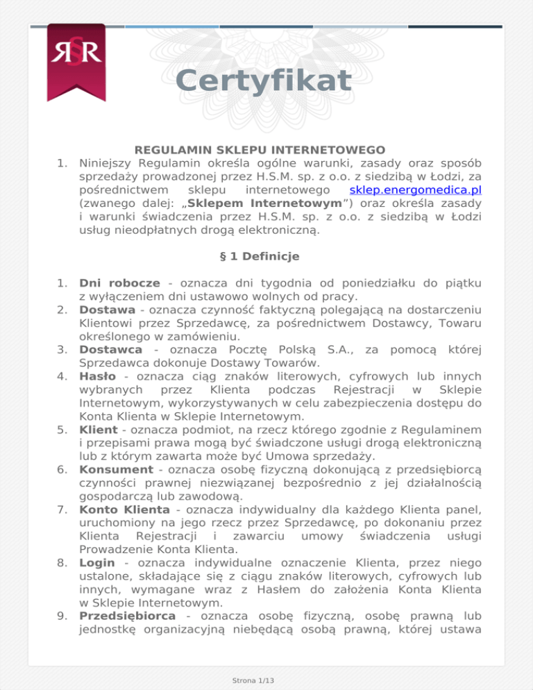 Certyfikat REGULAMIN SKLEPU INTERNETOWEGO 1. Niniejszy Regulamin określa ogólne warunki, zasady oraz sposób sprzedaży prowadzonej przez H.S.M. sp. z o.o. z siedzibą w Łodzi, za pośrednictwem sklepu internetowego sklep.energomedica.pl (zwanego dalej: „Sklepem Internetowym”) oraz określa zasady i warunki świadczenia przez H.S.M. sp. z o.o. z siedzibą w Łodzi usług nieodpłatnych drogą elektroniczną. § 1 Definicje 1. Dni robocze - oznacza dni tygodnia od poniedziałku do piątku z wyłączeniem dni ustawowo wolnych od pracy. 2. Dostawa - oznacza czynność faktyczną polegającą na dostarczeniu Klientowi przez Sprzedawcę, za pośrednictwem Dostawcy, Towaru określonego w zamówieniu. 3. Dostawca - oznacza Pocztę Polską S.A., za pomocą której Sprzedawca dokonuje Dostawy Towarów. 4. Hasło - oznacza ciąg znaków literowych, cyfrowych lub innych wybranych przez Klienta podczas Rejestracji w Sklepie Internetowym, wykorzystywanych w celu zabezpieczenia dostępu do Konta Klienta w Sklepie Internetowym. 5. Klient - oznacza podmiot, na rzecz którego zgodnie z Regulaminem i przepisami prawa mogą być świadczone usługi drogą elektroniczną lub z którym zawarta może być Umowa sprzedaży. 6. Konsument - oznacza osobę fizyczną dokonującą z przedsiębiorcą czynności prawnej niezwiązanej bezpośrednio z jej działalnością gospodarczą lub zawodową. 7. Konto Klienta - oznacza indywidualny dla każdego Klienta panel, uruchomiony na jego rzecz przez Sprzedawcę, po dokonaniu przez Klienta Rejestracji i zawarciu umowy świadczenia usługi Prowadzenie Konta Klienta. 8. Login - oznacza indywidualne oznaczenie Klienta, przez niego ustalone, składające się z ciągu znaków literowych, cyfrowych lub innych, wymagane wraz z Hasłem do założenia Konta Klienta w Sklepie Internetowym. 9. Przedsiębiorca - oznacza osobę fizyczną, osobę prawną lub jednostkę organizacyjną niebędącą osobą prawną, której ustawa Strona 1/13 10. 11. 12. 13. 14. 15. 16. przyznaje zdolność prawną, prowadzącą we własnym imieniu działalność gospodarczą lub zawodową i dokonującą czynności prawnej związaną bezpośrednio z jej działalnością gospodarczą lub zawodową. Regulamin - oznacza niniejszy regulamin. Rejestracja - oznacza czynność faktyczną dokonaną w sposób określony w Regulaminie, wymaganą dla korzystania przez Klienta ze wszystkich funkcjonalności Sklepu Internetowego. Sprzedawca - oznacza H.S.M. sp. z o.o. z siedzibą w Łodzi (91-520), ul. Okólna 186, NIP: 7262611292, REGON: 100638981, wpisaną do rejestru przedsiębiorców prowadzonego przez Sąd Rejonowy dla Łodzi-Śródmieścia w Łodzi, XX Wydział Gospodarczy Krajowego Rejestru Sądowego pod numerem KRS 0000332270, o kapitale zakładowym w wysokości 100.000 złotych; e-mail: [email protected], będącą jednocześnie właścicielem Sklepu Internetowego. Strona Internetowa Sklepu - oznacza strony internetowe, pod którymi Sprzedawca prowadzi Sklep Internetowy, działające w domenie sklep.energomedica.pl Towar - oznacza produkt przedstawiony przez Sprzedawcę za pośrednictwem Strony Internetowej Sklepu, mogący być przedmiotem Umowy sprzedaży. Trwały nośnik - oznacza materiał lub narzędzie umożliwiające Klientowi lub Sprzedawcy przechowywanie informacji kierowanych osobiście do niego, w sposób umożliwiający dostęp do informacji w przyszłości przez czas odpowiedni do celów, jakim te informacje służą, i które pozwalają na odtworzenie przechowywanych informacji w niezmienionej postaci. Umowa sprzedaży - oznacza umowę sprzedaży zawartą na odległość, na zasadach określonych w Regulaminie, między Klientem a Sprzedawcą. § 2 Postanowienia ogólne i korzystanie ze Sklepu Internetowego 1. Wszelkie prawa do Sklepu Internetowego, w tym majątkowe prawa autorskie, prawa własności intelektualnej do jego nazwy, jego domeny internetowej, Strony Internetowej Sklepu, a także do wzorców, formularzy, logotypów zamieszczanych na Stronie Internetowej Sklepu (za wyjątkiem logotypów i zdjęć prezentowanych na Stronie Internetowej Sklepu w celach prezentacji towarów, do których to prawa autorskie należą do podmiotów trzecich) należą do Sprzedawcy, a korzystanie z nich może następować wyłącznie w sposób określony i zgodny Strona 2/13 2. 3. 4. 5. 6. z Regulaminem oraz za zgodą Sprzedawcy wyrażoną na piśmie. Sprzedawca dołoży starań, aby korzystanie ze Sklepu Internetowego było możliwe dla użytkowników Internetu z użyciem wszystkich popularnych przeglądarek internetowych, systemów operacyjnych, typów urządzeń oraz typów połączeń internetowych. Minimalne wymagania techniczne umożliwiające korzystanie ze Strony Internetowej Sklepu to przeglądarka internetowa w wersji co najmniej Internet Explorer 11 lub Chrome 39 lub FireFox 34 lub Opera 26 lub Safari 5 lub nowszych, z włączoną obsługą języka Javascript, akceptująca pliki typu „cookies” oraz łącze internetowe o przepustowości co najmniej 256 kbit/s. Strona Internetowa Sklepu jest zoptymalizowana dla minimalnej rozdzielczości ekranu 1024x768 pikseli. Sprzedawca stosuje mechanizm plików "cookies", które podczas korzystania przez Klientów ze Strony Internetowej Sklepu, zapisywane są przez serwer Sprzedawcy na dysku twardym urządzenia końcowego Klienta. Stosowanie plików "cookies" ma na celu poprawne działanie Strony Internetowej Sklepu na urządzeniach końcowych Klientów. Mechanizm ten nie niszczy urządzenia końcowego Klienta oraz nie powoduje zmian konfiguracyjnych w urządzeniach końcowych Klientów ani w oprogramowaniu zainstalowanym na tych urządzeniach. Każdy Klient może wyłączyć mechanizm „cookies” w przeglądarce internetowej swojego urządzenia końcowego. Sprzedawca wskazuje, że wyłączenie „cookies” może jednak spowodować utrudnienia lub uniemożliwić korzystanie ze Strony Internetowej Sklepu. W celu złożenia zamówienia w Sklepie Interne