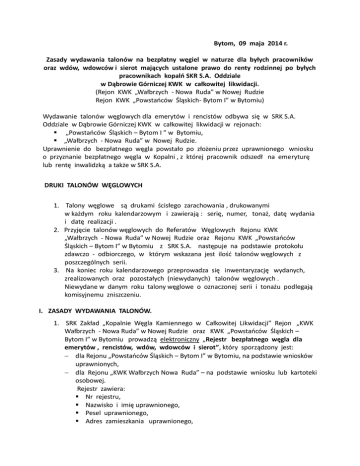 Bytom, 09 maja 2014 r. Zasady wydawania talonów na bezpłatny węgiel w naturze dla byłych pracowników oraz wdów, wdowców i sierot mających ustalone prawo do renty rodzinnej po byłych pracownikach kopalń SKR S.A. Oddziale w Dąbrowie Górniczej KWK w całkowitej likwidacji. (Rejon KWK „Wałbrzych - Nowa Ruda” w Nowej Rudzie Rejon KWK „Powstańców Śląskich- Bytom I” w Bytomiu) Wydawanie talonów węglowych dla emerytów i rencistów odbywa się w SRK S.A. Oddziale w Dąbrowie Górniczej KWK w całkowitej likwidacji w rejonach: „Powstańców Śląskich – Bytom I ” w Bytomiu, „Wałbrzych - Nowa Ruda” w Nowej Rudzie. Uprawnienie do bezpłatnego węgla powstało po złożeniu przez uprawnionego wniosku o przyznanie bezpłatnego węgla w Kopalni , z której pracownik odszedł na emeryturę lub rentę inwalidzką a także w SRK S.A. DRUKI TALONÓW WĘGLOWYCH 1. Talony węglowe są drukami ścisłego zarachowania , drukowanymi w każdym roku kalendarzowym i zawierają : serię, numer, tonaż, datę wydania i datę realizacji . 2. Przyjęcie talonów węglowych do Referatów Węglowych Rejonu KWK „Wałbrzych - Nowa Ruda” w Nowej Rudzie oraz Rejonu KWK „Powstańców Śląskich – Bytom I” w Bytomiu z SRK S.A. następuje na podstawie protokołu zdawczo - odbiorczego, w którym wskazana jest ilość talonów węglowych z poszczególnych serii. 3. Na koniec roku kalendarzowego przeprowadza się inwentaryzację wydanych, zrealizowanych oraz pozostałych (niewydanych) talonów węglowych . Niewydane w danym roku talony węglowe o oznaczonej serii i tonażu podlegają komisyjnemu zniszczeniu. I. ZASADY WYDAWANIA TALONÓW. 1. SRK Zakład „Kopalnie Węgla Kamiennego w Całkowitej Likwidacji” Rejon „KWK Wałbrzych - Nowa Ruda” w Nowej Rudzie oraz KWK „Powstańców Śląskich – Bytom I” w Bytomiu prowadzą elektroniczny „Rejestr bezpłatnego węgla dla emerytów , rencistów, wdów, wdowców i sierot”, który sporządzony jest: dla Rejonu „Powstańców Śląskich – Bytom I” w Bytomiu, na podstawie wniosków uprawnionych, dla Rejonu „KWK Wałbrzych Nowa Ruda” – na podstawie wniosku lub kartoteki osobowej. Rejestr zawiera: Nr rejestru, Nazwisko i imię uprawnionego, Pesel uprawnionego, Adres zamieszkania uprawnionego, Uprawniony tonaż, Nr świadczenia, Oddział ZUS, Nr talonu oraz datę wydania talonu. Rejestry prowadzone będą również w formie pisemnej z zachowaniem wszystkich danych znajdujących się w formie elektronicznej. 1.1 Dla rejonu KWK „Wałbrzych – Nowa Ruda”. Uprawnionemu do pobrania talonów węglowych wydaje się po zweryfikowaniu aktualnej decyzji ZUS o waloryzacji emerytury (bieżącego roku) lub decyzji o przeliczeniu emerytury i legitymację emeryta/rencisty oraz wniosku lub kartoteki osobowej oraz dokonania następujących czynności: 1) Złożeniu przez pracownika na odwrocie każdego talonu podpisu i imiennej pieczątki, 2) Wystawieniu druków dokumentów dostawy (wzór opracowany przez Ministra Finansów - zał. nr 2). Ilość wystawionych dokumentów dostawy zależy od decyzji odbierającego talony, jednak w ilości nie więcej niż trzy sztuki. Dokumenty dostawy będą wystawiane w trzech egzemplarzach. Dokumenty dostawy należy przedstawić u wydającego węgiel deputatowy w dniu wydawania węgla, gdzie zostaną one uzupełnione o pozostałe wpisy tj: - nadania kolejnego nr d.d., - poz. 4 d.d. data i podpis wydającego węgiel, - poz. 5 d.d. data i podpis deputatobiorcy (Pełnomocnika) potwierdzającego nabycie wyrobów węglowych. Do odbioru talonów należy przedstawić : a) Dowód tożsamości uprawnionego, b) Ostatnia decyzja ZUS i Legitymacja emeryta/rencisty. Osoba uprawniona kwituje (załącznik nr 3) własnoręcznym podpisem odebranie talonów węglowych i druków dokumentów dostawy oraz zapoznanie się z informacją Zarządu SRK.S.A. (załącznik nr 1). 1.2 Dla rejonu „KWK Powstańców Śląskich – Bytom I”. Uprawnionemu do pobrania talonów węglowych wydaje się po zweryfikowaniu aktualnej decyzji ZUS o waloryzacji emerytury (bieżącego roku) lub decyzji o przeliczeniu emerytury i legitymację emeryta/rencisty oraz dokonania następujących czynności: 1) Złożeniu przez pracownika na odwrocie każdego talonu podpisu i imiennej pieczątki, 2) Wystawieniu druków dokumentów dostawy (wzór opracowany przez Ministra Finansów - zał. nr 2). Ilość wystawionych dokumentów dostawy zależy od decyzji odbierającego talony, jednak w ilości nie więcej niż trzy sztuki. Dokumenty dostawy będą wystawiane w trzech egzemplarzach. Dokumenty dostawy należy przedstawić u wydającego węgiel deputatowy w dniu wydawania węgla, gdzie zostaną one uzupełnione o pozostałe wpisy tj: - nadania kolejnego nr d.d., - poz. 4 d.d. data i podpis wydającego węgiel, - poz. 5 d.d. data i podpis deputatobiorcy (Pełnomocnika) potwierdzającego nabycie wyrobów węglowych. Do odbioru talonów należy przedstawić : a) Dowód tożsamości uprawnionego, b) Ostatnia decyzja ZUS i Legitymacja emeryta/rencisty Osoba uprawniona kwituje (załącznik nr 3) własnoręcznym podpisem odebranie talonów węglowych i druków dokumentów dostawy oraz zapoznanie się z informacją Zarządu SRK.S.A. (załącznik nr 1). W przypadku renty ustalonej na czas określony, ilość ton bezpłatnego węgla, przysługująca uprawnionemu obliczona jest proporcjonalnie do czasu obowiązywania renty w danym roku kalendarzowym i zaokrąglana do pełnych 100 kg : - jeżeli ilość wyliczonego z proporcji węgla jest większa niż 50 kg to uprawnienie zaokrągla się do 100 kg, - jeżeli ilość wyliczonego węgla jest mniejsza lub równa 50 kg to uprawnienie do bezpłatnego węgla nie przysługuje. 1.3 Osoby upoważnione przez uprawnionego oraz współmałżonkowie zgodnie z art. 29 Kodeksu Rodzinnego na podstawie „Upoważnienia” - druk zał. nr 4, 4a lub upoważnienia notarialnego. Zał. nr 4 „Upoważnienie do odbioru talonów w