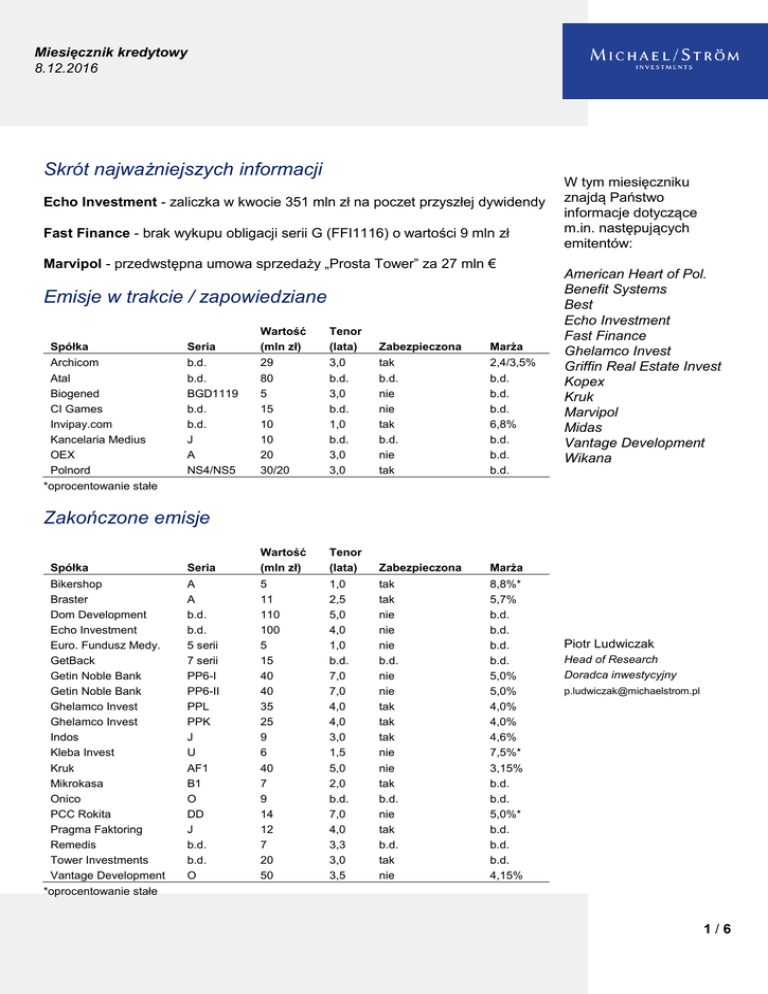Miesięcznik kredytowy 8.12.2016 Skrót najważniejszych informacji Echo Investment - zaliczka w kwocie 351 mln zł na poczet przyszłej dywidendy Fast Finance - brak wykupu obligacji serii G (FFI1116) o wartości 9 mln zł Marvipol - przedwstępna umowa sprzedaży „Prosta Tower” za 27 mln € Emisje w trakcie / zapowiedziane Spółka Archicom Atal Biogened CI Games Invipay.com Kancelaria Medius OEX Polnord *oprocentowanie stałe Seria Wartość (mln zł) Tenor (lata) Zabezpieczona Marża b.d. b.d. BGD1119 b.d. b.d. J A NS4/NS5 29 80 5 15 10 10 20 30/20 3,0 b.d. 3,0 b.d. 1,0 b.d. 3,0 3,0 tak b.d. nie nie tak b.d. nie tak 2,4/3,5% b.d. b.d. b.d. 6,8% b.d. b.d. b.d. Tenor (lata) Zabezpieczona Marża 1,0 2,5 5,0 4,0 1,0 b.d. 7,0 7,0 4,0 4,0 3,0 1,5 5,0 2,0 b.d. 7,0 4,0 3,3 3,0 3,5 tak tak nie nie nie b.d. nie nie tak tak tak nie nie tak b.d. nie tak b.d. tak nie 8,8%* 5,7% b.d. b.d. b.d. b.d. 5,0% 5,0% 4,0% 4,0% 4,6% 7,5%* 3,15% b.d. b.d. 5,0%* b.d. b.d. b.d. 4,15% W tym miesięczniku znajdą Państwo informacje dotyczące m.in. następujących emitentów: American Heart of Pol. Benefit Systems Best Echo Investment Fast Finance Ghelamco Invest Griffin Real Estate Invest Kopex Kruk Marvipol Midas Vantage Development Wikana Zakończone emisje Spółka Seria Wartość (mln zł) Bikershop Braster Dom Development Echo Investment Euro. Fundusz Medy. GetBack Getin Noble Bank Getin Noble Bank Ghelamco Invest Ghelamco Invest Indos Kleba Invest Kruk Mikrokasa Onico PCC Rokita Pragma Faktoring Remedis Tower Investments Vantage Development A A b.d. b.d. 5 serii 7 serii PP6-I PP6-II PPL PPK J U AF1 B1 O DD J b.d. b.d. O 5 11 110 100 5 15 40 40 35 25 9 6 40 7 9 14 12 7 20 50 Piotr Ludwiczak Head of Research Doradca inwestycyjny [email protected] *oprocentowanie stałe 1/6 Miesięcznik kredytowy 8.12.2016 Najbliższe wykupy na Catalyst Spółka Bank Pocztowy MCI Capital BZ WBK Europejski Fun. Medy. Property Lease Fund Lindorff GPW Wikana Poznańska 37 SPV Poznańska 37 SPV Dom Development PCC Autochem BBI Development Integer.PL *oprocentowanie stałe Seria Wartość (mln zł) Tenor (lata) Zabezpieczo. Wykup Marża BPO1216 MCI1216 BZW1216 EFM1216 PLE1216 CAS1216 GPW0117 WIK0117 POB0117 POA0117 DOM0217 AUT0217 BBI0217 ITG0217 148 30 500 4 3 5 120 8 34 16 120 3 53 20 3,0 3,0 3,0 3,1 2,0 3,5 5,0 3,5 3,1 3 5 2,9 3 1 nie tak nie nie tak tak nie nie tak tak nie nie nie nie 13-12 19-12 19-12 20-12 23-12 28-12 02-01 18-01 31-01 31-01 2-02 5-02 7-02 10-02 1,4% 4,5% 1,2% 6,4% 9,0%* 4,95% 1,17% 5,95% 8,0%* 8,0%* 3,5% 6,8%* 6,0% 3,5% Informacje ze spółek American Heart of Poland Na dzień 23 grudnia br. zwołano Zgromadzenie Obligatariuszy obligacji serii B (BFT0619). Przedmiotem ZO będzie ocena stanu faktycznego, który może zaistnieć w przyszłości pod kątem zgodności z postanowieniami WEO. Projekty uchwał ZO są dostępne w siedzibie Agenta Emisji. Benefit Systems Na dzień 16 grudnia br. zwołano Zgromadzenie Obligatariuszy obligacji serii I (AHP0622). Przedmiotem ZO będzie wyrażenie zgody na zmianę definicji Zadłużenia Finansowego. Best Krzysztof Borusowski (prezes spółki) sprzedał w dniu 14 listopada br. 30 772 sztuk obligacji serii BST0319 po cenie 100 zł. Wartość nominalna serii BST0319 wynosi 35 mln zł, a marża 3,3 pkt. proc. Echo Investment Zarząd spółki postanowił o warunkowej wypłacie akcjonariuszom Echo Investment zaliczki na poczet przyszłej dywidendy za rok obrotowy 2016 r. Łączna kwota przeznaczona na wypłatę zaliczki wyniesie 351 mln zł. Zaliczka zostanie wypłacona do 31 grudnia 2017 r. w kilku transzach na podstawie odrębnych uchwał zarządu. Pierwsza transza zaliczki zostanie wypłacona 28 grudnia 2016 r. Zaliczka zostanie wypłacona, jeśli spełnionych zostanie kilka warunków, w tym utworzenie przez Walne Zgromadzenie kapitału rezerwowego z przeznaczeniem na wypłatę zaległej dywidendy lub zaliczki na poczet dywidendy. 2/6 Miesięcznik kredytowy 8.12.2016 Fast Finance Spółka nie przekazała do KDPW wymaganych środków pieniężnych na wykup obligacji serii G (FFI1116) o wartości nominalnej 8,6 mln zł. Emisja miała zostać wykupiona 15 listopada br. Spółka zamierza przekazać środki do KDPW „w ciągu najbliższego okresu”. Przy poprzedniej serii (F – FFI0916) o wartości nominalnej 3,9 mln zł spółka również miała problemy z wykupem obligacji. Ostatecznie, wrześniowa seria została spłacona z 34-dniowym opóźnieniem. Przypomnę, że w przypadku serii F spółka dokonywała częściowych spłat po terminie wykupu, a póki co Fast Finance nie poinformowało o przekazaniu jakichkolwiek środków do KDPW celem wykupu obligacji serii G. Ghelamco Invest Spółka zamierza ustanowić V Program Emisji Obligacji do kwoty 400 mln zł. Program zostanie ustanowiony po udzieleniu przez Granbero Holdings Limited (tj. gwaranta obligacji) stosownych zgód i poręczeń oraz zawarciu wymaganej dokumentacji, co zdaniem zarządu Ghelamco Invest nastąpi jeszcze w tym roku. Warsaw Spire sp. z o.o. sp.k. zawarła aneks do umowy kredytowej na podstawie którego podwyższeniu uległa kwota kredytu budowlanego udzielonego spółce z 250 mln € do 300 mln €. Griffin Real Estate Invest Na dzień 28 grudnia br. zwołano Zgromadzenie Obligatariuszy obligacji serii 1A oraz 2A (notowanych na Catalyst pod jedną serią GFN1217). Przedmiotem ZO będzie m.in. głosowanie nad zmianą terminu wykupu obligacji. Kopex Zarząd spółki ustanowił Program Emisji Obligacji do kwoty 200 mln zł. Kruk Spółka w 100% zależna od emitenta zawarła umowę z podmiotem należącym do Grupy Carrefour w Hiszpanii (Servicios Financieros Carefour). Umowa przewiduje nabycie portfela detalicznych niezabezpieczonych wierzytelności o łącznej wartości nominalnej wynoszącej 807 mln zł. Cena została zapłacona 30 listopada br. Marvipol Spółka w 100% zależna od emitenta zawarła przedwstępną umowę sprzedaży biurowca „Prosta Tower”. Cena sprzedaży wynosi ok. 27 mln €. 