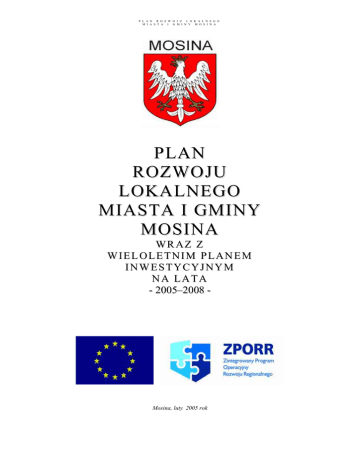 P L A N R O Z W O J U L O K A L N E G O M I A S T A I G M I N Y M O S I N A PLAN ROZWOJU LOKALNEGO MIASTA I GMINY MOSINA WRAZ Z WIELOLETNIM PLANEM INWESTYCYJNYM NA LATA - 2005–2008 - Mosina, luty 2005 rok P L A N R O Z W O J U L O K A L N E G O M I A S T A I G M I N Y M O S I N A SPIS TREŚCI Wstęp 3 Załączniki 4 1.0. Obszar i czas realizacji Planu Rozwoju Lokalnego 12 2.0. Aktualna sytuacja społeczno-gospodarcza na obszarze objętym wdrażaniem planu 16 2.1. Raport o stanie Miasta i Gminy Mosina 17 2.2. Identyfikacja problemów na podstawie analizy SWOT 42 3.0. 4.0. Zadania polegające na poprawie sytuacji na danym obszarze 48 3.1. Cele, programy i projekty 48 3.2. Wybrany wariant rozwoju [lista zadań (celów) do zrealizowania wynikających z hierarchii ważności] 54 Realizacja zadań i projektów 57 4.1. Programy Operacyjne i ich oznaczenie 58 4.2. Planowane projekty i zadania w okresie 2005-2012 59 4.3. Wieloletni Plan Inwestycyjny 2005-2008 (zintegrowana tabela zadań) 110 5.0. Powiązania projektów z innymi działaniami na terenie powiatu i województwa 133 6.0. Oczekiwane wskaźniki osiągnięć Planu Rozwoju Lokalnego 135 7.0. Plan finansowy na lata 2005-2012 140 7.1. Ocena sytuacji finansowej Miasta i Gminy Mosina w latach 2000-2003 z uwzględnieniem planu budżetu na 2004r. 141 7.2. Analiza struktury dochodów 142 7.3. Analiza struktury wydatków 143 7.4. Projekcja wolnych środków na inwestycje 147 7.5. Podział na źródła finansowania 152 8.0. System wdrażania 153 9.0. Sposoby monitorowania i oceny komunikacji społecznej 155 9.1. Sposoby oceny realizacji Planu Rozwoju Lokalnego 156 9.2. Podział potencjału inwestycyjnego na poszczególne cele strategiczne i inne cele 157 9.3. Public Relations Planu Rozwoju Lokalnego 158 2 P L A N R O Z W O J U L O K A L N E G O M I A S T A I G M I N Y M O S I N A WSTĘP Plan Rozwoju Lokalnego to dokument o charakterze strategicznym stanowiący integralną część Strategii Rozwoju Gminy Mosina. Obowiązek opracowania planu wynika z zapisów Zintegrowanego Programu Operacyjnego Rozwoju Regionalnego i dotyczy przede wszystkim inwestycji, których wykonanie może być dofinansowane z Europejskiego Funduszu Rozwoju Regionalnego oraz innych środków zewnętrznych. Zapisy Planu Rozwoju Lokalnego są spójne z Narodowym Planem Rozwoju, ze Strategią Rozwoju Województwa Wielkopolskiego oraz z Planem Rozwoju Lokalnego Powiatu Poznańskiego. Priorytetowe inwestycje miasta i gminy przeznaczone do realizacji na najbliższe lata wskazali członkowie zespołu zadaniowego powołanego przez Burmistrza Gminy na podstawie Wniosków Przedsięwzięć Inwestycyjnych. Plan Rozwoju Lokalnego opracowano według zaproponowanej w podręczniku wdrażania ZPORR struktury, nieco zmodyfikowanej ze względu na specyfikę wcześniej opracowanego dokumentu tj. Strategii Rozwoju Gminy Mosina. Plan Rozwoju Lokalnego Miasta i Gminy Mosina zawiera zidentyfikowane zadania w Programach Operacyjnych oraz elementy Wieloletniego Planu Inwestycyjnego. Komisja ds. wdrażania WPI pełni jednocześnie funkcję Komisji ds. Planu Rozwoju Lokalnego, ponieważ zmiany w PRL-u w przeciągu najbliższych lat dokonywane będą w obrębie przejścia zadań z Programów Operacyjnych do Zintegrowanej Tabeli Wieloletniego Planu Inwestycyjnego. 3 P L A N R O Z W O J U L O K A L N E G O M I A S T A I G M I N Y M O S I N A ZAŁĄCZNIKI ZARZĄDZENIE nr 19/04 Burmistrza Gminy Mosina z dnia 17 marca 2004 r. w sprawie: procedury opracowania Wieloletniego Planu Inwestycyjnego Gminy Mosina na lata 2004 - 2007 Na podstawie Ustawy o samorządzie gminnym z dnia 8 marca 1990 r. (tekst jednolity Dz. U. z 2001 r. Nr 142, póz. 1591), podejmując działania mające na celu opracowanie pierwszej edycji Wieloletniego Planu Inwestycji na lata 2004 - 2007, optymalnie dobranego zarówno pod względem potrzeb strategicznych jak i możliwości finansowych gminy zarządzam, co następuje: 1. 2. 3. 4. 1. 2. §1 Powołuję Komisję Koordynacyjną d.s. Wieloletniego Planu Inwestycyjnego na lata 2004 2007 (zwaną dalej „Komisją"), w skład której wchodzą osoby wymienione w załączniku nr 1 do niniejszego zarządzenia. Na Przewodniczącego Komisji Koordynacyjnej ds. Wieloletniego Planu Inwestycyjnego powołuję Zastępcę Burmistrza - Bogdana Robakowskiego. Na Wiceprzewodniczącego Komisji Koordynacyjnej d.s. Wieloletniego Planu Inwestycyjnego powołuję kierownika Referatu Inwestycji Komunalnych - Marię Wyzuj. Celem opracowania Wieloletniego Planu Inwestycyjnego na lata 2004 - 2007 jest: 1) Stworzenie dokumentu pomocniczego w negocjacjach o uzyskanie dofinansowania z zewnętrznych środków finansowych, na przedsięwzięcia inwestycyjne realizowane przez Gminę, 2) komunikacja władz samorządowych z mieszkańcami w zakresie długookresowych zamierzeń inwestycyjnych, uwzględniających także wnioski/postulaty składane przez mieszkańców, 3) przedstawienie przyszłym partnerom przedsięwzięć publiczno-prywatnych długookresowych planów przedsięwzięć inwestycyjnych, 4) utworzenie bazy danych o wszystkich potrzebach inwestycyjnych Gminy, 5) zgromadzenie danych o wszystkich rozpoczętych inwestycjach (koncepcje, dokumentacje techniczne, itp.), 6) konfrontacja potrzeb inwestycyjnych z możliwościami inwestycyjnymi, 7) uniknięcie jednoczesnego otwierania zbyt wielu frontów inwestycyjnych w stosunku do zdolności finansowania Gminy, 8) określenie w okresie wieloletnim poziomu wydatków planowanych do poniesienia z budżetów Gminy i przeznaczonych na przedsięwzięcia inwestycyjne Gminy. §2 Prace nad Wieloletnim Planem Inwestycyjnym (WPI) przebiegać będą według harmonogramu zatwierdzonego przez mnie w dniu 17 marca 2004 r., który stanowi załącznik nr 2 do niniejszego zarządzenia. Wieloletni Plan Inwestycyjny opracowany przez Komisję na lata 2004-2007 posiadać będzie formułę planu „kroczącego”, tj. aktualizowanego corocznie z uzasadnionych powodów obejmujących m.in.: 1) zmiany