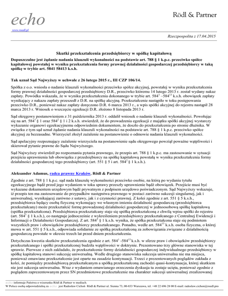 echo www.roedl.pl Rzeczpospolita z 17.04.2015 Skutki przekształcenia przedsiębiorcy w spółkę kapitałową Dopuszczalne jest żądanie nadania klauzuli wykonalności na podstawie art. 788 § 1 k.p.c. przeciwko spółce kapitałowej powstałej w wyniku przekształcenia formy prawnej działalności gospodarczej przedsiębiorcy w taką spółkę w trybie art. 5841 58413 k.s.h. Tak uznał Sąd Najwyższy w uchwale z 26 lutego 2015 r., III CZP 106/14. Spółka z o.o. wniosła o nadanie klauzuli wykonalności przeciwko spółce akcyjnej, powstałej w wyniku przekształcenia formy prawnej działalności gospodarczej przedsiębiorcy D.R., przeciwko któremu 14 lutego 2013 r. został wydany nakaz zapłaty. Powódka wskazała, że w wyniku przekształcenia dokonanego w trybie art. 5841 –58413 k.s.h. obowiązek zapłaty wynikający z nakazu zapłaty przeszedł z D.R. na spółkę akcyjną. Przekształcenie nastąpiło w toku postępowania przeciwko D.R., ponieważ nakaz zapłaty doręczono D.R. 6 marca 2013 r., a wpis spółki akcyjnej do rejestru nastąpił 28 marca 2013 r. Wniosek o wszczęcie egzekucji D.R. złożono 8 listopada 2013 r. Sąd okręgowy postanowieniem z 31 października 2013 r. oddalił wniosek o nadanie klauzuli wykonalności. Powołując się na art. 5841 § 1 oraz 5842 § 1 i 2 k.s.h. stwierdził, że do prowadzenia egzekucji z majątku spółki akcyjnej wystarczy wykazanie organowi egzekucyjnemu odpowiednim dokumentem, że doszło do przekształcenia po stronie dłużnika. W związku z tym sąd uznał żądanie nadania klauzuli wykonalności na podstawie art. 788 § 1 k.p.c. przeciwko spółce akcyjnej za bezzasadne. Wierzyciel złożył zażalenie na postanowienie o odmowie nadania klauzuli wykonalności. Sąd apelacyjny rozpoznający zażalenie wierzyciela na postanowienie sądu okręgowego powziął poważne wątpliwości i skierował pytanie prawne do Sądu Najwyższego. Sąd Najwyższy stwierdził po rozpoznaniu pytania prawnego, że przepis art. 788 § 1 k.p.c. ma zastosowanie w sytuacji przejścia uprawnienia lub obowiązku z przedsiębiorcy na spółkę kapitałową powstałą w wyniku przekształcenia formy działalności gospodarczej tego przedsiębiorcy (art. 551 § 5 i art. 5842 § 1 k.s.h.). Aleksander Adamus, radca prawny Kraków, Rödl & Partner Zgodnie z art. 788 § 1 k.p.c. sąd nada klauzulę wykonalności przeciwko osobie, na którą po wydaniu tytułu egzekucyjnego bądź przed jego wydaniem w toku sprawy przeszły uprawnienie bądź obowiązek. Przejście musi być wykazane dokumentem urzędowym bądź prywatnym z podpisem urzędowo poświadczonym. Sąd Najwyższy wskazuje, iż przepis ten ma zastosowanie do przypadków następstwa prawnego w postaci zarówno sukcesji singularnej, jak i uniwersalnej, wynikającej zarówno z ustawy, jak i z czynności prawnej. Z kolei zgodnie z art. 551 § 5 k.s.h., przedsiębiorca będący osobą fizyczną wykonujący we własnym imieniu działalność gospodarczą (przedsiębiorca przekształcany) może przekształcić formę prowadzonej działalności gospodarczej w jednoosobową spółkę kapitałową (spółka przekształcona). Przedsiębiorca przekształcany staje się spółką przekształconą z chwilą wpisu spółki do rejestru (art. 5841 § 1 k.s.h.), co następuje jednocześnie z wykreśleniem przedsiębiorcy przekształcanego z Centralnej Ewidencji i Informacji o Działalności Gospodarczej. Z art. 5842 § 1 k.s.h. wynika, że spółka przekształcona staje się podmiotem wszystkich praw i obowiązków przedsiębiorcy przekształcanego. Ponadto, wedle art. 58413 k.s.h. osoba fizyczna, o której mowa w art. 551 § 5 k.s.h., odpowiada solidarnie ze spółką przekształconą za zobowiązania związane z działalnością gospodarczą powstałe w okresie trzech lat przed dniem przekształcenia. Dotychczas kwestia skutków przekształcenia zgodnie z art. 5841 -58413 k.s.h. w sferze praw i obowiązków przedsiębiorcy przekształcanego i spółki przekształconej budziła wątpliwości w doktrynie. Prezentowano trzy główne stanowiska w tej sprawie. Pierwsze z nich zakładało, że przekształcenie formy działalności gospodarczej indywidualnego przedsiębiorcy w spółkę kapitałową stanowi sukcesję uniwersalną. Wedle drugiego stanowiska sukcesja uniwersalna nie ma miejsca, ponieważ omawiane przekształcenie jest oparte na zasadzie kontynuacji. Trzeci z prezentowanych poglądów zakłada z kolei, że pomiędzy przedsiębiorcą przekształcanym a spółką przekształconą zachodzi quasi-kontynuacja, której skutkiem nie jest sukcesja uniwersalna. Wraz z wydaniem omawianego orzeczenia dyskusja ta zostaje ucięta, ponieważ zgodnie z poglądem zaprezentowanym przez SN przedmiotowe przekształcenie ma charakter sukcesji uniwersalnej zrealizowanej echo informuje Państwa o wizerunku Rödl & Partner w mediach. W Polsce osobą odpowiedzialną za echo jest Radosław Cichoń Rödl & Partner ul. Sienna 73, 00-833 Warszawa, tel. +48 22 696 28 00 E-mail: [email protected] na skutek jednego zdarzenia inter vivos. Sąd Najwyższy opowiedział się zatem za pierwszym poglądem. Ze stanowiskiem tym należy się zgodzić. Jak przekonywająco argumentuje SN, w przedmiotowej sytuacji mamy do czynienia z „przejściem na inną osobę praw i obowiązków" w rozumieniu art. 788 § 1 k.p.c., ponieważ pomiędzy przedsiębiorcą przekształcanym a spółką przekształconą nie zachodzi tożsamość podmiotowa – powstaje bowiem zupełnie nowy podmiot (spółka kapitałowa) oraz – co oczywiste – nadal trwa byt prawny osoby fizycznej. Stwierdzenie o braku tożsamości podmiotowej ma charakter kluczowy, przesądzający o konieczności stosowania art. 788 § 1 k.p.c. Na przyjętą przez SN wykładnię nie ma przy tym wpływu istnienie odpowiedzialności solidarnej osoby fizycznej ze spółką wynikający z art. 551 § 5 k.s.h., ponieważ nie ogranicza to w żaden sposób praw i obowiązków spółki przekształconej, a cel