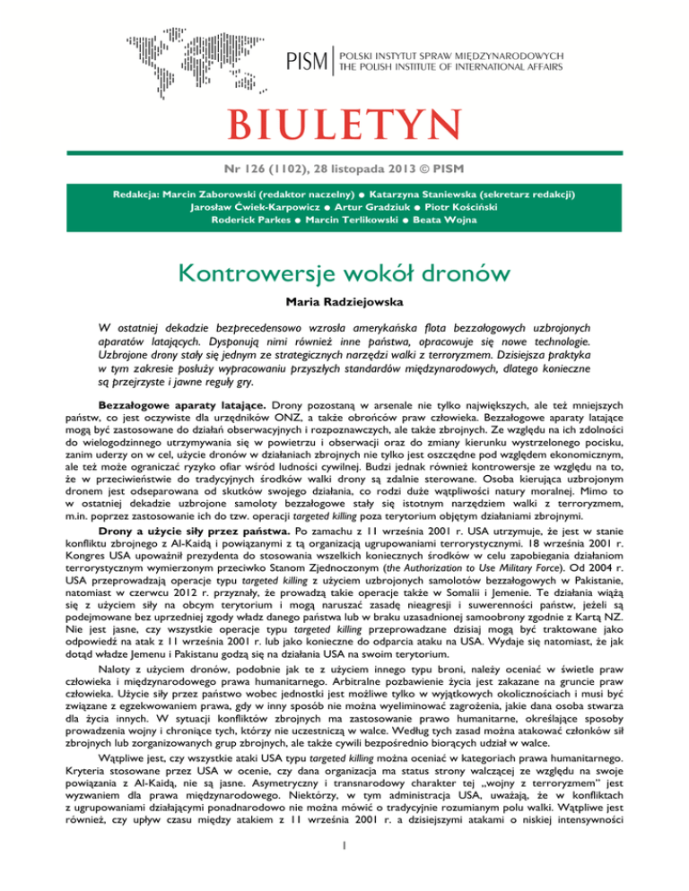 Nr 126 (1102), 28 listopada 2013 © PISM . . . .. Redakcja: Marcin Zaborowski (redaktor naczelny) Katarzyna Staniewska (sekretarz redakcji) Jarosław Ćwiek-Karpowicz Artur Gradziuk Piotr Kościński Roderick Parkes Marcin Terlikowski Beata Wojna Kontrowersje wokół dronów Maria Radziejowska W ostatniej dekadzie bezprecedensowo wzrosła amerykańska flota bezzałogowych uzbrojonych aparatów latających. Dysponują nimi równieŜ inne państwa, opracowuje się nowe technologie. Uzbrojone drony stały się jednym ze strategicznych narzędzi walki z terroryzmem. Dzisiejsza praktyka w tym zakresie posłuŜy wypracowaniu przyszłych standardów międzynarodowych, dlatego konieczne są przejrzyste i jawne reguły gry. Bezzałogowe aparaty latające. Drony pozostaną w arsenale nie tylko największych, ale teŜ mniejszych państw, co jest oczywiste dla urzędników ONZ, a takŜe obrońców praw człowieka. Bezzałogowe aparaty latające mogą być zastosowane do działań obserwacyjnych i rozpoznawczych, ale takŜe zbrojnych. Ze względu na ich zdolności do wielogodzinnego utrzymywania się w powietrzu i obserwacji oraz do zmiany kierunku wystrzelonego pocisku, zanim uderzy on w cel, uŜycie dronów w działaniach zbrojnych nie tylko jest oszczędne pod względem ekonomicznym, ale teŜ moŜe ograniczać ryzyko ofiar wśród ludności cywilnej. Budzi jednak równieŜ kontrowersje ze względu na to, Ŝe w przeciwieństwie do tradycyjnych środków walki drony są zdalnie sterowane. Osoba kierująca uzbrojonym dronem jest odseparowana od skutków swojego działania, co rodzi duŜe wątpliwości natury moralnej. Mimo to w ostatniej dekadzie uzbrojone samoloty bezzałogowe stały się istotnym narzędziem walki z terroryzmem, m.in. poprzez zastosowanie ich do tzw. operacji targeted killing poza terytorium objętym działaniami zbrojnymi. Drony a uŜycie siły przez państwa. Po zamachu z 11 września 2001 r. USA utrzymuje, Ŝe jest w stanie konfliktu zbrojnego z Al-Kaidą i powiązanymi z tą organizacją ugrupowaniami terrorystycznymi. 18 września 2001 r. Kongres USA upowaŜnił prezydenta do stosowania wszelkich koniecznych środków w celu zapobiegania działaniom terrorystycznym wymierzonym przeciwko Stanom Zjednoczonym (the Authorization to Use Military Force). Od 2004 r. USA przeprowadzają operacje typu targeted killing z uŜyciem uzbrojonych samolotów bezzałogowych w Pakistanie, natomiast w czerwcu 2012 r. przyznały, Ŝe prowadzą takie operacje takŜe w Somalii i Jemenie. Te działania wiąŜą się z uŜyciem siły na obcym terytorium i mogą naruszać zasadę nieagresji i suwerenności państw, jeŜeli są podejmowane bez uprzedniej zgody władz danego państwa lub w braku uzasadnionej samoobrony zgodnie z Kartą NZ. Nie jest jasne, czy wszystkie operacje typu targeted killing przeprowadzane dzisiaj mogą być traktowane jako odpowiedź na atak z 11 września 2001 r. lub jako konieczne do odparcia ataku na USA. Wydaje się natomiast, Ŝe jak dotąd władze Jemenu i Pakistanu godzą się na działania USA na swoim terytorium. Naloty z uŜyciem dronów, podobnie jak te z uŜyciem innego typu broni, naleŜy oceniać w świetle praw człowieka i międzynarodowego prawa humanitarnego. Arbitralne pozbawienie Ŝycia jest zakazane na gruncie praw człowieka. UŜycie siły przez państwo wobec jednostki jest moŜliwe tylko w wyjątkowych okolicznościach i musi być związane z egzekwowaniem prawa, gdy w inny sposób nie moŜna wyeliminować zagroŜenia, jakie dana osoba stwarza dla Ŝycia innych. W sytuacji konfliktów zbrojnych ma zastosowanie prawo humanitarne, określające sposoby prowadzenia wojny i chroniące tych, którzy nie uczestniczą w walce. Według tych zasad moŜna atakować członków sił zbrojnych lub zorganizowanych grup zbrojnych, ale takŜe cywili bezpośrednio biorących udział w walce. Wątpliwe jest, czy wszystkie ataki USA typu targeted killing moŜna oceniać w kategoriach prawa humanitarnego. Kryteria stosowane przez USA w ocenie, czy dana organizacja ma status strony walczącej ze względu na swoje powiązania z Al-Kaidą, nie są jasne. Asymetryczny i transnarodowy charakter tej „wojny z terroryzmem” jest wyzwaniem dla prawa międzynarodowego. Niektórzy, w tym administracja USA, uwaŜają, Ŝe w konfliktach z ugrupowaniami działającymi ponadnarodowo nie moŜna mówić o tradycyjnie rozumianym polu walki. Wątpliwe jest równieŜ, czy upływ czasu między atakiem z 11 września 2001 r. a dzisiejszymi atakami o niskiej intensywności 1 kierowanymi przez luźno powiązane ze sobą grupy stanowi o istnieniu konfliktu zbrojnego. Debata nad tymi kwestiami trwa. Konsekwencje utajnienia misji dronów. Według Council on Foreign Relations dane ze stycznia 2013 r. wskazują, Ŝe prezydent George W. Bush autoryzował 50 ataków wykonanych poza polem walki, podczas gdy prezydent Barack Obama – 350. Praktyka tzw. signature strikes, polegająca na kierowaniu pocisków na grupy osób rozpoznanych jako członkowie organizacji terrorystycznych na podstawie ich aktywności, terenu działania czy wyglądu, pozwala załoŜyć, Ŝe takie ataki są uzasadnione zebranymi informacji wywiadowczymi. Niepokojące byłoby natomiast, gdyby wynikały one z niemoŜności uzyskania wymaganych informacji. Praktyka atakowania wybranych osób na podstawie ich kluczowej pozycji w organizacji przeciwnika jest równie kontrowersyjna ze względu na niejawność procedury wyboru konkretnych „celów” i stosowanych przy tym kryteriów. Problemem są takŜe domniemane podwójne uderzenia, które mają za zadanie fizycznie wyeliminować, a nie obezwładnić przeciwnika. Kolejnym zagadnieniem jest kwestia odpowiedzialności i nadzoru nad atakami wykonywanymi przez uzbrojone samoloty bezzałogowe. W USA takie programy prowadzi zarówno CIA, jak i Wspólne Dowództwo Operacji Specjalnych (JSOC). Oba programy są niejawne, działają na róŜnych podstawach i podlegają róŜnym mechanizmom ko
