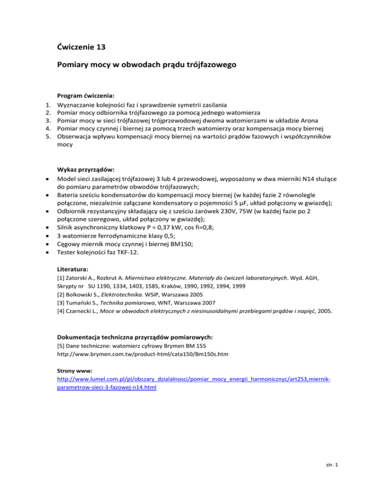 Ćwiczenie 13 Pomiary mocy w obwodach prądu trójfazowego 1. 2. 3. 4. 5. Program ćwiczenia: Wyznaczanie kolejności faz i sprawdzenie symetrii zasilania Pomiar mocy odbiornika trójfazowego za pomocą jednego watomierza Pomiar mocy w sieci trójfazowej trójprzewodowej dwoma watomierzami w układzie Arona Pomiar mocy czynnej i biernej za pomocą trzech watomierzy oraz kompensacja mocy biernej Obserwacja wpływu kompensacji mocy biernej na wartości prądów fazowych i współczynników mocy • • • • • • • Wykaz przyrządów: Model sieci zasilającej trójfazowej 3 lub 4 przewodowej, wyposażony w dwa mierniki N14 służące do pomiaru parametrów obwodów trójfazowych; Bateria sześciu kondensatorów do kompensacji mocy biernej (w każdej fazie 2 równolegle połączone, niezależnie załączane kondensatory o pojemności 5 µF, układ połączony w gwiazdę); Odbiornik rezystancyjny składający się z sześciu żarówek 230V, 75W (w każdej fazie po 2 połączone szeregowo, układ połączony w gwiazdę); Silnik asynchroniczny klatkowy P = 0,37 kW, cos fi=0,8; 3 watomierze ferrodynamiczne klasy 0,5; Cęgowy miernik mocy czynnej i biernej BM150; Tester kolejności faz TKF‐12. Literatura: [1] Zatorski A., Rozkrut A. Miernictwo elektryczne. Materiały do ćwiczeń laboratoryjnych. Wyd. AGH, Skrypty nr SU 1190, 1334, 1403, 1585, Kraków, 1990, 1992, 1994, 1999 [2] Bolkowski S., Elektrotechnika. WSiP, Warszawa 2005 [3] Tumański S., Technika pomiarowa, WNT, Warszawa 2007 [4] Czarnecki L., Moce w obwodach elektrycznych z niesinusoidalnymi przebiegami prądów i napięć, 2005. Dokumentacja techniczna przyrządów pomiarowych: [5] Dane techniczne: watomierz cyfrowy Brymen BM 155 http://www.brymen.com.tw/product‐html/cata150/Bm150s.htm Strony www: http://www.lumel.com.pl/pl/obszary_dzialalnosci/pomiar_mocy_energii_harmonicznyc/art253,miernik‐ parametrow‐sieci‐3‐fazowej‐n14.html str. 1 Zakres wymaganych wiadomości do kolokwium wstępnego: • • • • • • • Definicje: mocy chwilowej, czynnej, biernej i pozornej dla obwodów prądu sinusoidalnego, wartości skutecznej, współczynnika mocy, jednostki energii i sposób ich przeliczania budowa i zasada działania analogowych watomierzy ferrodynamicznych, struktura watomierza cyfrowego i sposób wyznaczania wyniku pomiaru, metody pomiaru mocy czynnej jednym, dwoma i trzema watomierzami, metody pomiaru mocy biernej jednym, dwoma i trzema watomierzami, ograniczenia stosowania różnych konfiguracji pomiaru w zależności od niesymetrii zasilania lub obciążenia, sposób obliczania błędów granicznych w pomiarach mocy czynnej. str. 2 Cel ćwiczenia Zapoznanie z metodami pomiaru mocy czynnej i biernej a także kompensacji mocy biernej w obwodach trójfazowych. Wstęp teoretyczny Jednym z parametrów określających szybkość przesyłu energii elektrycznej jest moc pozorna. W obwodach jednofazowych prądu przemiennego jest ona określona zależnością ( to wartość skuteczna napięcia, to wartość skuteczna prądu). Moc pozorną można rozłożyć zgodnie z zależnością na dwa składniki: moc czynną związaną z nieodwracalnym przepływem energii do odbiornika oraz moc bierną pobieraną przez odbiorniki, które oprócz rezystancji posiadają także niezerową reaktancję (indukcyjną lub pojemnościową). Przesunięcie fazowe prądu względem napięcia powoduje, że część prądu nie jest zamieniana na użyteczną pracę (np. pracę mechaniczną w silnikach). Na użyteczną pracę przekłada się jedynie składowa prądu zgodna w fazie z napięciem. Składowa ta określa moc czynną . Pokazano to na wykresie wskazowym (rys. 1). Składowa prądu prostopadła do wskazu napięcia, związana z mocą bierną , nie bierze udziału w wytwarzaniu użytecznej pracy, lecz zwiększa wartość skuteczną prądu przesyłanego do odbiornika (w odniesieniu do odbiornika pobierającego wyłącznie moc czynną o takiej samej wartości) i przyczynia się do powstawania strat w liniach przesyłowych. Rysunek 1 Wykresy wskazowe: (lewy) rozkład prądu na składowe zgodną w fazie ze wskazem napięcia i prostopadłą do wskazu napięcia; (prawy) rozkład mocy pozorne na składowe czynną oraz bierną . Linią kropkowaną pokazano wartość teoretycznie możliwej do przesłania mocy czynnej w przypadku ograniczenia wartości mocy biernej aż do zera. jest kątem przesunięcia fazowego prądu względem napięcia. Z konstrukcji systemu przesyłowego wynika obciążalność długotrwała, czyli maksymalna wartość skuteczna prądu, który przepływając przez system w sposób długotrwały nie wywołuje negatywnych skutków dla systemu (np. nie powoduje przegrzania linii). Przesyłanie mocy biernej ogranicza zatem wartość możliwej do przesłania mocy czynnej. Miarą zmniejszenia przesyłanej mocy względem teoretycznie możliwej do przesłania jest współczynnik mocy / , który w najlepszym wypadku może osiągnąć wartość 1 gdy . W miernikach i dokumentacji anglojęzycznej współczynnik mocy oznaczany jest jako PF (od ang. Power Factor). W obwodach jednofazowych prądu sinusoidalnego oraz trójfazowych obwodach prądu sinusoidalnego o symetrycznym zasilaniu i symetrycznym obciążeniu współczynnik mocy jest równy cos , gdyż jedyną przyczyną obniżenia go poniżej wartości 1 jest przesunięcie fazowe prądu względem napięcia. str. 3 Z opisanym zjawiskiem wiąże się pojęcie kompensacji mocy biernej w celu poprawy współczynnika mocy czyli zmniejszenia strat przesyłowych. W najprostszym omawianym wypadku kompensacja mocy biernej polega na korygowaniu kąta przesunięcia fazowego za pomocą elementów reaktancyjnych przyłączonych najczęściej równolegle do odbiornika. Tak samo kompensujemy moc bierną w obwodach trójfazowych zrównoważonych (o symetrycznych napięciach zasilających i symetrycznym odbiorniku) prądu sinusoidalnego (o sinusoidalnych prądach i napięciach)1. W niniejszym ćwiczeniu dy