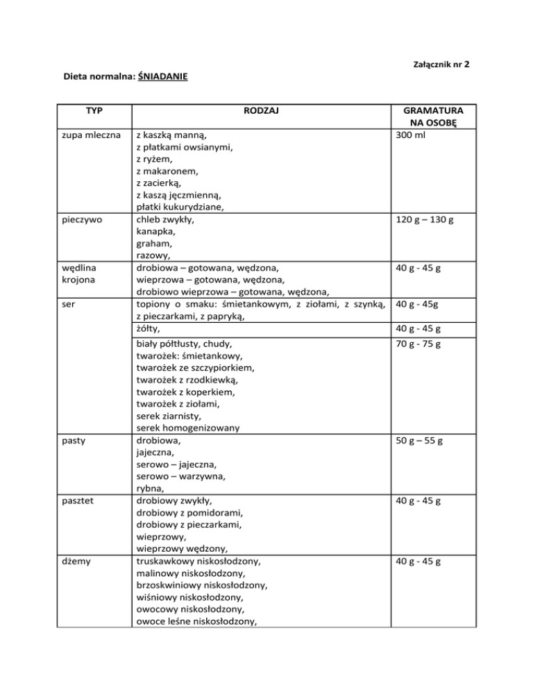 Załącznik nr 2 Dieta normalna: ŚNIADANIE TYP zupa mleczna pieczywo wędlina krojona ser pasty pasztet dżemy RODZAJ GRAMATURA NA OSOBĘ 300 ml z kaszką manną, z płatkami owsianymi, z ryżem, z makaronem, z zacierką, z kaszą jęczmienną, płatki kukurydziane, chleb zwykły, 120 g – 130 g kanapka, graham, razowy, drobiowa – gotowana, wędzona, 40 g - 45 g wieprzowa – gotowana, wędzona, drobiowo wieprzowa – gotowana, wędzona, topiony o smaku: śmietankowym, z ziołami, z szynką, 40 g - 45g z pieczarkami, z papryką, żółty, 40 g - 45 g biały półtłusty, chudy, twarożek: śmietankowy, twarożek ze szczypiorkiem, twarożek z rzodkiewką, twarożek z koperkiem, twarożek z ziołami, serek ziarnisty, serek homogenizowany drobiowa, jajeczna, serowo – jajeczna, serowo – warzywna, rybna, drobiowy zwykły, drobiowy z pomidorami, drobiowy z pieczarkami, wieprzowy, wieprzowy wędzony, truskawkowy niskosłodzony, malinowy niskosłodzony, brzoskwiniowy niskosłodzony, wiśniowy niskosłodzony, owocowy niskosłodzony, owoce leśne niskosłodzony, 70 g - 75 g 50 g – 55 g 40 g - 45 g 40 g - 45 g jajko ryba paprykarz warzywa napoje masło dodatki gotowane smażone na maśle w galarecie, w sosie pomidorowym Szczeciński 50 g – 60 g 100 g - 110 g 100 g – 105 g 50 g – 55 g 50 g – 55g pomidor, ogórek konserwowy, ogórek kiszony, ogórek świeży papryka świeża, papryka konserwowa, rzodkiewka, szczypiorek, sałata, 50 g – 55 g 30 g – 35 g kawa zbożowa z mlekiem, herbata czarna expressowa, herbata owocowa expressowa, kakao, 82 % tłuszczu musztarda zwykła, ketchup łagodny, majonez, chrzan, cukier, cytryna, 30 g – 35 g 1 sztuka 1 łyżeczka 2 listki średniej wielkości 250 ml 20 g 7g Dieta normalna: OBIAD TYP zupa kiełbasa mięso gołąbki ryba RODZAJ rosół z makaronem, rosół z kaszką manną, pomidorowa z ryżem, pomidorowa z makaronem, ogórkowa, owocowa, kapuśniak z kapusty świeżej, kapuśniak z kapusty kiszonej, kalafiorowa, brokułowa, kalarepowa, jarzynowa - składająca się min. z pięciu składników, grochowa, fasolowa, pieczarkowa, barszcz czerwony z makaronem lub z ziemniakami, barszcz biały z makaronem lub z ziemniakami, szpinakowa, żurek z jajkiem, krupnik, flaczki z boczniaka smażona z cebulką, Wieprzowe: smażone, duszone, gotowane: schab, żeberka, szynka, biodrówka, karkówka, gulaszowe, mielone, łopatka, Drobiowe: smażone, duszone, gotowane: udka, skrzydełka, filet z kurczaka, żołądki, wątróbka, z mięsem wieprzowym i kaszą, z mięsem wieprzowym i ryżem, smażona, gotowana, z pieca, filet z miruny, dorsza, morszczuka, GRAMATURA NA OSOBĘ 400 ml 90 g - 100 g 100 g – 110 g 100 g – 120 g 100 g – 110 g warzywa gotowane w wodzie lub na parze, świeże, surówki 120 g – 125 g marchewka, pietruszka, seler, por, kapusta biała, kapusta czerwona, kapusta pekińska, kapusta kiszona, fasola szparagowa, groszek, kalafior, brokuł, szpinak, buraki, sałata zwykła, sałata lodowa, koper, natka pietruszki, ogórek świeży, ogórek konserwowy mizeria 200 ml kluski pyzy parowane, szagówki (kopytka), śląskie, lane, łyżką kładzione, pieczeniowy ciemny, pieczeniowy jasny, potrawkowy, pomidorowy, warzywny, myśliwski, chrzanowy, pieczarkowy, słodko – kwaśny, koperkowy, owocowy, bez dodatku, z cukrem, z dżemem, z serem, z owocami, z mięsem typu krokiet, z serem, owocami, mięsem, ruskie, leniwe, z: owocem, serem, mięsem, warzywami gotowane, puree, smażone, z: warzywami, mięsem, serem sosy naleśniki, omlety pierogi knedle ziemniaki zapiekanka makaronowa leczo jajko ryż biały 120 g – 125 g 100 g – 105 g 300 g – 310 g 300 g – 310 g 300 g – 310 g 200 g – 210 g 300 g – 310 g papryka, pieczarki, cebula, pomidor, czosnek, kiełbasa 300 g – 310 g typu śląska lub parówka drobiowa sadzone, 100 g – 120 g gotowane, kotlet jajeczny, gotowany 150 g – 160 g risotto 150 g – 160 g łazanki pizza z mięsem, z warzywami, gotowana jęczmienna, gotowana gryczana gotowany: świderki, kolanka, rurki, muszelki, spaghetti z mięsem, z serem, z warzywami z kapustą, mięsem lub boczkiem z: warzywami, serem, mięsem, grzybami, rybą krokiety z: serem, mięsem, kapustą, grzybami, warzywami 220 g – 230 g napoje kompot z kawałkami owoców sok przecierowy: pomidorowy, wielowarzywny, jabłkowo – marchewkowy przyprawa do zup typu maggi, oliwa, śmietana, kefir, jogurt naturalny 250 ml 250 ml kasza makaron dodatki 100 g + 110 g 150 g – 160 g 150 g – 160 g 300 g – 310 g 1g 1 łyżka 20 g – 25 g Dieta normalna: PODWIECZOREK TYP ryż kaszka manna budyń galaretka kisiel naleśniki, omlety owsianka kanapka pieczywo drożdżówka pączek zupa rogal racuchy makaron koktajl owoc jogurt RODZAJ gotowany na mleku z cynamonem, gotowany na mleku z sokiem, gotowany na mleku z jabłkiem, gotowana na mleku z sokiem, gotowana na mleku z masłem, z sokiem, z owocami, z owocami, z dżemem, z cukrem, gotowana na mleku z owocem, gotowana na wodzie z owocem, składająca się minimum z trzech składników typu: - pieczywo, wędlina drobiowa lub wieprzowa, warzywo, - pieczywo, ser biały lub żółty lub topiony, warzywo, z dżemem, z owocem, kruszonką, serem, budyniem z marmoladą, krem warzywny, mleczny, słodki, maślany, z cukrem, z sosem owocowym na mleku, kefirze, jogurcie z owocami lub z płatkami owsianymi banan, jabłko, sezonowe, naturalny, z kawałkami owoców, GRAMATURA NA OSOBĘ 150 g – 160 g 150 g – 160 g 150 g – 160 g 250 g – 260 g 250 g – 160 g 100 g – 110 g 120 g – 130 g 70 g – 80 g 70 g – 80 g 120 g – 130 g 80 g – 100 g 250 ml 60 g – 70 g 100 g – 110 g 100 g – 110 g 250 ml 150 g – 160 g 120 g – 180 g Dieta normalna: KOLACJA TYP pieczywo wędlina krojona ser pasty pasztet ryba paprykarz warzywa RODZAJ chleb zwykły, kanapka, graham, razowy, drobiowa – gotowana, wędzona, wieprzowa – gotowana, wędzona, drobiowo – wieprzowa – gotowana, wędzona, topiony o smaku: śmietankow