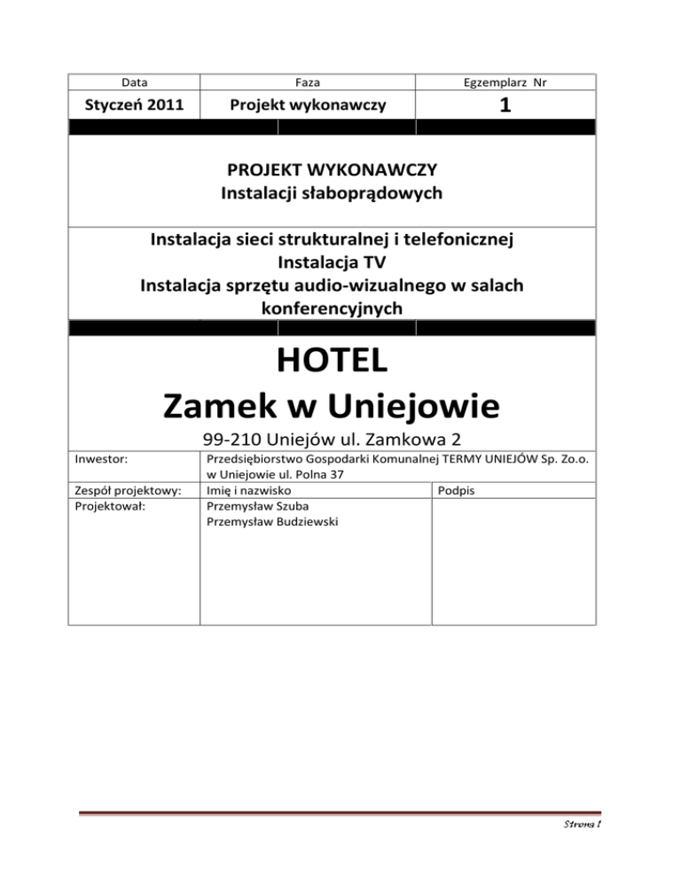 Data Styczeń 2011 Faza Projekt wykonawczy Egzemplarz Nr 1 PROJEKT WYKONAWCZY Instalacji słaboprądowych Instalacja sieci strukturalnej i telefonicznej Instalacja TV Instalacja sprzętu audio-wizualnego w salach konferencyjnych HOTEL Zamek w Uniejowie Inwestor: Zespół projektowy: Projektował: 99-210 Uniejów ul. Zamkowa 2 Przedsiębiorstwo Gospodarki Komunalnej TERMY UNIEJÓW Sp. Zo.o. w Uniejowie ul. Polna 37 Imię i nazwisko Podpis Przemysław Szuba Przemysław Budziewski Strona 1 I . SIEĆ TELEINFORMATYCZNA 1. Opis techniczny ..............................................................................................................................4 1.1 Podstawa opracowania .............................................................................................................4 1.2 Zakres opracowania ..................................................................................................................4 1.3 Wykorzystane normy i materiały ...............................................................................................4 1.4 Ogólna charakterystyka obiektu ................................................................................................5 2. Sieć okablowania strukturalnego.....................................................................................................6 2.1 Wymagania dotyczące doboru systemu okablowania ................................................................6 2.2 Założenia techniczne .................................................................................................................6 2.3 Okablowanie poziome ...............................................................................................................7 2.4 Szafy sprzętowe ......................................................................................................................10 2.5 Trasy kablowe .........................................................................................................................11 2.6 Zasilanie elektryczne ...............................................................................................................11 2.7 Klimatyzacja ............................................................................................................................12 3. Dodatki .........................................................................................................................................12 Strona 2 II . INSTALACJA TV 1. Część ogólna .................................................................................................................................14 1.1 Podstawa opracowania ...........................................................................................................14 1.2 Zakres opracowania ................................................................................................................14 1.3 Normy .....................................................................................................................................14 2. Założenia projektowe ....................................................................................................................16 3. Opis rozwiązań technicznych .........................................................................................................17 3.1 Integracja ................................................................................................................................18 3.2 Anteny ....................................................................................................................................18 3.3 Stacja czołowa .........................................................................................................................18 3.4 Modulator sygnału TV .............................................................................................................18 3.5 Wielokanałowy wzmacniacz selektywny ..................................................................................18 3.6 Tory kablowe...........................................................................................................................18 3.8 Instalacja .................................................................................................................................19 Strona 3 1. Opis techniczny 1.1 Podstawa opracowania Projekt opracowano w oparciu o: • Zlecenie Inwestora • Uzgodnienia wstępne z Inwestorem UWAGA: Wszystkie elementy wpływające na wystrój wnętrz należy bezwzględnie uzgodnić z architektem wnętrz. • Wytyczne branżowe • Obowiązujące normy i przepisy 1.2 Zakres opracowania Przedmiotem opracowania jest Projekt wykonawczy sieci okablowania strukturalnego w hotelu w Uniejowie przy ul. Zamkowej 2. W zakres niniejszego opracowania wchodzi: 1. Okablowanie strukturalne poziome 2. Szafy sprzętowe 3. Trasy kablowe 1.3 Wykorzystane normy i materiały Projekt został wykonany w oparciu o: • Wytyczne Inwestora, • Normę EIA/TIA-586A – Okablowanie telekomunikacyjne biurowców (USA), • Normę ISO/IEC – 11801 – Okablowanie strukturalne budynków (międzynarodowa), • Normę EN 50173 – Okablowanie strukturalne budynków (europejska) • Normę EN 50174 – Norma elektryczna (rozdziały dot. Separacji pomiędzy instalacją elektryczną a siecią logiczną, oraz uziemienie), • Zgodnie z praktyką projektowania i wykonywania tego rodzaju instalacji w obiektach o podobnym przeznaczeniu i stopniu złożoności Strona 4 1.4 Ogólna charakterystyka obiektu Projektowany obiekt jest budynkiem zabytkowym, przeznaczonym na pomieszczenia hotelowo-rekreacyjne. W ramach sieci okablowania strukturalnego przewidziano dla każdego pokoju hotelowego punkt przyłączeniowy sieci LAN. Centralnym punktem (CPD) sieci jest szafa serwerowa stojąca 19” 42U 800/1000/1980, zlokalizowana na I piętrze za recepcją. Pośredni punkt dystrybucyjny (PPD) został umieszczony na poziomie poddasza 