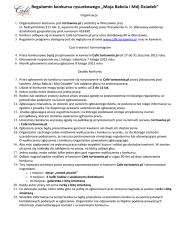 Regulamin konkursu rysunkowego „Moja Babcia i Mój Dziadek” Organizacja 1. Organizatorem konkursu jest tortownia.pl z siedzibą w Warszawie przy ul. Radzymińskiej 211 lok. 2, wpisana do prowadzonej przez Prezydenta m. st. Warszawy ewidencji działalności gospodarczej pod numerem 432490. 2. Konkurs odbywa się w kawiarni Cafe tortownia.pl przy ulicy Handlowej 60 w Warszawie. 3. Regulamin programu dostępny jest do wglądu na stronie www.cafe.tortownia.pl oraz w kawiarni. Czas trwania i harmonogram 4. Prace konkursowe będą przyjmowane w kawiarni Cafe tortownia.pl od 17 do 31 stycznia 2012 roku. 5. Głosowanie rozpocznie się 1 lutego i zakończy 7 lutego 2012 roku 6. Wyniki głosowania zostaną ogłoszone 8 lutego 2012 roku Zasady konkursu 7. Przez zgłoszenie do konkursu rozumie się narysowanie w Cafe tortownia.pl pracy plastycznej pod tytułem „Moja Babcia i Mój Dziadek” lub oddanie głosu na wybraną pracę. 8. Udział w konkursie mogą wziąć dzieci w wieku od 2 do 12 lat. 9. Jedna osoba może dostarczyć jedną pracę. 10. Rodzic lub opiekun prawny autora pracy wyraża zgodę na postanowienia niniejszego regulaminu co potwierdza podpisem na karcie zgłoszeniowej. 11. Zgłaszający oświadcza, że dziecko jest autorem zgłoszonego dzieła, że podane przez niego informacje są zgodne z prawdą i że dysponuje prawami autorskimi do zgłaszanej pracy. 12. Osoba zgłaszająca pracę wypełnia kupon; na którego podstawie zostaje przydzielony numer porządkowy, którym zostanie opatrzona zgłoszona praca. 13. Uczestnicy konkursu wyrażają zgodę na publikację przyniesionych prac na łamach serwisu tortownia.pl i Cafe.tortownia.pl. 14. Zgłoszone prace będą prezentowane gościom kawiarni od chwili ich dostarczenia 15. Organizator zastrzega sobie możliwość wykluczenia z konkursu rysunku, co do którego zachodzi uzasadnione podejrzenia, że narusza postanowienia niniejszego regulaminu lub obowiązujące prawo. O wykluczeniu zgłoszenia z konkursu organizator powiadomi zgłaszającego. 16. Aby móc zagłosować na wybraną pracę należy wypełnić kupon i oddać go obsłudze kawiarni. W zamian otrzyma się naklejkę do naklejenia na pracę, na którą oddaje głos. 17. Jedna osoba, może oddać tylko jeden głos pod rygorem wykluczenia z konkursu. 18. Odbiór nagród będzie możliwy w kawiarni Cafe tortownia.pl w ciągu 30 dni od daty zakończenia konkursu. 19. Trzy najwyżej ocenione prace zostaną zaprezentowane w kawiarni Cafe tortownia.pl i uhonorowane nagrodami: • I miejsce: deser „statek piracki” • II miejsce: 2 kulki lodów z ulubionymi dodatkami • III miejsce: galaretka z bitą śmietaną 20. Każdy autor pracy otrzyma rurkę z bitą śmietaną. 21. Co dziesiąta osoba, która odda głos na jedną ze zgłoszonych prac otrzyma nagrodę w postaci rurki z bitą śmietaną . 22. Wszelkie informacje na temat konkursu będą przesyłane uczestnikom konkursu za pomocą danych kontaktowych podanych w zgłoszeniu. Organizator nie odpowiada za błędne podanie powyższych informacji uniemożliwiające kontakt z uczestnikami konkursu.