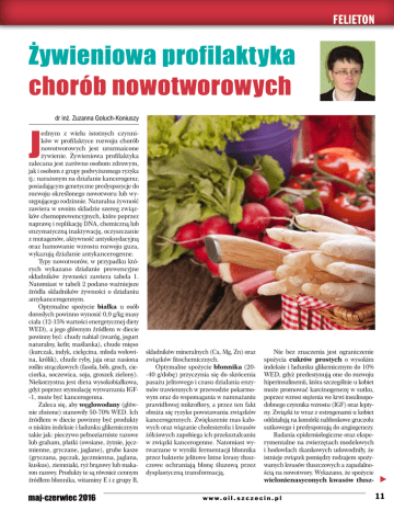 FELIETON Żywieniowa profilaktyka chorób nowotworowych J dr inż. Zuzanna Goluch-Koniuszy ednym z wielu istotnych czynni‑ ków w profilaktyce rozwoju chorób nowotworowych jest urozmaicone żywienie. Żywieniowa profilaktyka zalecana jest zarówno osobom zdrowym, jak i osobom z grupy podwyższonego ryzyka tj.: narażonym na działanie kancerogenu; posiadającym genetyczne predyspozycje do rozwoju określonego nowotworu lub wy‑ stępującego rodzinnie. Naturalna żywność zawiera w swoim składzie szereg związ‑ ków chemoprewencyjnych, które poprzez naprawę i replikację DNA, chemiczną lub enzymatyczną inaktywację, oczyszczanie z mutagenów, aktywność antyoksydacyjną oraz hamowanie wzrostu rozwoju guza, wykazują działanie antykancerogenne. Typy nowotworów, w przypadku któ‑ rych wykazano działanie prewencyjne składników żywności zawiera tabela 1. Natomiast w tabeli 2 podano ważniejsze źródła składników żywności o działaniu antykancerogennym. Optymalne spożycie białka u osób dorosłych powinno wynosić 0,9 g/kg masy ciała (12‑15% wartości energetycznej diety WED), a jego głównym źródłem w diecie powinny być: chudy nabiał (twaróg, jogurt naturalny, kefir, maślanka), chude mięso (kurczak, indyk, cielęcina, młoda wołowi‑ na, królik), chude ryby, jaja oraz nasiona roślin strączkowych (fasola, bób, groch, cie‑ ciorka, soczewica, soja, groszek zielony). Niekorzystna jest dieta wysokobiałkowa, gdyż poprzez stymulację wytwarzania IGF ‑1, może być kancerogenna. Zaleca się, aby węglowodany (głów‑ nie złożone) stanowiły 50‑70% WED. Ich źródłem w diecie powinny być produkty o niskim indeksie i ładunku glikemicznym takie jak: pieczywo pełnoziarniste razowe lub graham, płatki (owsiane, żytnie, jęcz‑ mienne, gryczane, jaglane), grube kasze (gryczana, pęczak, jęczmienna, jaglana, kuskus), ziemniaki, ryż brązowy lub maka‑ ron razowy. Produkty te są również cennym źródłem błonnika, witaminy E i z grupy B, maj-czerwiec 2016 składników mineralnych (Ca, Mg, Zn) oraz związków fitochemicznych. Optymalne spożycie błonnika (20 ‑40 g/dobę) przyczynia się do skrócenia pasażu jelitowego i czasu działania enzy‑ mów trawiennych w przewodzie pokarmo‑ wym oraz do wspomagania w namnażaniu prawidłowej mikroflory, a przez ten fakt obniża się ryzyko powstawania związków kancerogennych. Zwiększenie mas kało‑ wych oraz wiązanie cholesterolu i kwasów żółciowych zapobiega ich przekształcaniu w związki kancerogenne. Natomiast wy‑ twarzane w wyniki fermentacji błonnika przez bakterie jelitowe lotne kwasy tłusz‑ czowe ochraniają błonę śluzową przez dysplastyczną transformacją. Nie bez znaczenia jest ograniczenie spożycia cukrów prostych o wysokim indeksie i ładunku glikemicznym do 10% WED, gdyż predestynują one do rozwoju hiperinsulinemii, która szczególnie u kobiet może promować karcinogenezę w sutku, poprzez wzrost stężenia we krwi insulinopo‑ dobnego czynnika wzrostu (IGF) oraz lepty‑ ny. Związki te wraz z estrogenami u kobiet oddziałują na komórki nabłonkowe gruczołu sutkowego i predysponują do angiogenezy. Badania epidemiologiczne oraz ekspe‑ rymentalne na zwierzętach modelowych i hodowlach tkankowych udowodniły, że istnieje związek pomiędzy rodzajem spoży‑ wanych kwasów tłuszczowych a zapadalno‑ ścią na nowotwory. Wykazano, że spożycie wielonienasyconych kwasów tłusz‑ w w w. o i l . s z c z e c i n . p l 11 FELIETON Tabela 1. Typy nowotworów, w przypadku których wykazano działanie prewencyjne składników żywności Zmniejszone ryzyko rozwoju nowotworu Gardła Gruczołu krokowego Jajnika Jelita cienkiego Jamy ustnej Jelita grubego Krtani Odbytnicy Pęcherza moczowego Płuc Przełyku Skóry Sutka Szyi i głowy Szyjki i trzonu macicy Ślinianek Trzustki Żołądka Składnik prewencyjny Karotenoidy, witamina C Kwasy tłuszczowe omega-3, kwas CLA, karotenoidy, witaminy: E, D3, związki polifenolowe (likopen, fitoestrogeny, glukozynolany, izoflawony, resweratrol), selen Retinol i retinoidy Błonnik Karotenoidy, witamina C Błonnik, kwasy tłuszczowe omega-3, kwas CLA, witaminy: C, E, D3, foliany, związki polifenolowe (glukozynolany, resweratrol, antocyjany), wapń, selen, związki organosiarkowe (czosnek), probiotyki, prebiotyki, kurkumina Karotenoidy Błonnik, witamina C, probiotyki i prebiotyki Karotenoidy, witamina C, związki polifenolowe (gallusan epigallokatechiny, likopen), prebiotyki, selen Kwasy tłuszczowe omega-3, kwas CLA, karotenoidy, witamina C, E, selen Błonnik, karotenoidy, witaminy: C, E, foliany Kwas CLA, retinol i retinoidy, związki polifenolowe (galusan epigallokatechiny, likopen, antocyjany), selen, Błonnik, kwasy tłuszczowe omega-3, kwas CLA, witaminy: C, E, D3, B6, związki polifenolowe (fitoestrogeny, izotiocyjaniany, lignany, resweratrol), wapń, kurkumina Związki polifenolowe (genisteina) Witamina C, związki polifenolowe (likopen, glukozynolany) Witamina C Błonnik, kwasy tłuszczowe omega-3, witamina C, D3, foliany Błonnik, kwasy tłuszczowe omega-3, kwas CLA, karotenoidy, witamina C, E, selen Tabela 2. Występowanie składników żywności o działaniu antykancerogennym Związek Frakcje rozpuszczalne Frakcje nierozpuszczalne β-karoten β-kryptoksantyna Likopen Kwasy fenolowe 12 Przykład związku Występowanie Błonnik pektyny, alginiany, Warzywa, owoce (maliny, jabłka, poziomki), siemię lniane, nasiona karageny, część hemiceluloz, babki płesznik i kozieradki agar, gumy, śluzy roślinne ligniny, większość hemice- Pieczywo pełnoziarniste, płatki zbożowe, grube kasze, mąka z pełluloz, nego przemiału, owoce (jabłka, gruszki, brzoskwinie, truskawki), celuloza warzywa (brukselka, fasola, groch, fasola szparagowa, buraki, rzodkiewka, kukurydza, kapustne, kalafior, brokuł) Karotenoidy Marchew, dynia, papryka czerwona, pomidory, szpinak, sałata, brokuły, słodkie ziemniaki, melon, pom