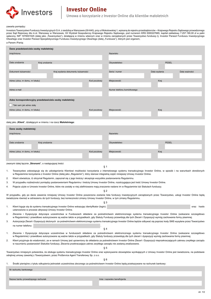 Investor Online Umowa o korzystanie z Investor Online dla klientów małoletnich zawarta pomiędzy: Investors Towarzystwo Funduszy Inwestycyjnych S.A. z siedzibą w Warszawie (00-640), przy ul Mokotowskiej 1, wpisaną do rejestru przedsiębiorców – Krajowego Rejestru Sądowego prowadzonego przez Sąd Rejonowy dla m.st. Warszawy w Warszawie, XII Wydział Gospodarczy Krajowego Rejestru Sądowego, pod numerem KRS 0000227685, kapitał zakładowy 7.257.190,00 zł w pełni opłacony, NIP 1070001525 (dalej jako „Towarzystwo”), działającą w imieniu własnym oraz w imieniu zarządzanych przez Towarzystwo funduszy tj. Investor Parasol Funduszu Inwestycyjnego Otwartego oraz Investor Parasol Specjalistycznego Funduszu Inwestycyjnego Otwartego (dalej „Fundusze”), których jest organem, a Panem /Panią: Dane przedstawiciela osoby małoletniej: Nazwisko Imię/Imiona Data urodzenia Kraj urodzenia Obywatelstwo Seria i numer Kraj wydania dokumentu tożsamości Dokument tożsamości Adres (ulica, nr domu, nr lokalu) Miejscowość Kod pocztowy PESEL Data wydania Data ważności Kraj Numer telefonu komórkowego Adres e-mail Ades korespondencyjny przedstawiciela osoby małoletniej: Taki sam jak adres stały Adres (ulica, nr domu, nr lokalu) Miejscowość Kod pocztowy Kraj dalej jako „Klient”, działającym w imieniu i na rzecz Małoletniego: Dane osoby małoletniej: Nazwisko Imię/Imiona Data urodzenia Kraj urodzenia Adres (ulica, nr domu, nr lokalu) Obywatelstwo Miejscowość Kod pocztowy PESEL Kraj zwanymi dalej łącznie „Stronami”, o następującej treści: §1 1. Towarzystwo zobowiązuje się do udostępnienia Klientowi możliwości korzystania z internetowego systemu transakcyjnego Investor Online, w sposób i na warunkach określonych w Regulaminie korzystania z Investor Online (dalej jako „Regulamin”), który stanowi integralną część niniejszej Umowy Investor Online. 2. Klient oświadcza, iż otrzymał Regulamin, zapoznał się z jego treścią i akceptuje wszystkie postanowienia Regulaminu. 3. W przypadku rozbieżności pomiędzy postanowieniami Regulaminu i treścią Umowy Investor Online, rozstrzygająca jest treść Umowy Investor Online. 4. Pojęcia użyte w Umowie Investor Online, które nie zostały w niej zdefiniowane mają znaczenie nadane im w Regulaminie lub Statutach funduszy. §2 W przypadku, gdy po dacie zawarcia niniejszej Umowy Investor Online poszerzona zostanie lista funduszy inwestycyjnych zarządzanych przez Towarzystwo, usługi Investor Online będą świadczone również w odniesieniu do tych funduszy, bez konieczności zmiany Umowy Investor Online, w tym zmiany Regulaminu. §3 1. Klient loguje się do systemu transakcyjnego Investor Online wskazując identyfikator (login): ustanowione w procesie aktywacji Umowy Investor Online. 2. Zlecenia i Dyspozycje dotyczące uczestnictwa w Funduszach składane za pośrednictwem elektronicznego systemu transakcyjnego Investor Online (wskazane szczegółowo w Regulaminie) i prawidłowo autoryzowane są ważne także w przypadkach, gdy Statuty Funduszy przewidują dla tych Zleceń i Dyspozycji wymóg zachowania formy pisemnej. 3. Autoryzacja Zleceń i Dyspozycji złożonych za pośrednictwem elektronicznego systemu transakcyjnego Investor Online będzie odbywać się poprzez kody SMS wysyłane przez Towarzystwo na numer telefonu: oraz hasło . §4 1. Zlecenia i Dyspozycje dotyczące uczestnictwa w funduszach składane za pośrednictwem elektronicznego systemu transakcyjnego Investor Online (wskazane szczegółowo w Regulaminie) i prawidłowo autoryzowane są ważne także w przypadkach, gdy Statuty funduszy przewidują dla tych zleceń i dyspozycji wymóg zachowania formy pisemnej. 2. Klient przyjmuje do wiadomości, ze w ramach Umowy jest uprawniony do składania za pośrednictwem Investor Online Zleceń i Dyspozycji nieprzekraczających zakresu zwykłego zarządu w rozumieniu postanowień Statutów funduszy. Zlecenia przekraczające zakres zwykłego zarządu nie zostaną zrealizowane. §5 Towarzystwo niniejszym potwierdza, że obsługa systemu transakcyjnego Investor Online oraz wykonywanie obowiązków wynikających z Umowy Investor Online jest świadczona, na podstawie odrębnej umowy zawartej z Towarzystwem, przez ProService Agent Transferowy Sp. z o.o. §6 1. Środki pieniężne z tytułu odkupienia jednostek uczestnictwa zleconego za pośrednictwem Investor Online będą przekazywane na rachunek bankowy: Nr rachunku bankowego Nazwa banku prowadzącego rachunek Imie i nazwisko beneficjenta str. 1/2 2. W przypadku, gdy rachunek bankowy wskazany w ust. 1 powyżej prowadzony jest, w walucie innej niż waluta, w której zgodnie ze Statutem Funduszu są wypłacane środki z tytułu odkupienia jednostek uczestnictwa, Fundusz dokona przelewu środków uzyskanych z odkupienia na wskazany rachunek. W takim przypadku środki mogą zostać obciążone kosztami przewalutowania przez bank, w którym prowadzony jest rachunek Klienta. §7 Klient niniejszym wyraża zgodę na utrwalanie i przechowywanie przez Towarzystwo wszystkich Zleceń i Dyspozycji złożonych za pośrednictwem Investor Online dla celów dowodowych. §8 Podpisując Umowę Investor Online Klient wyraża zgodę na przetwarzanie jego danych osobowych oraz danych osobowych Małoletniego przez Towarzystwo, fundusze oraz podmioty, którym Towarzystwo lub fundusze zleciło wykonywanie usług, w zakresie niezbędnym dla celów prawidłowego wykonania niniejszej Umowy Investor Online, w szczególności przez ProService Agent Transferowy Sp. z o.o. z siedzibą w Warszawie przy ul. Puławskiej 436 oraz Exorigo Sp. z o.o. z siedzibą w Warszawie przy ul. Kruczej 50. Klient ma prawo wglądu do swoich danych osobowych i żądania ich zmiany w każdym czasie. §9 1. Umowa wchodzi w życie z dniem jej zawarcia i obowiązuje do końca dnia poprzedzającego dzień ukończenia przez Małoletniego 18 (osiemnastego) roku życia. 2. Strony mogą wypowiedzieć Umowę Investor 