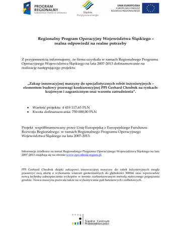 Regionalny Program Operacyjny Województwa Śląskiego – realna odpowiedź na realne potrzeby Z przyjemnością informujemy, że firma uzyskała w ramach Regionalnego Programu Operacyjnego Województwa Śląskiego na lata 2007-2013 dofinansowanie na realizację następującego projektu: „Zakup innowacyjnej maszyny do specjalistycznych robót inżynieryjnych – elementem budowy przewagi konkurencyjnej PPI Gerhard Chrobok na rynkach: krajowym i zagranicznym oraz wzrostu zatrudnienia”. Wartość projektu: 4 419 117,65 PLN Kwota dofinansowania: 750 000,00 PLN Projekt współfinansowany przez Unię Europejską z Europejskiego Funduszu Rozwoju Regionalnego w ramach Regionalnego Programu Operacyjnego Województwa Śląskiego na lata 2007-2013. Informacje źródłowe na temat Regionalnego Programu Operacyjnego Województwa Śląskiego na lata 2007-2013 znajdują się na stronie www.rpo.silesia-region.pl. PPI Gerhard Chrobok dzięki zakupowi innowacyjnej maszyny do robót inżynieryjnych mogła poszerzyć swą ofertę o wykonanie wierceń geotermalnych do głębokości 3000m oraz wprowadzić nową technikę zabezpieczenia wykopów w terenie zurbanizowanym metodą statycznego pogrążania grodzic. Nowa maszyna pozwala także na wykonywanie pali betonowych i żelbetowych.