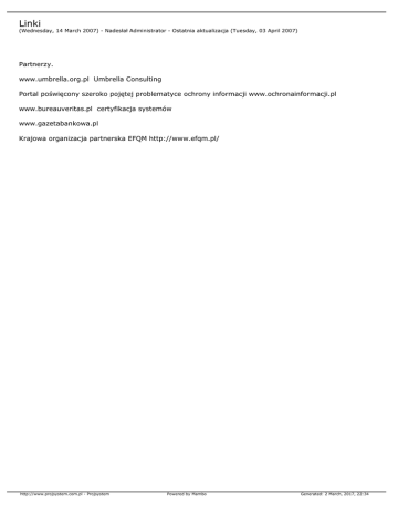 Linki (Wednesday, 14 March 2007) - Nadesłał Administrator - Ostatnia aktualizacja (Tuesday, 03 April 2007) Partnerzy. www.umbrella.org.pl Umbrella Consulting Portal poświęcony szeroko pojętej problematyce ochrony informacji www.ochronainformacji.pl www.bureauveritas.pl certyfikacja systemów www.gazetabankowa.pl Krajowa organizacja partnerska EFQM http://www.efqm.pl/ http://www.projsystem.com.pl - Projsystem Powered by Mambo Generated: 2 March, 2017, 22:34