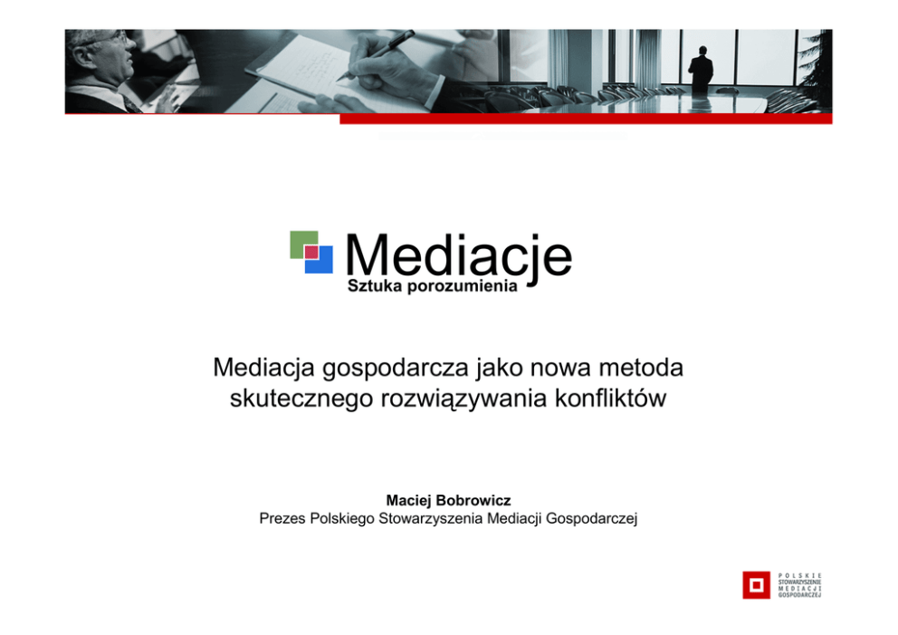 Mediacje Sztuka porozumienia Mediacja gospodarcza jako nowa metoda skutecznego rozwiązywania konfliktów Maciej Bobrowicz Prezes Polskiego Stowarzyszenia Mediacji Gospodarczej Konflikt: WEI JI niebezpieczeństwo szansa 2/18 Historia mediacji: Bernard Thierry: „Makaki” Ho’ oponopono – Hawaje Sulha – Palestyna • Babilon - [ IV w p.n.e.] wyrok akceptowany przez obie strony • Kodeks Hammurabiego - [ 1700 lat p.n.e.]: 228 norm prawnych, pozasądowe rozwiązania arbitraŜowe • Rzym - „Mediator amicabilis” • Średniowiecze - kościół katolicki 3/18 Chiny: Wyrok sądowy = „utrata twarzy” Mediacja w 7-8 mln spraw rocznie (!) - 90% ugód Chiny 5 razy więcej mieszkańców niŜ w USA Ilość adwokatów w Chinach – 5% liczby adwokatów w USA Imigranci z Chin > USA 4/18 USA: Lata 70 - formalne wlączenie mediacji do systemu prawnego 1973 - Stowarzyszenie adwokatów USA – ośrodek mediacji 1980 - Kalifornia: mediacja obligatoryjna w postępowaniach dotyczących opieki nad dzieckiem Lata 80 - początki mediacji gospodarczej Lata 90 - mediator – odrębny zawód 5/18 Cele mediacji*: 1. znalezienie rozwiązania win win 2. dąŜenie do zwarcia porozumienia • ukierunkowanego na przyszłość • dającego się trwale utrzymać 3. uruchomienie wewnętrznego procesu zmiany zachowań osób uczestniczących w konflikcie Manuela Walser* 6/18 Fazy mediacji: 1. faza przedmediacyjna 2. mediacja 2.1 dialog mediatora 2.2 wystąpienia stron 2.3 identyfikacja kwestii negocjacyjnych 2.4 odkrywanie potrzeb 2.5 poszukiwanie rozwiązań 2.6 zawieranie ugody 3. faza pomediacyjna 7/18 Moja korzyść Sytuacja WIN-WIN: KONFLIKT WIN LOSE / WYGRANA PRZEGRANA WIN WIN / WYGRANA WYGRANA LOSE LOSE / PRZEGRANA PRZEGRANA LOSE WIN / PRZEGRANA WYGRANA ROZPRAWA SĄDOWA MEDIACJA Twoja korzyść 8/18 Szansa na sukces: 80% ! 9/18 Dlaczego mediacja się udaje – elementy sukcesu w mediacji 1. profesjonalne umiejętności negocjacyjne 2. kompetencja socjalna 3. emocje w konflikcie 4. odkrycie potrzeb i interesów 10/18 Dlaczego mediacja się udaje – Profesjonalne umiejętności negocjacyjne* Konwencjonalne style negocjacji Negocjacje wg modelu Harvarda 1. Styl negocjacji ukierunkowany na stanowiska 1. Styl negocjacji ukierunkowany na interesy stron 2. Koncentracja na prawa i stanowiska i wcześniej ustalone wyniki 2. Koncentracja na interesy i potrzeby. Strony badają, co kryje się za ich stanowiskami, dlaczego chcą określonego wyniku. 3. Wymiana propozycji i stanowisk, które często są nierealistyczne 3. Strony przedstawiają swoje problemy (kwestie) i interesy i wspólnie je wyjaśniają. 4. Od drugiej strony wymaga się ustępstw i broni z całą mocą własnych stanowisk 4. Wypracowywanie opcji słuŜących wspólnym interesom. Wyznaczenie standardów w celu dokonania oceny. 5. Im bardziej broni się własnej opcji, tym mocniej jest się wobec niej zobowiązany, tym trudniej znaleźć alternatywne rozwiązania 5. Występuje moŜliwość wypracowania rozwiązań korzystnych dla obu stron i ogólnej organizacji 6. Wynik osiąga się poprzez serię walk o władzę, gróźb i ultimatum. Prowadzi to do kontrowersyjnych stosunków. GdyŜ regularnie jedna ze stron lub obie jest zdania, iŜ jest oszukiwana 6. Rozwiązania są wypracowywane wspólnie przez wszystkie strony i przez nie wspierane. Są one bardziej trwałe gdyŜ są mniej naraŜone na przesunięcia dotyczące podziału władzy. Stosunki ulegają poprawie. Manuela Walser* 11/18 Dlaczego mediacja się udaje – Kompetencja socjalna* Intrapersonalna Inteligencja emocjonalna Dostrzeganie własnych emocji + Kompetencja emocjonalna Umiejętność obchodzenia się z własnymi emocjami + Inteligencja socjalna Umiejętność dostrzegania emocji innych osób = EMPATIA + Kompetencja socjalna umiejętność obchodzenia się z emocjami innych osób = PoniewaŜ umiejętności te opierają się na sobie, logicznym pojęciem nadrzędnym staje się „KOMPETENCJA SOCJALNA“ Manuela Walser* 12/18 Dlaczego mediacja się udaje – Emocje w konflikcie Model Glasla Usztywnienie Debata Czyny Koalicje Utrata twarzy Strategie groŜenia Ciosy śmiertelne o ograniczonym działaniu Rozbicie Razem na dno Pomoc własnymi metodami moŜliwa Pomoc z zewnątrz niezbędna moderacja mediacja terapia 13/18 Dlaczego mediacja się udaje – Ukryte potrzeby Płaszczyzna rzeczowa Płaszczyzna rzeczowa* Płaszczyzna stosunków wartości uczucie emocje informacje problemy problemy dot. wzajemnych stosunków a interesy / potrzeby problemy inter- i intrapersonalne problemy z komunikacja Płaszczyzna stosunków Manuela Walser* 14/18 Konflikt: WEI JI niebezpieczeństwo szansa • niesprawiedliwość • konflikt jest wyłącznie negatywny • „konflikt jest niedopuszczalny” • konflikt jest normalnym zjawiskiem • konflikt zakłóca stan idealny / rzeczywisty • konflikty wspomagają zmiany 15/18 National Cash Register/ USA Koszty stosowania ADR 263 spraw sądowych ● 2 mln 1 mln koszty 28 spraw sądowych ● 1984 1993 16/18 RóŜnice są czymś naturalnym Konflikty są czymś oczywistym Wyzwanie: zmienić kulturę rozwiązywania konfliktów 17/18 DZIĘKUJĘ ZA UWAGĘ [email protected] 18/18