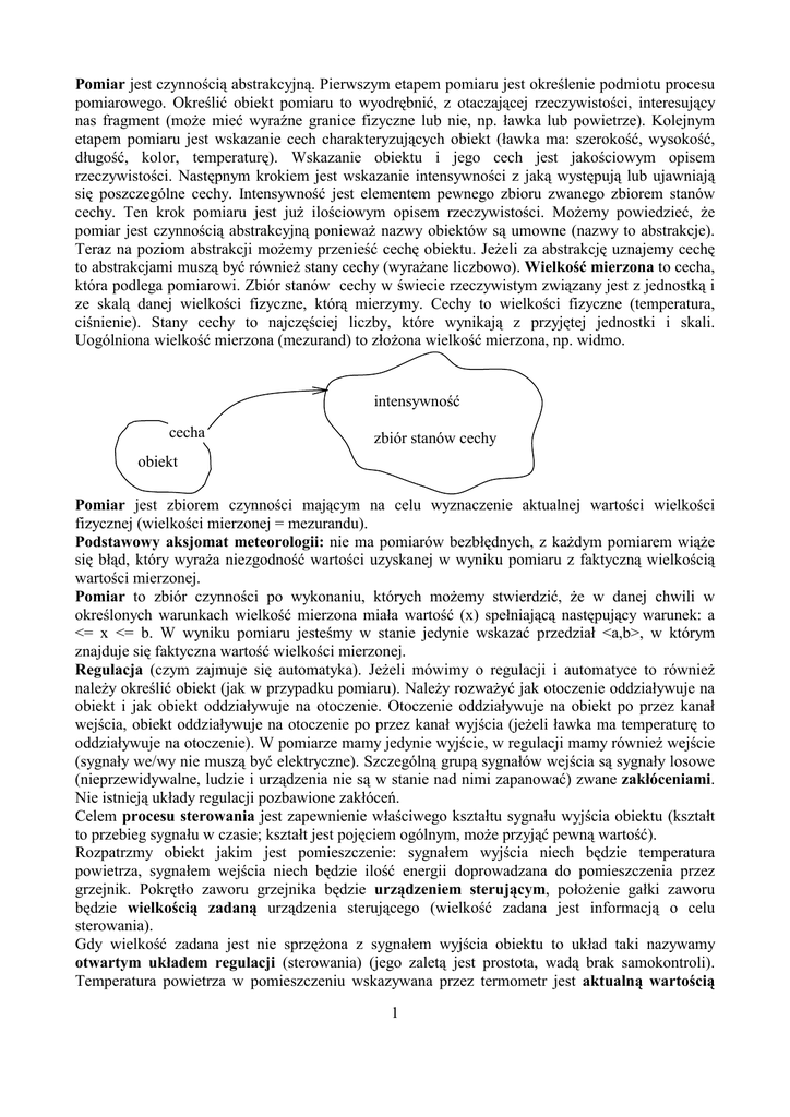 Pomiar jest czynnością abstrakcyjną. Pierwszym etapem pomiaru jest określenie podmiotu procesu pomiarowego. Określić obiekt pomiaru to wyodrębnić, z otaczającej rzeczywistości, interesujący nas fragment (może mieć wyraźne granice fizyczne lub nie, np. ławka lub powietrze). Kolejnym etapem pomiaru jest wskazanie cech charakteryzujących obiekt (ławka ma: szerokość, wysokość, długość, kolor, temperaturę). Wskazanie obiektu i jego cech jest jakościowym opisem rzeczywistości. Następnym krokiem jest wskazanie intensywności z jaką występują lub ujawniają się poszczególne cechy. Intensywność jest elementem pewnego zbioru zwanego zbiorem stanów cechy. Ten krok pomiaru jest już ilościowym opisem rzeczywistości. Możemy powiedzieć, że pomiar jest czynnością abstrakcyjną ponieważ nazwy obiektów są umowne (nazwy to abstrakcje). Teraz na poziom abstrakcji możemy przenieść cechę obiektu. Jeżeli za abstrakcję uznajemy cechę to abstrakcjami muszą być również stany cechy (wyrażane liczbowo). Wielkość mierzona to cecha, która podlega pomiarowi. Zbiór stanów cechy w świecie rzeczywistym związany jest z jednostką i ze skalą danej wielkości fizyczne, którą mierzymy. Cechy to wielkości fizyczne (temperatura, ciśnienie). Stany cechy to najczęściej liczby, które wynikają z przyjętej jednostki i skali. Uogólniona wielkość mierzona (mezurand) to złożona wielkość mierzona, np. widmo. intensywność cecha zbiór stanów cechy obiekt Pomiar jest zbiorem czynności mającym na celu wyznaczenie aktualnej wartości wielkości fizycznej (wielkości mierzonej = mezurandu). Podstawowy aksjomat meteorologii: nie ma pomiarów bezbłędnych, z każdym pomiarem wiąże się błąd, który wyraża niezgodność wartości uzyskanej w wyniku pomiaru z faktyczną wielkością wartości mierzonej. Pomiar to zbiór czynności po wykonaniu, których możemy stwierdzić, że w danej chwili w określonych warunkach wielkość mierzona miała wartość (x) spełniającą następujący warunek: a <= x <= b. W wyniku pomiaru jesteśmy w stanie jedynie wskazać przedział <a,b>, w którym znajduje się faktyczna wartość wielkości mierzonej. Regulacja (czym zajmuje się automatyka). Jeżeli mówimy o regulacji i automatyce to również należy określić obiekt (jak w przypadku pomiaru). Należy rozważyć jak otoczenie oddziaływuje na obiekt i jak obiekt oddziaływuje na otoczenie. Otoczenie oddziaływuje na obiekt po przez kanał wejścia, obiekt oddziaływuje na otoczenie po przez kanał wyjścia (jeżeli ławka ma temperaturę to oddziaływuje na otoczenie). W pomiarze mamy jedynie wyjście, w regulacji mamy również wejście (sygnały we/wy nie muszą być elektryczne). Szczególną grupą sygnałów wejścia są sygnały losowe (nieprzewidywalne, ludzie i urządzenia nie są w stanie nad nimi zapanować) zwane zakłóceniami. Nie istnieją układy regulacji pozbawione zakłóceń. Celem procesu sterowania jest zapewnienie właściwego kształtu sygnału wyjścia obiektu (kształt to przebieg sygnału w czasie; kształt jest pojęciem ogólnym, może przyjąć pewną wartość). Rozpatrzmy obiekt jakim jest pomieszczenie: sygnałem wyjścia niech będzie temperatura powietrza, sygnałem wejścia niech będzie ilość energii doprowadzana do pomieszczenia przez grzejnik. Pokrętło zaworu grzejnika będzie urządzeniem sterującym, położenie gałki zaworu będzie wielkością zadaną urządzenia sterującego (wielkość zadana jest informacją o celu sterowania). Gdy wielkość zadana jest nie sprzężona z sygnałem wyjścia obiektu to układ taki nazywamy otwartym układem regulacji (sterowania) (jego zaletą jest prostota, wadą brak samokontroli). Temperatura powietrza w pomieszczeniu wskazywana przez termometr jest aktualną wartością 1 sygnału wyjściowego. Aby układ podlegał samokontroli należy przekazać przedział wielkości zadanej do urządzenia sterującego. Bodźcem do sterowania układu jest wynik odejmowania: (wielkość wyjścia)–(wielkość zadana). Układ podlegający samokontroli nazywamy zamkniętym układem regulacji (gdy w jego skład wchodzi człowiek to mówimy o ręcznym sterowaniu obiektu). Rolą człowieka jest sprzężenie zwrotne. Istotą sprzężenia zwrotnego jest przekazywanie sygnału wyjścia do urządzenia sterującego. W układzie regulującym mówimy o ujemnym sprzężeniu zwrotnym (bo ma miejsce odejmowanie). Istnieje też dodatnie sprzężenie zwrotne, powoduje ono rozchwianie układu, używane jest do generowania sygnałów, nie nadaje się do sterowania. (rys. układ do sterowania przepływem czynnika grzejnego) (rys. zamknięty układ automatycznej regulacji (bez człowieka ze sprzężeniem zwrotnym) w(t) - wielkość zadana ε(t) - uchybienie regulacji y(t) - sygnał wy. x(t) - sygnał we. ε(t) = w(t) – y(t) (rys. układ do regulacji poziomu cieczy) Układy z jednym sygnałem wejścia i jednym sygnałem wyjścia to układy jednowymiarowe, obiekty jednowymiarowe. POMIAR WIELKOŚCI ELEKTRYCZNYCH. Napięcie. [U] = 1[V] szumy to [mV] 24[V] to maksymalne napięcie uznawane jako bezpieczne dla człowieka. Natężenie. [I] = 1[A] 20[A] to maksymalne natężenie uznawane jako bezpieczne dla człowieka. Stałość napięcia lub natężenia nie oznacza stałej wartości ale stałobiegunowość (prąd płynie w jednym kierunku). Napięcie i natężenie stałe oraz ich wartości skuteczne oznaczamy dużymi literami. W gniazdku sinusoida jest zaśmiecona wyższymi harmonicznymi. Wartości chwilowe prądów i natężeń zmiennych oznaczamy małymi literami. 220[V] w gniazdku to wartość skuteczna napięcia (razy pierwiastek z 2). n a p i ę c i e wartość skuteczna czas 2 Rezystancja (opór). U=I·R [R] = 1[Ω] Pojemność elektryczna i indukcyjność. [C] = 1[F] [L] = 1[H] R, L i C są biernymi obiektami elektrycznymi. Moc. Jeżeli jest napięcie i płynie prąd to układ generuje pewną moc: P=U·I [P