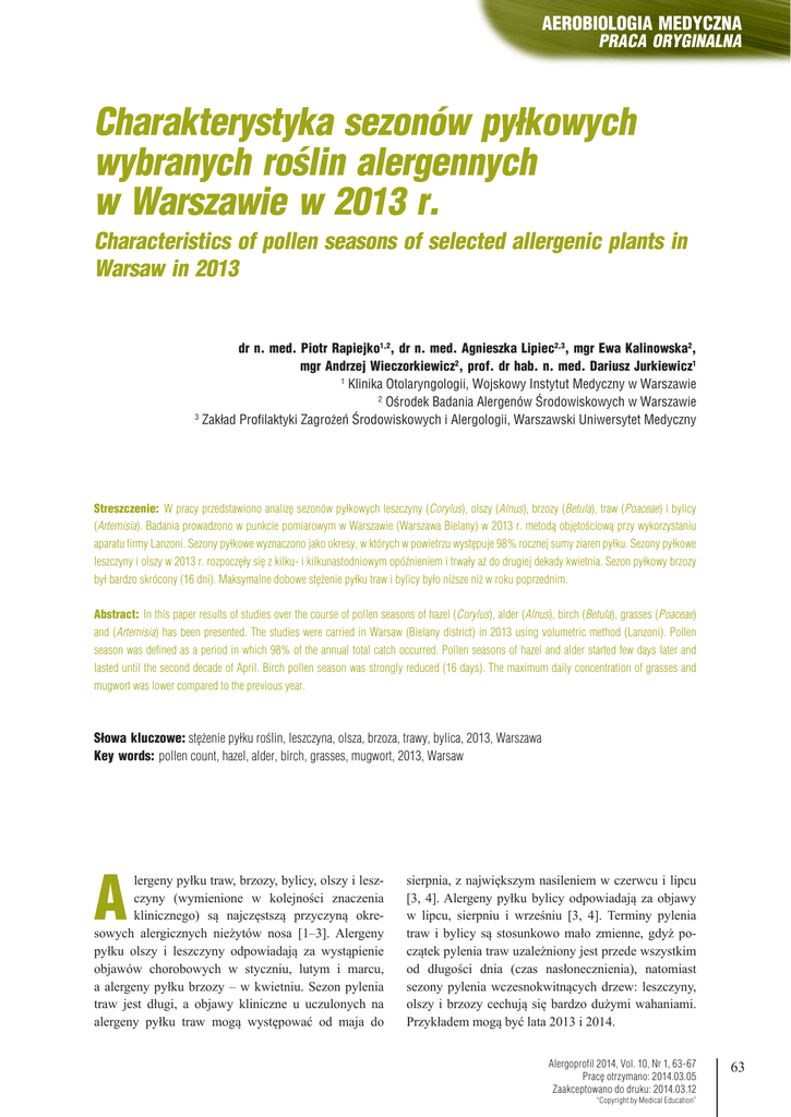 AEROBIOLOGIA MEDYCZNA PRACA ORYGINALNA Charakterystyka sezonów pyłkowych wybranych roślin alergennych w Warszawie w 2013 r. Characteristics of pollen seasons of selected allergenic plants in Warsaw in 2013 dr n. med. Piotr Rapiejko1,2, dr n. med. Agnieszka Lipiec2,3, mgr Ewa Kalinowska2, mgr Andrzej Wieczorkiewicz2, prof. dr hab. n. med. Dariusz Jurkiewicz1 1 Klinika Otolaryngologii, Wojskowy Instytut Medyczny w Warszawie 2 Ośrodek Badania Alergenów Środowiskowych w Warszawie 3 Zakład Profilaktyki Zagrożeń Środowiskowych i Alergologii, Warszawski Uniwersytet Medyczny Streszczenie: W pracy przedstawiono analizę sezonów pyłkowych leszczyny (Corylus), olszy (Alnus), brzozy (Betula), traw (Poaceae) i bylicy (Artemisia). Badania prowadzono w punkcie pomiarowym w Warszawie (Warszawa Bielany) w 2013 r. metodą objętościową przy wykorzystaniu aparatu firmy Lanzoni. Sezony pyłkowe wyznaczono jako okresy, w których w powietrzu występuje 98% rocznej sumy ziaren pyłku. Sezony pyłkowe leszczyny i olszy w 2013 r. rozpoczęły się z kilku- i kilkunastodniowym opóźnieniem i trwały aż do drugiej dekady kwietnia. Sezon pyłkowy brzozy był bardzo skrócony (16 dni). Maksymalne dobowe stężenie pyłku traw i bylicy było niższe niż w roku poprzednim. Abstract: In this paper results of studies over the course of pollen seasons of hazel (Corylus), alder (Alnus), birch (Betula), grasses (Poaceae) and (Artemisia) has been presented. The studies were carried in Warsaw (Bielany district) in 2013 using volumetric method (Lanzoni). Pollen season was defined as a period in which 98% of the annual total catch occurred. Pollen seasons of hazel and alder started few days later and lasted until the second decade of April. Birch pollen season was strongly reduced (16 days). The maximum daily concentration of grasses and mugwort was lower compared to the previous year. Słowa kluczowe: stężenie pyłku roślin, leszczyna, olsza, brzoza, trawy, bylica, 2013, Warszawa Key words: pollen count, hazel, alder, birch, grasses, mugwort, 2013, Warsaw A lergeny pyłku traw, brzozy, bylicy, olszy i leszczyny (wymienione w kolejności znaczenia klinicznego) są najczęstszą przyczyną okresowych alergicznych nieżytów nosa [1–3]. Alergeny pyłku olszy i leszczyny odpowiadają za wystąpienie objawów chorobowych w styczniu, lutym i marcu, a alergeny pyłku brzozy – w kwietniu. Sezon pylenia traw jest długi, a objawy kliniczne u uczulonych na alergeny pyłku traw mogą występować od maja do sierpnia, z największym nasileniem w czerwcu i lipcu [3, 4]. Alergeny pyłku bylicy odpowiadają za objawy w lipcu, sierpniu i wrześniu [3, 4]. Terminy pylenia traw i bylicy są stosunkowo mało zmienne, gdyż początek pylenia traw uzależniony jest przede wszystkim od długości dnia (czas nasłonecznienia), natomiast sezony pylenia wczesnokwitnących drzew: leszczyny, olszy i brzozy cechują się bardzo dużymi wahaniami. Przykładem mogą być lata 2013 i 2014. Alergoprofil 2014, Vol. 10, Nr 1, 63-67 Pracę otrzymano: 2014.03.05 Zaakceptowano do druku: 2014.03.12 “Copyright by Medical Education” 63 AEROBIOLOGIA MEDYCZNA PRACA ORYGINALNA Cel Celem pracy była analiza sezonów pylenia leszczyny, olszy, brzozy, traw i bylicy w Warszawie w roku 2013. Analizie poddano termin rozpoczęcia i zakończenia pylenia, czas trwania sezonu pyłkowego, okres najwyższego stężenia oraz stopień zagrożenia alergenami pyłku analizowanych taksonów. Materiał i metoda Pomiary stężenia pyłku prowadzono od początku stycznia do końca listopada metodą objętościową z zastosowaniem aparatu Lanzoni, pracującego w trybie wolumetrycznym ciągłym. Preparaty mikroskopowe analizowano przy 400-krotnym powiększeniu, po wybarwieniu fuksyną zasadową. Czas trwania sezonu pyłkowego wyznaczono metodą 98%. Za początek sezonu pyłkowego przyjęto dzień, w którym wystąpił 1% sumy rocznej ziaren pyłku, natomiast koniec sezonu wyznaczono przy wartości kumulatywnej wynoszącej 99% sumy rocznej. Wyniki i omówienie Leszczyna Pierwsze ziarna pyłku leszczyny w 2013 r. zarejestrowano w pierwszych dniach marca. Sezon pylenia leszczyny zakończył się w drugiej połowie kwietnia. Najwyższe dobowe stężenie pyłku leszczyny odnotowano w Warszawie 6 marca (42 z/m3). Sezonowy indeks pyłkowy (SPI), czyli roczna suma stężeń dla leszczyny, w 2013 r. wyniósł 445 i był 2-krotnie wyższy niż w 2012 r. [5]. Przebieg sezonu pylenia leszczyny prezentuje rycina 1. Olsza W 2013 r. pyłek olszy pojawił się w Warszawie w pierwszej dekadzie marca (między 4 a 7 marca), czyli kilka dni później niż w 2012 r. [6], i osiągnął stężenie ok. 240–280 z/m3 (ryc. 2). Z uwagi na znaczne ochłodzenie w drugiej dekadzie marca 2013 r. pylenie drzew zostało zahamowane na blisko 4 tygodnie. Szczyt pylenia olszy w Warszawie w 2013 r. przypadł na drugą dekadę kwietnia. Stężenie pyłku olszy przekroczyło wartość progową 85 z/m3 [1] jedynie w siedmiu dniach. Duże różnice w terminach rozpoczęcia pylenia olszy w poszczególnych latach są typowe dla naszego klimatu. Pylenie olszy w minionych latach często rozpoczynało się już w początkach lutego (np. w 2012 i 2014 r.), a szczyt pylenia przypadał zwykle na drugą i trzecią dekadę marca (ryc. 2). Wzrost temperatury w pierwszej dekadzie kwietnia 2013 r. spowodował gwałtowne pylenie olszy. Przebieg drugiego szczytu pylenia był zwarty, a stężenia wyższe niż w średniej wieloletniej. Najwyższe dobowe stężenie pyłku olszy (687 ziaren w 1 m3 powietrza) stwierdzono 14 kwietnia. Indeks SPI obliczony jako suma średnich dobowych stężeń ziaren pyłku olszy w danym sezonie wyniósł 3321. Po 20 kwietnia stężenie pyłku olszy nie przekraczało już wartości progowych niezbędnych do wywołania objawów uczuleniowych [1]. Brzoza Pylenie brzozy rozpoczęło się z tygodniowym opóźnieniem w stosunku do średniej wieloletniej [7, Rycina 1. Stężenie pyłku leszcz