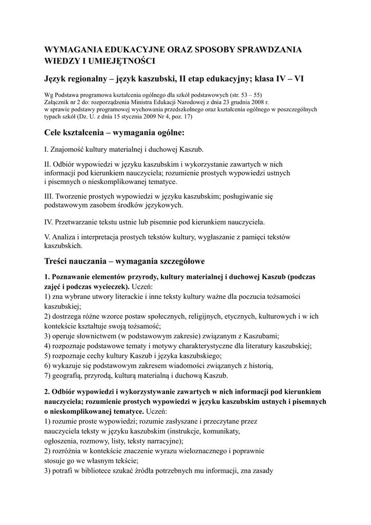 WYMAGANIA EDUKACYJNE ORAZ SPOSOBY SPRAWDZANIA WIEDZY I UMIEJĘTNOŚCI Język regionalny – język kaszubski, II etap edukacyjny; klasa IV – VI Wg Podstawa programowa kształcenia ogólnego dla szkół podstawowych (str. 53 – 55) Załącznik nr 2 do: rozporządzenia Ministra Edukacji Narodowej z dnia 23 grudnia 2008 r. w sprawie podstawy programowej wychowania przedszkolnego oraz kształcenia ogólnego w poszczególnych typach szkół (Dz. U. z dnia 15 stycznia 2009 Nr 4, poz. 17) Cele kształcenia – wymagania ogólne: I. Znajomość kultury materialnej i duchowej Kaszub. II. Odbiór wypowiedzi w języku kaszubskim i wykorzystanie zawartych w nich informacji pod kierunkiem nauczyciela; rozumienie prostych wypowiedzi ustnych i pisemnych o nieskomplikowanej tematyce. III. Tworzenie prostych wypowiedzi w języku kaszubskim; posługiwanie się podstawowym zasobem środków językowych. IV. Przetwarzanie tekstu ustnie lub pisemnie pod kierunkiem nauczyciela. V. Analiza i interpretacja prostych tekstów kultury, wygłaszanie z pamięci tekstów kaszubskich. Treści nauczania – wymagania szczegółowe 1. Poznawanie elementów przyrody, kultury materialnej i duchowej Kaszub (podczas zajęć i podczas wycieczek). Uczeń: 1) zna wybrane utwory literackie i inne teksty kultury ważne dla poczucia tożsamości kaszubskiej; 2) dostrzega różne wzorce postaw społecznych, religijnych, etycznych, kulturowych i w ich kontekście kształtuje swoją tożsamość; 3) operuje słownictwem (w podstawowym zakresie) związanym z Kaszubami; 4) rozpoznaje podstawowe tematy i motywy charakterystyczne dla literatury kaszubskiej; 5) rozpoznaje cechy kultury Kaszub i języka kaszubskiego; 6) wykazuje się podstawowym zakresem wiadomości związanych z historią, 7) geografią, przyrodą, kulturą materialną i duchową Kaszub. 2. Odbiór wypowiedzi i wykorzystywanie zawartych w nich informacji pod kierunkiem nauczyciela; rozumienie prostych wypowiedzi w języku kaszubskim ustnych i pisemnych o nieskomplikowanej tematyce. Uczeń: 1) rozumie proste wypowiedzi; rozumie zasłyszane i przeczytane przez nauczyciela teksty w języku kaszubskim (instrukcje, komunikaty, ogłoszenia, rozmowy, listy, teksty narracyjne); 2) rozróżnia w kontekście znaczenie wyrazu wieloznacznego i poprawnie stosuje go we własnym tekście; 3) potrafi w bibliotece szukać źródła potrzebnych mu informacji, zna zasady korzystania z zasobów bibliotecznych; 4) rozpoznaje typowe rodzaje wypowiedzi i ich intencje; 5) wyszukuje w wypowiedzi potrzebne informacje oraz potrafi zacytować odpowiednie fragmenty tekstu; 6) korzysta ze słowników, zarówno w formie książkowej, jak i elektronicznej; 7) odbiera komunikat przekazany za pomocą środków audiowizualnych. 3. Powtarzanie słów i tworzenie prostych wypowiedzi w języku kaszubskim; posługiwanie się podstawowym zasobem środków językowych. Uczeń: 1) tworzy krótkie i zrozumiałe wypowiedzi w języku kaszubskim; 2) stosuje proste strategie kompensacyjne w przypadku, gdy nie zna lub nie pamięta jakiegoś wyrazu; 3) reaguje zgodnie z intencją mówiącego; 4) uzyskuje i przekazuje proste informacje; 5) posługuje się literacką i potoczną odmianą języka kaszubskiego dotyczącą prostych sytuacji życiowych i tematów poruszanych w czytanych tekstach; 6) tworzy krótkie wypowiedzi pisemne i dostosowuje odmianę i styl wypowiedzi do gatunku, w którym się wypowiada; 7) tworzy plan własnej wypowiedzi; 8) streszcza ustnie prosty utwór; 9) operuje podstawowym słownictwem z kręgów tematycznych: region i Polska, Europa; 10) rozpoznaje i dobiera synonimy dla wyrażenia zamierzonych treści; 11) stosuje w miarę poprawnie formy odmiany części mowy; 12) w miarę możliwości, potrzeb i umiejętności posługuje się edytorami tekstu w języku kaszubskim. 4. Przetwarzanie tekstu ustnie lub pisemnie pod kierunkiem nauczyciela. Uczeń: 1) przekazuje w języku kaszubskim prostą informację usłyszaną lub przeczytaną w innym języku; 2) przekazuje w języku kaszubskim proste informacje zawarte w materiałach wizualnych (wykresach, mapach, symbolach, piktogramach); 3) przekazuje w języku polskim główne myśli lub wybrane informacje z tekstu w języku kaszubskim. 5. Analiza i interpretacja prostych tekstów kultury, wygłaszanie z pamięci kaszubskich tekstów. Uczeń: 1) rozpoznaje i charakteryzuje gatunki literackie omawiane na zajęciach oraz przypisuje do nich konkretne utwory; 2) określa problematykę utworu; 3) charakteryzuje w utworze podmiot liryczny oraz narratora; 4) recytuje wybrane kaszubskie utwory literackie w całości lub we fragmentach; 5) rozpoznaje różne sposoby pokazywania świata przedstawionego: realizm, fantastykę.